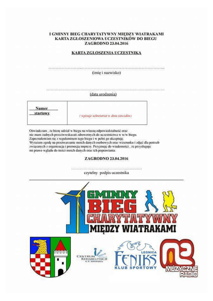 WARUNKI UCZESTNICTWA • • • • • • • • • • Impreza ma charakter otwarty , gdzie prawo startu w wyścigu mają osoby pełnoletnie Dzieci startują na trasie krótkiej , zamkniętej i zabezpieczonym Stadionie Młodzież powyżej 16 roku życia , która chciałaby wystartować na głównym (10 km) dystansie musi mieć ze sobą zgodę rodziców lub startować z opiekunem Wszyscy uczestnicy przed zawodami muszą zostać zweryfikowani w Biurze Zawodów Każdy uczestnik musi Wypełnić Formularz : Kartę Zgłoszeniową Uczestników Biegu (Oświadczenie dostępne do pobrania na naszym Fan Page w REGULAMIN ) Uczestnicy biorą udział w Biegu Charytatywnym na własną odpowiedzialność Organizator nie ubezpiecza Uczestników od następstw nieszczęśliwych wypadków Wskazanym jest ubezpieczenie we własnym zakresie Wniesienie opłaty startowej i prawidłowa rejestracja uczestnika jest równoznaczna z zaakceptowaniem Regulaminu i Startem Biegi Charytatywne odbędą się bez względu na warunki atmosferyczne ZGŁOSZENIA • Zgłoszenia i Rejestrację Zawodników można dokonać na stronie internetowej Klub Sportowy “Feniks“ Legnica : www.feniks-timing.pl • Opłaty startowe : Dorośli – 35PLN , Dzieci – 5PLN należy przekazywać do 17 Kwiecień 2016 roku przelewem na konto z opisem przelewu zawierającym imię i nazwisko uczestnika Tytuł „ BIEG dla JEŻYKA ‘‘ Nazwa Banku : Powiatowy Bank Spółdzielczy w Złotoryja Nr konta: 85 8658 0009 0002 7586 2000 0010 • Po tym terminie zgłoszenia będą możliwe tylko wyłącznie na miejscu • Biuro Zawodów będzie się mieścić na terenie Urzędu Gminy Zagrodno w dniu zawodów (tj. 23.04.2016r.) od godz.: 9:00 do godz.: 10:45 Gdzie startujemy z zapisami chętnych , a każdy uczestnik będzie mógł pobrać i wypełnić swoją Kartę Zgłoszeniową • Uwaga : Depozyt rzeczy osobistych we własnym zakresie (Auto lub znajomy) OPŁATA STARTOWA • Opłaty startowe należy przekazywać przelewem na konto z opisem przelewu zawierającym imię i nazwisko uczestnika. Tytuł „ BIEG dla JEŻYKA „ Nazwa Banku : Powiatowy Bank Spółdzielczy w Złotoryja Nr konta: 85 8658 0009 0002 7586 2000 0010 Podczas Startu należy zgłosić się z potwierdzeniem swojej Wpłaty . Opłaty startowe można będzie również wpłacać w dniu Charytatywnego Biegu w Biurze Zawodów. Opłata startowa nie podlega już zwrotowi. WSZYSTKIE PIENIĄDZE POZYSKANE W FORMIE OPŁAT STARTOWYCH OD UCZESTNIKÓW ZOSTANĄ PRZEKAZANE, JAKO DAROWIZNA NA KONTO FUNDACJI „ JEŻYK ‘’ ŚRODKI TE ZOSTANĄ WYKORZYSTANE DO REALIZACJI CELU CHARYTATYWNEGO i TERAPIĘ SPOŁECZNĄ DLA PODOPIECZNYCH Ze Stowarzyszenia Przyjaciół Domu Dziecka im. J. Wyżykowskiego w Wilkowie Osiedlu Jeżyk. OPŁATY • • Dorośli – 35 PLN • Dzieci – 5 PLN • Dodatkowo podczas biegów będzie dostępny zakup Koszulek termicznych (dla chętnych) PLAN ZAWODÓW • 09.00-10.45 Biuro zawodów przy Urząd Gminy Zagrodno • 10.00 Start biegu dla najmłodszych na zabezpieczonym Stadionie • 11.00 • Bieg dla naszych obecnych chętnych Kobiet 5km • 13.00 Rozdanie Nagród : Medale , Dyplomy , Puchary dla Zwyciężców w swoich Klasyfikacjach • 13.30 poczęstunek dla zawodników wspólny GRILL z kiełbaskami • Spotkanie z uczestnikiem Biegu : Grzegorz Bardowski z programu ,,Rolnik szuka żony" • Występ Wokalno - Taneczny „Stowarzyszenia Jeżyk” • Pokazy OSP Straży Pożarnej w zakresie ratownictwa • Planowane są również Koncerty Zespołów • Całość imprezy poprowadzi Patronat Medialny : Muzyczne Radio Dance Mix Chart z Jelenia Góra - prowadzący - Maciej Wowk • oraz szereg innych atrakcji : Wspólna pamiątkowa fotografia Zapraszamy również innych Fotografów. Szykujemy swoje Aparaty Pokażcie swoją Pasję , Wasze Ciekawe Albumy Prace po zakończeniu Zawodów zostaną opublikowane na stronie Fan Page ! Start biegu głównego na dystansie 10km POMIAR CZASU • • Pomiaru czasu dokona : Klub Sportowy ,,FENIKS" Legnica Każdy zawodnik otrzyma czip i numer startowy , a jego wynik będzie wyświetlony na telebimie Wszyscy uczestnicy biegów otrzymają pamiątkowy Medal Zwyciężcy w swoich kategoriach klasyfikacji generalnych otrzymają : Medale , Puchary , Dyplomy , Wejściówki na Zamek Grodziec Nagrody rzeczowe (niespodzianki) uzależnione są od Sponsorów POSTANOWIENIA KOŃCOWE • Każdy uczestnik bierze udział w zawodach na własną odpowiedzialność i ponosi odpowiedzialność cywilną i prawną za wszystkie szkody wyrządzone przez siebie • Uczestnik wypełniając formularz zgłoszenia oświadcza, że dane w nim zawarte są zgodne z prawdą, że zapoznał się i akceptuje wszystkie warunki regulaminu oraz zapewnia , że stan zdrowia w jakim się znajduje umożliwia mu udział w I Gminnym Biegu Charytatywnym • Organizator może odmówić startu osobie, która w rażący sposób narusza regulamin biegu i swoim zachowaniem zakłóca przebieg całej imprezy a także zdyskwalifikować osobę, u której stwierdzi się skrócenie trasy (przebiegnięcie po innej niż wyznaczona • Uczestnik wyraża zgodę na przetwarzanie danych osobowych przez Organizatora zgodnie z ustawą z dnia 29 sierpnia 1997 r. o ochronie danych osobowych (dz.U.Nr133, poz..883.) • Zawodnik wyraża zgodę, aby zdjęcia, nagrania filmowe oraz wywiady, a także wyniki z jego danymi osobowymi mogły być wykorzystywane przez prasę, radio, TV a także w celach marketingowych organizatora i sponsorów zawodów • Wyniki wyświetlone będą na mecie na telebimie i wydrukowane • Trasę zabezpieczą OSP i wolontariusze • Zabezpieczenie medyczne • W sprawach nieobjętych Regulaminem ostateczne rozstrzygnięcie należy do Organizatora Biegu !!!!
