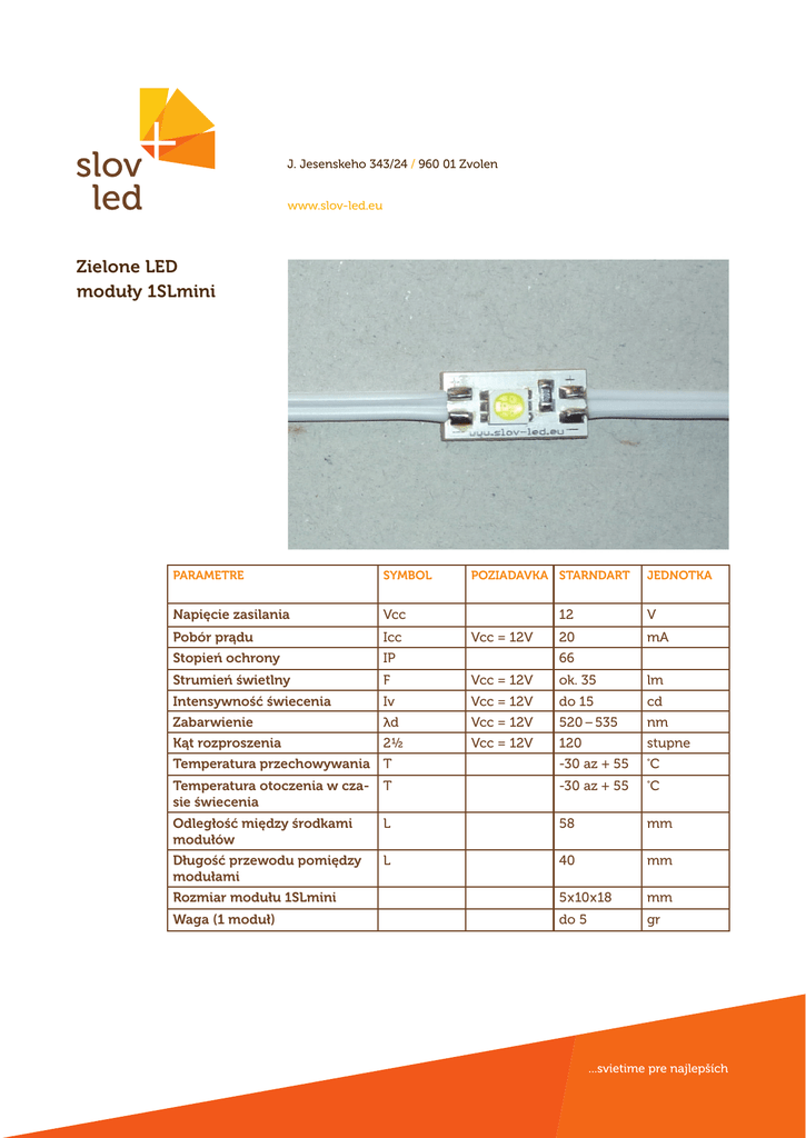J. Jesenskeho 343/24 / 960 01 Zvolen www.slov-led.eu Zielone LED moduły 1SLmini PARAMETRE SYMBOL Napięcie zasilania Vcc Pobór prądu Icc Stopień ochrony IP Strumień świetlny F Vcc = 12V ok. 35 lm Intensywność świecenia Iv Vcc = 12V do 15 cd d Vcc = 12V 520 – 535 nm 2½ Vcc = 12V 120 stupne Temperatura przechowywania T -30 az + 55 ° Temperatura otoczenia w czasie świecenia T -30 az + 55 ° Odległość między środkami modułów L 58 mm Długość przewodu pomiędzy modułami L 40 mm Rozmiar modułu 1SLmini 5 x 10 x 18 mm Waga (1 moduł) do 5 gr Zabarwienie Kąt rozproszenia POZIADAVKA STARNDART Vcc = 12V JEDNOTKA 12 V 20 mA 66 C C ...svietime pre najlepších J. Jesenskeho 343/24 / 960 01 Zvolen www.slov-led.eu Zielone LED moduły 1SLmini - W modułach 1SLmini osadzone są białe diody LED typu SMD 5050 trój-chipowe. Diody te charakteryzują się długą żywotnością oraz bardzo dobrą efektywnością świecenia. - Użyte materiały, wysokiej jakości płytka drukowana spełniająca norme EN 61249–2–5, diody LED osadzane są maszynowo nowoczesną metodą. Moduł dodatkowo zabezpieczony jest UV stabilnym, elastycznym, lakierem silikonowym dedykowanym producentem diód, który gwarantuje długą żywotność modulu i spełnia stopień ochrony IP66. - W celu równomiernego podświetlenia można wybrać moduły z różnym rozstawem diód. Model 3SLEDL3 70 przeznaczony jest do reklam o głębokości od 120mm. Szczególnym rodzajem modułu jest 3SLEDL3 120 z rozstawem diód co 50mm i rozszerzonym rozproszeniem światła. Moduły te można stosować w reklamach o głębokości od 80mm. W celu osiągnięcia równomiernego i wystarczająco intensywnego podświetlenia przy głębokości reklam od 100–110mm wystarczy zastosować jedynie ok. 40–50szt. modułów na m2. - Moduł ten przeznaczony jest do malych reklam świetlnych umieszczonych w środku i na zewnątrz. - Moduły zasilane są zasilaczami niskonapięciowymi ze stabilizowanym wyjściem napięcia 12V. Moduły tę można łączyć z inymi gatunkami modulów serii „L” i „C”. - Można je montować za pomocą taśmy obustronnie klejącej, bądź odpowiedniego kleju, lub mechanicznie uchwicić na przewodach. - Żywotność modułów wynosi min. 50tys. godzin świecenia. Spadek intensywności świecenia jest bardzo powolny, a w standardowych warunkach wynosi do 20% po 20tys. godzin świecenia. - Objęte są 5-letnią gwarancją (lub do 17 500tys. godzin świecenia). ...svietime pre najlepších J. Jesenskeho 343/24 / 960 01 Zvolen www.slov-led.eu Zielone LED moduły 1SLmini zdroj 12V 110 – 230V Zasilacz powinien być umieszczony jak najbliżej modułów-reklamy. W celu lepszego odprowadzenia ciepła z zasilacza zaleca się umieszczenie go na aluminiowej podkładce. Zabronione jest łaczenie zasilaczy pomiędzy sobą. Grubość przewodu musi odpowiadać natężeniu przechodzącego prądu. Przy natężeniu prądu 4A, grubość kabli powinna wynosić min. 1mm2, przy 8A min. 2mm2. Przy zasilaczach o większej mocy bardziej praktyczne jest prowadzenie równoległe zestawu modułów kilku przewodów zasilających. Przy podłączeniu serii modułów z jednej strony ich ilość może wynosić do 40szt. Podłączając serię modułów z dwóch stron, może ich ilość może wynosic do 80szt. ...svietime pre najlepších