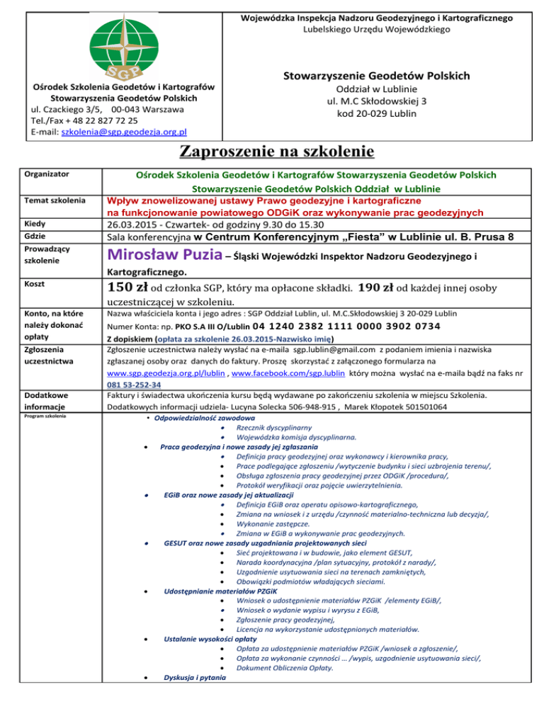 Wojewódzka Inspekcja Nadzoru Geodezyjnego i Kartograficznego Lubelskiego Urzędu Wojewódzkiego Ośrodek Szkolenia Geodetów i Kartografów Stowarzyszenia Geodetów Polskich ul. Czackiego 3/5, 00-043 Warszawa Tel./Fax + 48 22 827 72 25 E-mail: [email protected] Stowarzyszenie Geodetów Polskich Oddział w Lublinie ul. M.C Skłodowskiej 3 kod 20-029 Lublin Zaproszenie na szkolenie Organizator Ośrodek Szkolenia Geodetów i Kartografów Stowarzyszenia Geodetów Polskich Stowarzyszenie Geodetów Polskich Oddział w Lublinie Temat szkolenia Wpływ znowelizowanej ustawy Prawo geodezyjne i kartograficzne na funkcjonowanie powiatowego ODGiK oraz wykonywanie prac geodezyjnych Kiedy Gdzie 26.03.2015 - Czwartek- od godziny 9.30 do 15.30 Sala konferencyjna w Centrum Konferencyjnym „Fiesta” w Lublinie ul. B. Prusa 8 Prowadzący szkolenie Mirosław Puzia – Śląski Wojewódzki Inspektor Nadzoru Geodezyjnego i Kartograficznego. Koszt 150 zł od członka SGP, który ma opłacone składki. 190 zł od każdej innej osoby uczestniczącej w szkoleniu. Konto, na które należy dokonać opłaty Zgłoszenia uczestnictwa Dodatkowe informacje Program szkolenia Nazwa właściciela konta i jego adres : SGP Oddział Lublin, ul. M.C.Skłodowskiej 3 20-029 Lublin Numer Konta: np. PKO S.A III O/Lublin 04 1240 2382 1111 0000 3902 0734 Z dopiskiem (opłata za szkolenie 26.03.2015-Nazwisko imię) Zgłoszenie uczestnictwa należy wysłać na e-maila [email protected] z podaniem imienia i nazwiska zgłaszanej osoby oraz danych do faktury. Proszę skorzystać z załączonego formularza na www.sgp.geodezja.org.pl/lublin , www.facebook.com/sgp.lublin który można wysłać na e-maila bądź na faks nr 081 53-252-34 Faktury i świadectwa ukończenia kursu będą wydawane po zakończeniu szkolenia w miejscu Szkolenia. Dodatkowych informacji udziela- Lucyna Solecka 506-948-915 , Marek Kłopotek 501501064 • Odpowiedzialność zawodowa · Rzecznik dyscyplinarny · Wojewódzka komisja dyscyplinarna. · Praca geodezyjna i nowe zasady jej zgłaszania · Definicja pracy geodezyjnej oraz wykonawcy i kierownika pracy, · Prace podlegające zgłoszeniu /wytyczenie budynku i sieci uzbrojenia terenu/, · Obsługa zgłoszenia pracy geodezyjnej przez ODGiK /procedura/, · Protokół weryfikacji oraz pojęcie uwierzytelnienia. · EGiB oraz nowe zasady jej aktualizacji · Definicja EGiB oraz operatu opisowo-kartograficznego, · Zmiana na wniosek i z urzędu /czynność materialno-techniczna lub decyzja/, · Wykonanie zastępcze. · Zmiana w EGiB a wykonywanie prac geodezyjnych. · GESUT oraz nowe zasady uzgadniania projektowanych sieci · Sieć projektowana i w budowie, jako element GESUT, · Narada koordynacyjna /plan sytuacyjny, protokół z narady/, · Uzgodnienie usytuowania sieci na terenach zamkniętych, · Obowiązki podmiotów władających sieciami. · Udostępnianie materiałów PZGiK · Wniosek o udostępnienie materiałów PZGiK /elementy EGiB/, · Wniosek o wydanie wypisu i wyrysu z EGiB, · Zgłoszenie pracy geodezyjnej, · Licencja na wykorzystanie udostępnionych materiałów. · Ustalanie wysokości opłaty · Opłata za udostępnienie materiałów PZGiK /wniosek a zgłoszenie/, · Opłata za wykonanie czynności … /wypis, uzgodnienie usytuowania sieci/, · Dokument Obliczenia Opłaty. · Dyskusja i pytania