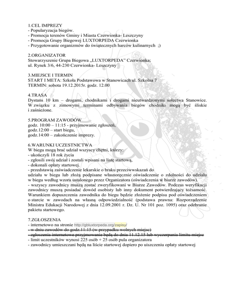 1.CEL IMPREZY - Popularyzacja biegów. - Promocja terenów Gminy i Miasta Czerwionka- Leszczyny - Promocja Grupy Biegowej LUXTORPEDA Czerwionka - Przygotowanie organizmów do świątecznych harców kulinarnych ;) 2.ORGANIZATOR Stowarzyszenie Grupa Biegowa „LUXTORPEDA” Czerwionka; ul. Rynek 3/6, 44-230 Czerwionka- Leszczyny 3.MIEJSCE I TERMIN START I META: Szkoła Podstawowa w Stanowicach ul. Szkolna 7 TERMIN: sobota 19.12.2015r. godz. 12.00 4.TRASA Dystans 10 km – drogami, chodnikami i drogami nieutwardzonymi sołectwa Stanowice. W związku z zimowymi terminami odbywania biegów chodniki mogą być śliskie i zaśnieżone. 5.PROGRAM ZAWODÓW godz. 10:00 – 11:15 - przyjmowanie zgłoszeń, godz.12:00 – start biegu, godz.14:00 – zakończenie imprezy. 6.WARUNKI UCZESTNICTWA W biegu mogą brać udział wszyscy chętni, którzy: - ukończyli 18 rok życia - zgłosili swój udział i zostali wpisani na listę startową, - dokonali opłaty startowej. - przedstawią zaświadczenie lekarskie o braku przeciwwskazań do udziału w biegu lub złożą podpisane własnoręcznie oświadczenie o zdolności do udziału w biegu według wzoru ustalonego przez Organizatora (oświadczenia w biurze zawodów). - wszyscy zawodnicy muszą zostać zweryfikowani w Biurze Zawodów. Podczas weryfikacji zawodnicy muszą posiadać dowód osobisty lub inny dokument potwierdzający tożsamość. Warunkiem dopuszczenia zawodnika do biegu będzie złożenie podpisu pod oświadczeniem o starcie w zawodach na własną odpowiedzialność (podstawa prawna: Rozporządzenie Ministra Edukacji Narodowej z dnia 12.09.2001 r. Dz. U. Nr 101 poz. 1095) oraz odebranie pakietu startowego. 7.ZGŁOSZENIA - internetowo na stronie http://gbluxtorpeda.org/zapisy/ - w dniu zawodów do godz.11:15 (w przypadku wolnych miejsc) - zgłoszenia internetowe przyjmowanie będą do dnia 11.12.15 lub wyczerpania limitu miejsc - limit uczestników wynosi 225 osób + 25 osób pula organizatora - zawodnicy umieszczani będą na liście startowej dopiero po uiszczeniu opłaty startowej 7B.ZGŁOSZENIA DODATKOWE - przyjmowane będą do dnia 27.11.2015 internetowo na stronie http://gbluxtorpeda.org/zapisy/ - w ramach jednego zgłoszenia można zgłosić jedną, bądź dwie osoby - w przypadku zgłoszenia jednej osoby, zgłoszenia te automatycznie będą łączone w grupy 2 osobowe - w ramach zgłoszeń dodatkowych dostępne będzie 50 miejsc (w 25 pakietach po 2 miejsca) - pakiety zostaną udostępnione w formie losowania, które będzie można śledzić na https://www.youtube.com/c/GrupaBiegowaLuxtorpeda/live w Noc Andrzejkową tj. 29.11.2015 o godzinie 20:00 - wyniki losowania zostaną umieszczone również na http://gbluxtorpeda.org/category/biegswiateczny/ oraz na Facebooku - osoby, które wylosowały miejsce w ramach pakietów dodatkowych proszone są o uiszczenie opłaty startowej zgodnie z pkt 8 do dnia 6.12.2015 (Mikołajki) po tym czasie wylosowane miejsce przepada na rzecz osób z listy rezerwowej. 8.ZASADY FINANSOWANIA Opłata startowa wynosi min. 20zł wpłacając ją na konto Stowarzyszenia Grupa Biegowa LUXTORPEDA Czerwionka do dnia 11.12.2015. Wpłacając więcej wspierasz działania GB LUXTORPEDA. W dniu zawodów opłata wynosić będzie 40 zł. Na życzenie uczestnika Stowarzyszenie wystawia rachunek. Prosimy o zgłoszenie chęci otrzymania rachunku najpóźniej w dniu imprezy. Opłat należy dokonywać na konto: Bank BGŻ S.A. 37 2030 0045 1110 0000 0242 8610 Tytułem: Bieg po Moczkę, imię, nazwisko, rok urodzenia Opłata nie podlega zwrotowi. Opłatę można przenieść na inną osobę, chętną do startu w biegu, jedynie do czasu wyczerpania podstawowego limitu miejsc (225 osób). 9.NAGRODY - dla zwycięzców w kategorii mężczyzn i kobiet pamiątkowe puchary oraz dyplomy - dla każdego ręcznie robione medale niespodzianki (chyba, że braknie, ale to już problem dla organizatora jak go rozwiązać) - po biegu wszyscy chętni będą mieli okazję delektować się typowymi śląskim potrawami wigilijnymi czyli moczką i makówką. Dla zainteresowanych dostępne będą przepisy na te smakołyki - po biegu organizator zapewnia ciepłe napoje - wśród uczestników, którzy zdecydują się wystartować w świąteczno/karnawałowych przebraniach organizator wybierze najciekawsze przebranie i uhonoruje nagrodą niespodzianką. - innych nagród organizator nie przewiduje, bo i po co (cztery dni później i tak każdy znajdzie coś pod choinką), jeżeli jakiekolwiek nagrody się pojawią to będą nagrody niespodzianki (również dla organizatora) a o ich rozdziale organizator poinformuje przed biegiem - bieg wchodzi w Grand Prix Czerwionki- Leszczyn w biegach długodystansowych. Po zakończeniu biegu nastąpi dekoracja zwycięzców cyklu. 10.UWAGI KOŃCOWE - bieg rozegrany będzie bez względu na warunki atmosferyczne, - uczestnicy biegu biorą w nim udział na własną odpowiedzialność, - organizator nie ubezpiecza uczestników od następstw nieszczęśliwych wypadków. Kwestia takiego ubezpieczenia leży wyłącznie w gestii uczestników. - bieg odbędzie się przy ograniczonym ruchu drogowym, - pobranie numeru startowego jest jednoznaczne z przyjęciem warunków regulaminu, - ostateczna interpretacja regulaminu należy do organizatora, - organizator zastrzega sobie prawo zmian w regulaminie, - ze względu na świąteczną atmosferę biegu organizator nie przewiduje przyjmowania a tym bardziej rozpatrywania jakichkolwiek protestów. - uczestnik wyrażają zgodę na przetwarzanie swoich danych osobowych do celów statystycznych , a także wizerunku (tj. zdjęcia, nagrania video) do celów marketingowych Stowarzyszenie Grupa Biegowa LUXTORPEDA Czerwionka oraz ich partnerów. - wszelkie informacje umieszczane będą na stronie internetowej: http://gbluxtorpeda.org/category/bieg-swiateczny/ oraz na profilu Facebooku pytania prosimy kierować pod adres: [email protected] SERDECZNIE ZAPRASZAMY !