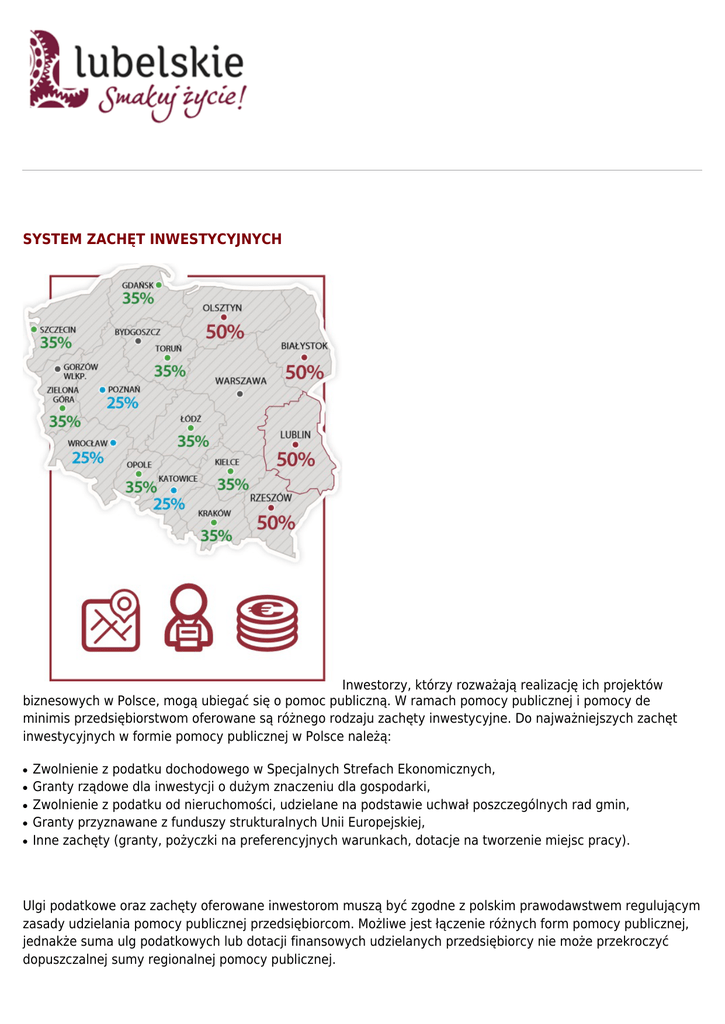 SYSTEM ZACHĘT INWESTYCYJNYCH Inwestorzy, którzy rozważają realizację ich projektów biznesowych w Polsce, mogą ubiegać się o pomoc publiczną. W ramach pomocy publicznej i pomocy de minimis przedsiębiorstwom oferowane są różnego rodzaju zachęty inwestycyjne. Do najważniejszych zachęt inwestycyjnych w formie pomocy publicznej w Polsce należą: ● ● ● ● ● Zwolnienie z podatku dochodowego w Specjalnych Strefach Ekonomicznych, Granty rządowe dla inwestycji o dużym znaczeniu dla gospodarki, Zwolnienie z podatku od nieruchomości, udzielane na podstawie uchwał poszczególnych rad gmin, Granty przyznawane z funduszy strukturalnych Unii Europejskiej, Inne zachęty (granty, pożyczki na preferencyjnych warunkach, dotacje na tworzenie miejsc pracy). Ulgi podatkowe oraz zachęty oferowane inwestorom muszą być zgodne z polskim prawodawstwem regulującym zasady udzielania pomocy publicznej przedsiębiorcom. Możliwe jest łączenie różnych form pomocy publicznej, jednakże suma ulg podatkowych lub dotacji finansowych udzielanych przedsiębiorcy nie może przekroczyć dopuszczalnej sumy regionalnej pomocy publicznej. Zapraszamy do zapoznania się z poszczególnymi formami zachęt inwestycyjnych w regionie. Na kwotę udzielanej pomocy wpływa także regionalna intensywność, czyli maksymalny odsetek kosztów projektu, które mogą zostać pokryte w ramach pomocy. Wskaźnik intensywności pomocy regionalnej dla województwa lubelskiego w latach 2014 – 2020 wynosi 50%. Źródło: Strona internetowa Komisji Europejskiej Drukuj [1] Pobierz PDF [2] Pobierz DOC [3] Źródło: http://www.invest.lubelskie.pl/pl/zachety-i-ulgi Odnośniki [1] http://www.invest.lubelskie.pl/pl/print/451 [2] http://www.invest.lubelskie.pl/pl/printpdf/451 [3] http://www.invest.lubelskie.pl/pl/print/451?type=doc