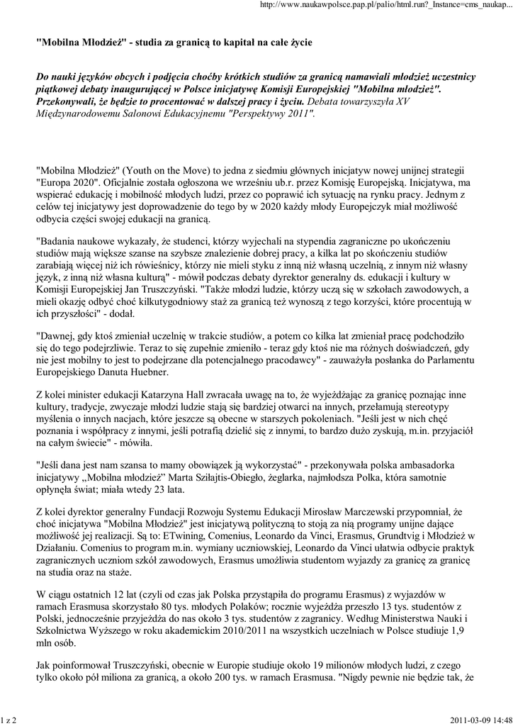 1z2 http://www.naukawpolsce.pap.pl/palio/html.run?_Instance=cms_naukap... "Mobilna MłodzieŜ" - studia za granicą to kapitał na całe Ŝycie Do nauki języków obcych i podjęcia choćby krótkich studiów za granicą namawiali młodzieŜ uczestnicy piątkowej debaty inaugurującej w Polsce inicjatywę Komisji Europejskiej "Mobilna młodzieŜ". Przekonywali, Ŝe będzie to procentować w dalszej pracy i Ŝyciu. Debata towarzyszyła XV Międzynarodowemu Salonowi Edukacyjnemu "Perspektywy 2011". "Mobilna MłodzieŜ" (Youth on the Move) to jedna z siedmiu głównych inicjatyw nowej unijnej strategii "Europa 2020". Oficjalnie została ogłoszona we wrześniu ub.r. przez Komisję Europejską. Inicjatywa, ma wspierać edukację i mobilność młodych ludzi, przez co poprawić ich sytuację na rynku pracy. Jednym z celów tej inicjatywy jest doprowadzenie do tego by w 2020 kaŜdy młody Europejczyk miał moŜliwość odbycia części swojej edukacji na granicą. "Badania naukowe wykazały, Ŝe studenci, którzy wyjechali na stypendia zagraniczne po ukończeniu studiów mają większe szanse na szybsze znalezienie dobrej pracy, a kilka lat po skończeniu studiów zarabiają więcej niŜ ich rówieśnicy, którzy nie mieli styku z inną niŜ własną uczelnią, z innym niŜ własny język, z inną niŜ własna kulturą" - mówił podczas debaty dyrektor generalny ds. edukacji i kultury w Komisji Europejskiej Jan Truszczyński. "TakŜe młodzi ludzie, którzy uczą się w szkołach zawodowych, a mieli okazję odbyć choć kilkutygodniowy staŜ za granicą teŜ wynoszą z tego korzyści, które procentują w ich przyszłości" - dodał. "Dawnej, gdy ktoś zmieniał uczelnię w trakcie studiów, a potem co kilka lat zmieniał pracę podchodziło się do tego podejrzliwie. Teraz to się zupełnie zmieniło - teraz gdy ktoś nie ma róŜnych doświadczeń, gdy nie jest mobilny to jest to podejrzane dla potencjalnego pracodawcy" - zauwaŜyła posłanka do Parlamentu Europejskiego Danuta Huebner. Z kolei minister edukacji Katarzyna Hall zwracała uwagę na to, Ŝe wyjeŜdŜając za granicę poznając inne kultury, tradycje, zwyczaje młodzi ludzie stają się bardziej otwarci na innych, przełamują stereotypy myślenia o innych nacjach, które jeszcze są obecne w starszych pokoleniach. "Jeśli jest w nich chęć poznania i współpracy z innymi, jeśli potrafią dzielić się z innymi, to bardzo duŜo zyskują, m.in. przyjaciół na całym świecie" - mówiła. "Jeśli dana jest nam szansa to mamy obowiązek ją wykorzystać" - przekonywała polska ambasadorka inicjatywy „Mobilna młodzieŜ” Marta Sziłajtis-Obiegło, Ŝeglarka, najmłodsza Polka, która samotnie opłynęła świat; miała wtedy 23 lata. Z kolei dyrektor generalny Fundacji Rozwoju Systemu Edukacji Mirosław Marczewski przypomniał, Ŝe choć inicjatywa "Mobilna MłodzieŜ" jest inicjatywą polityczną to stoją za nią programy unijne dające moŜliwość jej realizacji. Są to: ETwining, Comenius, Leonardo da Vinci, Erasmus, Grundtvig i MłodzieŜ w Działaniu. Comenius to program m.in. wymiany uczniowskiej, Leonardo da Vinci ułatwia odbycie praktyk zagranicznych uczniom szkół zawodowych, Erasmus umoŜliwia studentom wyjazdy za granicę za granicę na studia oraz na staŜe. W ciągu ostatnich 12 lat (czyli od czas jak Polska przystąpiła do programu Erasmus) z wyjazdów w ramach Erasmusa skorzystało 80 tys. młodych Polaków; rocznie wyjeŜdŜa przeszło 13 tys. studentów z Polski, jednocześnie przyjeŜdŜa do nas około 3 tys. studentów z zagranicy. Według Ministerstwa Nauki i Szkolnictwa WyŜszego w roku akademickim 2010/2011 na wszystkich uczelniach w Polsce studiuje 1,9 mln osób. Jak poinformował Truszczyński, obecnie w Europie studiuje około 19 milionów młodych ludzi, z czego tylko około pół miliona za granicą, a około 200 tys. w ramach Erasmusa. "Nigdy pewnie nie będzie tak, Ŝe 2011-03-09 14:48 2z2 http://www.naukawpolsce.pap.pl/palio/html.run?_Instance=cms_naukap... wszyscy studenci wyjadą choć na część studiów za granicę, ale celem naszym jest stworzyć wszystkim szansę na taki wyjazd" - zaznaczył. DSR PAP - Nauka w Polsce ls/bsz Opublikowano: 2011-03-07 00:01 Uwaga! Artykuł pochodzi z portalu internetowego Nauka w Polsce. 2011-03-09 14:48