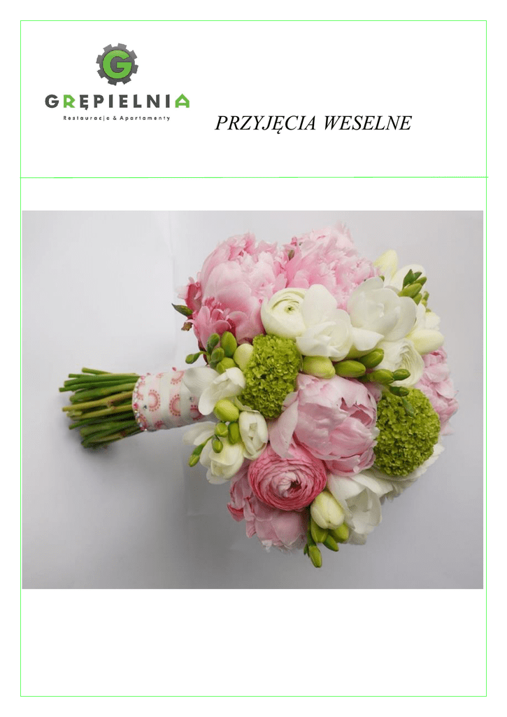 PRZYJĘCIA WESELNE DZIEŃ ŚLUBU Zapraszamy Państwa do Grępielnia Restauracja & Apartamenty. Grępielnia położona jest w centrum Bielska Białej, w miejscu dawnego kompleksu fabryczno – willowego. Miejsce to łączy historię z nowoczesnością. To miejsce idealne dla osób, które w tym wyjątkowym dniu oczekują czegoś więcej niż tylko smacznego jedzenia. Ten szczególny dzień, powinien pozostać w pamięci na całe życie. Na wiele sposobów pomagamy sprawić, aby tak właśnie się stało. Współpracujemy z grupą najlepszych specjalistów w Bielsku Białej i nie tylko, którzy pomagają spełnić, każde życzenie. W śród naszych partnerów znajdują się m.in. jubiler, cukiernie, floryści, fotograf oraz wielu innych znawców branży ślubnej. Wiemy jak ważna na każdym weselu jest oprawa muzyczna. Dlatego współpracujemy z najlepszymi zespołami oraz DJ-ami. Dysponujemy bazą noclegową o oryginalnym i nowoczesnym wystroju, kameralną restauracja, eleganckim lounge barem oraz przestronną i elegancką salą balową. Nasza kadra to przede wszystkim ludzie młodzi, z pasją i zamiłowaniem do organizowania przyjęć okolicznościowych. Każdą parę traktujemy indywidualnie, a co za tym idzie: dostosujemy menu do budżetu i preferencji gości, zorganizujemy nawet najbardziej wymyślne atrakcje. Możemy wzbogacić przyjęcie dodatkowymi atrakcjami: pokaz barmański, pokaz tańca, loty widokowe, sesje zdjęciowe w zabytkowym Fordzie A. SALA BALOWA Do dyspozycji naszych Gości oddajemy salę weselną, w elegancki i niepowtarzalnym klimacie. Możemy ugościć w niej około 120 osób. Z uwagi na wielkość sali, istnieje możliwość podziału Sali, mobilną ścianą. Sala posiada wydzielony parkiet do tańczenia. Wyposażona jest w oddzielną bazę gastronomiczną, co gwarantuje wysoką jakość serwowanych potraw. Sala w pełni klimatyzowana, z niezbędnym zapleczem technicznym. Gwarantujemy najwyższą jakość świadczonych usług. Oferujemy: Dekorację stołów weselnych Apartament dla Nowożeńców Możliwość wynajęcia zabytkowego samochodu marki Ford A Fachową pomoc na każdym etapie realizacji przyjęcia weselnego Propozycja I Staropolskim obyczajem - przywitanie Pary Młodej chlebem i solą Toast winem musującym Zupa: Domowy rosół z makaronem, dodatkami i świeżą natką zielonej pietruszki (podawany w wazach) Danie główne (wieloporcjowo): Rolada wieprzowa z farszem z ogórka kiszonego, boczku i cebuli 100% Pieczeń szpikowana boczkiem i czosnkiem 50% Panierowane koperty drobiowe z pieczarkami, porem i serem górskim 50% Dodatki: Ziemniaki z wody z koperkiem Kluski śląskie (jasne 100%) Sos pieczeniowy Czerwona kapusta (serwowana na zimno) Surówka z białej kapusty z koperkiem i zielonym ogórkiem Surówka z marchwi z jabłkiem Deser: Lody ze świeżymi owocami i bitą śmietaną Kawa, herbata – wg życzenia Zimna płyta: Półmisek wykwintnych mięs pieczonych na zimno (schab w kolorowym pieprzu i ziołach, rolada drobiowa z brokułami, galantyna drobiowa) Półmisek serów twardych i pleśniowych dekorowana orzechami i winogronami z konfiturą żurawinową) Śledź po polsku w śmietanie z jabłkiem i cebulą 50% Śledź w oleju z ogórkiem, czerwoną cebulą i papryką 50% Tymbaliki drobiowe Sałatka wiejska z grillowanym kurczakiem na bazie sałaty lodowej z sosem musztardowo – miodowym Sałatka brokułowa z pomidorem, świeżym ogórkiem i sosem jogurtowym Pieczywo mieszane, masło I kolacja: Udziec wieprzowy podany z ziemniakami w łupinach i kapustą zasmażaną z boczkiem i grzybami leśnymi i dipem chrzanowym (w uroczysty sposób serwowane na środku Sali) II kolacja: Tradycyjny barszcz czerwony z krokietem z farszem mięsnym Pakiet napoje gazowane bez ograniczeń (Coca-cola, Fanta, Sprite, woda gazowana) Koszt: od 159,00 zł brutto/ os Propozycja II Staropolskim obyczajem - przywitanie Pary Młodej chlebem i solą Toast winem musującym Zupa: Minestrone – włoska zupa wielowarzywna z oliwą z suszonych pomidorów (podawany w wazach) Danie główne (wieloporcjowo): Rolada śląska 50% Gordon Bleu – panierowany schab z serem i szynką 50% Rolada z indyka z suszonym pomidorem i serem mozarella owinięta szynką włoską 50% Dramstiki nadziewane pieczarkami 50% Ziemniaki z wody z koperkiem Kluski śląskie (jasne 100%) Ziemniaki opiekane Sos pieczeniowy Sos grzybowy Czerwona kapusta (serwowana na zimno) Surówka Colesław Buraczki glazurowane w miodzie z musztardą francuską Deser: Lody waniliowe na sosie z gorących wiśni z bitą śmietaną Kawa, herbata – wg życzenia Zimna płyta: Półmisek wykwintnych mięs pieczonych na zimno (schab w kolorowym pieprzu i ziołach, rolada drobiowa z brokułami, galantyna drobiowa, karczek szpikowany grzybami) 50% Wyroby swojskie – szynka wiejska, baleron, boczek rolowany, salceson jasny i ciemny, kabanosy, kiełbasa swojska 5 0% Półmisek serów szlachetnych i pleśniowych dekorowana orzechami i winogronami z konfiturą żurawinową) Śledź po polsku w śmietanie z jabłkiem i cebulą Roladki z łososia z wytrawnym musem cytrynowym z dodatkiem kawioru Tymbaliki drobiowe 50% Galaretka wieprzowa z marchewką, jajkiem i groszkiem 50% Sałatka caprese ze świeżą bazylią – pomidory przekładane serem mozarella Sałatka a’lla grecka z sałatą lodową, pomidorem, papryką, czerwoną cebulą i serem feta Sałkatka brokułowa z pomidorem, świeżym ogórkiem i sosem jogurtowym Pieczywo mieszane, masło I kolacja: Fileciki z indyka w sosie paprykowym z ziemniakami opiekanymi i wiosenną sałatka z vinegrette II kolacja: Bogracz z kluseczkami i pieczywem III kolacja: Staropolski żur z białą kiełbasą i ziemniakami Pakiet napoje gazowane bez ograniczeń (Coca-cola, Fanta, Sprite, woda gazowana) Koszt: od 177,00 zł brutto/ os Propozycja III Staropolskim obyczajem - przywitanie Pary Młodej chlebem i solą Toast winem musującym Przystawka: Półgęsek – wędzone plastry piersi z gęsi podan