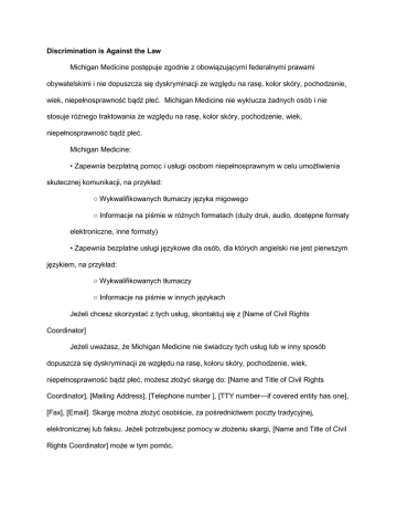 Discrimination is Against the Law Michigan Medicine postępuje zgodnie z obowiązującymi federalnymi prawami obywatelskimi i nie dopuszcza się dyskryminacji ze względu na rasę, kolor skóry, pochodzenie, wiek, niepełnosprawność bądź płeć. Michigan Medicine nie wyklucza żadnych osób i nie stosuje różnego traktowania ze względu na rasę, kolor skóry, pochodzenie, wiek, niepełnosprawność bądź płeć. Michigan Medicine: • Zapewnia bezpłatną pomoc i usługi osobom niepełnosprawnym w celu umożliwienia skutecznej komunikacji, na przykład: ○ Wykwalifikowanych tłumaczy języka migowego ○ Informacje na piśmie w różnych formatach (duży druk, audio, dostępne formaty elektroniczne, inne formaty) • Zapewnia bezpłatne usługi językowe dla osób, dla których angielski nie jest pierwszym językiem, na przykład: ○ Wykwalifikowanych tłumaczy ○ Informacje na piśmie w innych językach Jeżeli chcesz skorzystać z tych usług, skontaktuj się z [Name of Civil Rights Coordinator] Jeżeli uważasz, że Michigan Medicine nie świadczy tych usług lub w inny sposób dopuszcza się dyskryminacji ze względu na rasę, koloru skóry, pochodzenie, wiek, niepełnosprawność bądź płeć, możesz złożyć skargę do: [Name and Title of Civil Rights Coordinator], [Mailing Address], [Telephone number ], [TTY number—if covered entity has one], [Fax], [Email]. Skargę można złożyć osobiście, za pośrednictwem poczty tradycyjnej, elektronicznej lub faksu. Jeżeli potrzebujesz pomocy w złożeniu skargi, [Name and Title of Civil Rights Coordinator] może w tym pomóc. Skargę obywatelską można również złożyć w U.S. Department of Health and Human Services (Departamentu Zdrowia i Opieki Społecznej Stanów Zjednoczonych), Office for Civil Rights (Biuro Praw Obywatelskich), drogą elektroniczną za pośrednictwem Office for Civil Rights Complaint Portal na stronie https://ocrportal.hhs.gov/ocr/portal/lobby.jsf, pocztą tradycyjną lub dzwoniąc pod numer telefonu: U.S. Department of Health and Human Services 200 Independence Avenue, SW Room 509F, HHH Building Washington, D.C. 20201 1-800-368-1019, 800-537-7697 (TDD) Formularze skarg są dostępne na stronie http://www.hhs.gov/ocr/office/file/index.html.