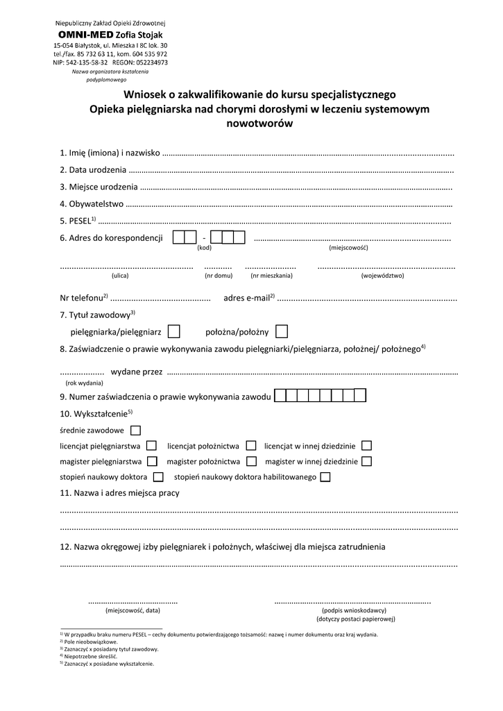 Nazwa organizatora kształcenia podyplomowego Wniosek o zakwalifikowanie do kursu specjalistycznego Opieka pielęgniarska nad chorymi dorosłymi w leczeniu systemowym nowotworów 1. Imię (imiona) i nazwisko ……………………………………………………………………………………………............................. 2. Data urodzenia …………………………………………………………………………………………………………………………………….. 3. Miejsce urodzenia ……………………………………………………………………………………………………………………………….. 4. Obywatelstwo ……………………………………………………………………………………………………………………………………… 5. PESEL1) …………………………………………………………………………………………………………………………………….............. 6. Adres do korespondencji - ………………………………………………................................... (kod) ......................................................... (ulica) (miejscowość) ............ ...................... (nr domu) (nr mieszkania) Nr telefonu2) ........................................... ........................................................... (województwo) adres e-mail2) ............................................................................. 7. Tytuł zawodowy3) pielęgniarka/pielęgniarz położna/położny 8. Zaświadczenie o prawie wykonywania zawodu pielęgniarki/pielęgniarza, położnej/ położnego4) ................... wydane przez ………………………………………………...………………………………….………………………………… (rok wydania) 9. Numer zaświadczenia o prawie wykonywania zawodu 10. Wykształcenie5) średnie zawodowe licencjat pielęgniarstwa licencjat położnictwa licencjat w innej dziedzinie magister pielęgniarstwa magister położnictwa magister w innej dziedzinie stopień naukowy doktora stopień naukowy doktora habilitowanego 11. Nazwa i adres miejsca pracy .......................................................................................................................................................................... .......................................................................................................................................................................... 12. Nazwa okręgowej izby pielęgniarek i położnych, właściwej dla miejsca zatrudnienia ……………………………………….……………………………………………………......................................................................... …………………………………… (miejscowość, data) 1) ………………..…………………………………………….. (podpis wnioskodawcy) (dotyczy postaci papierowej) W przypadku braku numeru PESEL – cechy dokumentu potwierdzającego tożsamość: nazwę i numer dokumentu oraz kraj wydania. Pole nieobowiązkowe. 3) Zaznaczyć x posiadany tytuł zawodowy. 4) Niepotrzebne skreślić. 5) Zaznaczyć x posiadane wykształcenie. 2)