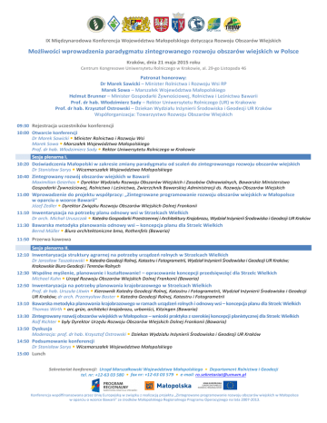 IX Międzynarodowa Konferencja Województwa Małopolskiego dotycząca Rozwoju Obszarów Wiejskich Możliwości wprowadzenia paradygmatu zintegrowanego rozwoju obszarów wiejskich w Polsce Kraków, dnia 21 maja 2015 roku Centrum Kongresowe Uniwersytetu Rolniczego w Krakowie, al. 29-go Listopada 46 Patronat honorowy: Dr Marek Sawicki – Minister Rolnictwa i Rozwoju Wsi RP Marek Sowa – Marszałek Województwa Małopolskiego Helmut Brunner – Minister Gospodarki Żywnościowej, Rolnictwa i Leśnictwa Bawarii Prof. dr hab. Włodzimierz Sady – Rektor Uniwersytetu Rolniczego (UR) w Krakowie Prof. dr hab. Krzysztof Ostrowski – Dziekan Wydziału Inżynierii Środowiska i Geodezji UR Kraków Współorganizacja: Towarzystwo Rozwoju Obszarów Wiejskich 09:30 Rejestracja uczestników konferencji 10:00 Otwarcie konferencji Dr Marek Sawicki Minister Rolnictwa i Rozwoju Wsi Marek Sowa Marszałek Województwa Małopolskiego Prof. dr hab. Włodzimierz Sady Rektor Uniwersytetu Rolniczego w Krakowie Sesja plenarna I. 10:20 Doświadczenia Małopolski w zakresie zmiany paradygmatu od scaleń do zintegrowanego rozwoju obszarów wiejskich Dr Stanisław Sorys Wicemarszałek Województwa Małopolskiego 10:40 Zintegrowany rozwój obszarów wiejskich w Bawarii Maximilian Geierhos Dyrektor Wydziału Rozwoju Obszarów Wiejskich i Zasobów Odnawialnych, Bawarskie Ministerstwo Gospodarki Żywnościowej, Rolnictwa i Leśnictwa, Zwierzchnik Bawarskiej Administracji ds. Rozwoju Obszarów Wiejskich 11:00 Wprowadzenie do projektu współpracy: „Zintegrowane programowanie rozwoju obszarów wiejskich w Małopolsce w oparciu o wzorce Bawarii” Dyrektor Związku Rozwoju Obszarów Wiejskich Dolnej Frankonii 11:10 Inwentaryzacja na potrzeby planu odnowy wsi w Strzelcach Wielkich Dr arch. Michał Uruszczak Katedra Gospodarki Przestrzennej i Architektury Krajobrazu, Wydział Inżynierii Środowiska i Geodezji UR Kraków 11:30 Bawarska metodyka planowania odnowy wsi – koncepcja planu dla Strzelc Wielkich Bernd Müller Biuro architektoniczne bma, Rothenfels (Bawaria) Józef Zedler 11:50 Przerwa kawowa Sesja plenarna II. 12:10 Inwentaryzacja struktury agrarnej na potrzeby urządzeń rolnych w Strzelcach Wielkich Dr Jarosław Taszakowski Katedra Geodezji Rolnej, Katastru i Fotogrametrii, Wydział Inżynierii Środowiska i Geodezji UR Kraków; Krakowskie Biuro Geodezji i Terenów Rolnych 12:30 Wspólne myślenie, planowanie i kształtowanie! – opracowanie koncepcji przedsięwzięć dla Strzelc Wielkich Michael Kuhn Urząd Rozwoju Obszarów Wiejskich Dolnej Frankonii (Bawaria) 12:50 Inwentaryzacja na potrzeby planowania krajobrazowego w Strzelcach Wielkich Prof. dr hab. Urszula Litwin Kierownik Katedry Geodezji Rolnej, Katastru i Fotogrametrii, Wydział Inżynierii Środowiska i Geodezji UR Kraków; dr arch. Przemysław Baster Katedra Geodezji Rolnej, Katastru i Fotogrametrii 13:10 Bawarska metodyka planowania krajobrazowego w ramach urządzeń rolnych i odnowy wsi – koncepcja planu dla Strzelc Wielkich Thomas Wirth arc.grün, architekci krajobrazu, urbaniści, Kitzingen (Bawaria) 13:30 Zintegrowany rozwój obszarów wiejskich w Małopolsce – wnioski praktyka z szerokiej koncepcji planistycznej dla Strzelc Wielkich Rolf Richter były Dyrektor Urzędu Rozwoju Obszarów Wiejskich Dolnej Frankonii (Bawaria) 13:50 Dyskusja Moderacja: prof. dr hab. Krzysztof Ostrowski Dziekan Wydziału Inżynierii Środowiska i Geodezji UR Kraków 14:50 Podsumowanie konferencji Dr Stanisław Sorys Wicemarszałek Województwa Małopolskiego 15:00 Lunch Sekretariat konferencji: Urząd Marszałkowski Województwa Małopolskiego • Departament Rolnictwa i Geodezji tel. nr: +12-63 03 580 • fax nr: +12-63 03 579 • e-mail: [email protected] Konferencja współfinansowana przez Unię Europejską w związku z realizacją projektu „Zintegrowane programowanie rozwoju obszarów wiejskich w Małopolsce w oparciu o wzorce Bawarii” ze środków Małopolskiego Regionalnego Programu Operacyjnego na lata 2007-2013.