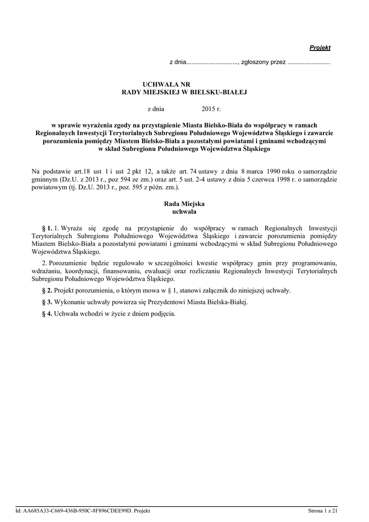 Projekt z dnia.............................., zgłoszony przez ......................... UCHWAŁA NR RADY MIEJSKIEJ W BIELSKU-BIAŁEJ z dnia 2015 r. w sprawie wyrażenia zgody na przystąpienie Miasta Bielsko-Biała do współpracy w ramach Regionalnych Inwestycji Terytorialnych Subregionu Południowego Województwa Śląskiego i zawarcie porozumienia pomiędzy Miastem Bielsko-Biała a pozostałymi powiatami i gminami wchodzącymi w skład Subregionu Południowego Województwa Śląskiego Na podstawie art.18 ust 1 i ust 2 pkt 12, a także art. 74 ustawy z dnia 8 marca 1990 roku o samorządzie gminnym (Dz.U. z 2013 r., poz 594 ze zm.) oraz art. 5 ust. 2-4 ustawy z dnia 5 czerwca 1998 r. o samorządzie powiatowym (tj. Dz.U. 2013 r., poz. 595 z późn. zm.). Rada Miejska uchwala § 1. 1. Wyraża się zgodę na przystąpienie do współpracy w ramach Regionalnych Inwestycji Terytorialnych Subregionu Południowego Województwa Śląskiego i zawarcie porozumienia pomiędzy Miastem Bielsko-Biała a pozostałymi powiatami i gminami wchodzącymi w skład Subregionu Południowego Województwa Śląskiego. 2. Porozumienie będzie regulowało w szczególności kwestie współpracy gmin przy programowaniu, wdrażaniu, koordynacji, finansowaniu, ewaluacji oraz rozliczaniu Regionalnych Inwestycji Terytorialnych Subregionu Południowego Województwa Śląskiego. § 2. Projekt porozumienia, o którym mowa w § 1, stanowi załącznik do niniejszej uchwały. § 3. Wykonanie uchwały powierza się Prezydentowi Miasta Bielska-Białej. § 4. Uchwała wchodzi w życie z dniem podjęcia. Id: AA685A33-C669-436B-950C-8F896CDEE99D. Projekt Strona 1 z 21 Załącznik do Uchwały Nr Rady Miejskiej w Bielsku-Białej z dnia 2015 r. Porozumienie o współpracy w sprawie realizacji Regionalnych Inwestycji Terytorialnych Subregionu Południowego Województwa Śląskiego w ramach Regionalnego Programu Operacyjnego Województwa Śląskiego na lata 2014-2020 zawarte w dniu ………………..2015 r. w Bielsku-Białej pomiędzy Stronami: 1. Miastem Bielsko-Biała z siedzibą w Bielsku-Białej 43-300, Plac Ratuszowy 1 reprezentowanym przez: Jacka Krywulta– Prezydenta Miasta Bielska-Białej zwanym dalej Liderem 2. Powiatem Bielskim z siedzibą w Bielsku-Białej 43-300, przy ulicy Piastowskiej 40 reprezentowanym przez: Andrzeja Płonkę – Starostę Bielskiego Grzegorza Szetyńskiego – Wicestarostę Bielskiego zwanym dalej Partnerem 3. Gminą Bestwina z siedzibą w Bestwinie 43-512, przy ulicy Krakowskiej 111 reprezentowaną przez: Artura Beniowskiego - Wójta Gminy Bestwina zwaną dalej Partnerem 4. Gminą Buczkowice z siedzibą w Buczkowicach 43-374, przy ulicy Lipowskiej 730 reprezentowaną przez: Józefa Caputę – Wójta Gminy Buczkowice zwaną dalej Partnerem 5. Gminą Czechowice-Dziedzice z siedzibą w Czechowicach – Dziedzicach 43-502, przy Placu Jana Pawła II 1 reprezentowaną przez: Mariana Błachuta – Burmistrza Czechowic-Dziedzic zwaną dalej Partnerem 6. Gminą Jasienica z siedzibą w Jasienicy 43-385 nr 159 reprezentowaną przez: Id: AA685A33-C669-436B-950C-8F896CDEE99D. Projekt Strona 2 z 21 Janusza Pierzynę – Wójta Gminy Jasienica zwaną dalej Partnerem 7. Gminą Jaworze z siedziba w Jaworzu 43-384 przy ulicy Zdrojowej 82 reprezentowaną przez: Radosława Ostałkiewicza – Wójta Gminy Jaworze zwaną dalej Partnerem 8. Gminą Kozy z siedzibą w Kozach 43-340, przy ulicy Krakowskiej 4 reprezentowaną przez: Krzysztofa Fiałkowskiego – Wójta Gminy Kozy zwaną dalej Partnerem 9. Gminą Porąbka z siedzibą w Porąbce 43-353 przy ulicy Krakowskiej 3 reprezentowanej przez: Czesława Bułkę – Wójta Gminy Porąbka zwaną dalej Partnerem 10. Miastem Szczyrk z siedzibą w Szczyrku 43-370 przy ulicy Beskidzkiej 4 reprezentowanym przez: Antoniego Byrdy – Burmistrza Miasta Szczyrk zwanym dalej Partnerem 11. Gminą Wilamowice z siedzibą 43 - 330 Wilamowice ul. Rynek 1, reprezentowana przez: Mariana Trelę - Burmistrza Wilamowic zwaną dalej Partnerem 12. Gminą Wilkowice z siedzibą, 43-365 Wilkowice, ul. Wyzwolenia 25 reprezentowaną przez: Mieczysława Rączkę - Wójta Gminy Wilkowice zwaną dalej Partnerem 13. Powiatem Cieszyńskim z siedzibą w Cieszynie 43-400 Cieszyn, przy ulicy Bobreckiej 29 reprezentowanym przez: Janusza Króla – Starostę Cieszyńskiego Marię Cieślar – Wicestarostę Cieszyńskiego zwanym dalej Partnerem 14. Gminą Skoczów Id: AA685A33-C669-436B-950C-8F896CDEE99D. Projekt Strona 3 z 21 z siedzibą w Skoczowie 43-430, Rynek 1 reprezentowaną przez: Mirosława Sitko – Burmistrza Miasta Skoczowa zwaną dalej Partnerem 15. Gminą Zebrzydowice z siedzibą w Zebrzydowicach 43-410, przy ulicy Ks. Antoniego Janusza 6 reprezentowaną przez: Andrzeja Kondziołkę – Wójta Gminy Zebrzydowice zwaną dalej Partnerem 16. Gminą Brenna z siedzibą w Brennej 43-438, przy ulicy Wyzwolenia 77 reprezentowaną przez: Jerzego Pilcha – Wójta Gminy Brenna zwaną dalej Partnerem 17. Gminą Dębowiec z siedzibą w Dębowcu 43-426, przy ulicy Katowickiej 6 reprezentowaną przez: Tomasza Brannego – Wójta Gminy Dębowiec zwaną dalej Partnerem 18. Gminą Wisła z siedzibą w Wiśle 43-460, Plac B. Hoffa 3 reprezentowaną przez: Tomasza Bujoka – Burmistrza Miasta Wisła zwaną dalej Partnerem 19. Gminą Hażlach z siedzibą w Hażlachu 43-419, przy ulicy Głównej 57 reprezentowaną przez: Grzegorza Sikorskiego – Wójta Gminy Hażlach zwaną dalej Partnerem 20. Gminą Chybie z siedzibą w Chybiu 43-520, przy ulicy Bielskiej 78 reprezentowaną przez: Janusza Żydka – Wójta Gminy Chybie zwaną dalej Partnerem 21. Gminą Goleszów z siedzibą w Goleszowie 43-440, przy ulicy 1 Maja 5 reprezentowaną przez: Krzysztofa Józefa Glajcara – Wójta Gminy Goleszów zwaną dalej Partnerem Id: AA685A33-C669-436B-950C-8F896CDEE99D. Projekt Strona 4 z 21 22. Gminą Strumień z siedzibą w Strumieniu 43-246, Rynek 4 reprezentowaną przez: Annę Grygierek – Burmistrza Miasta Strumień zwaną