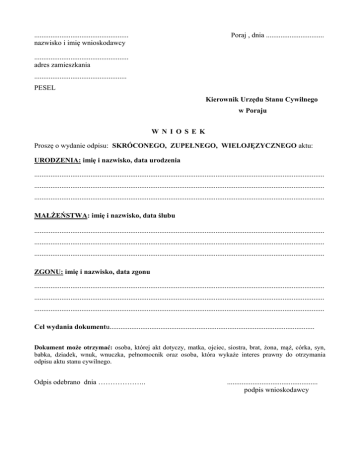 .................................................... nazwisko i imię wnioskodawcy Poraj , dnia ................................ .................................................... adres zamieszkania ................................................... PESEL Kierownik Urzędu Stanu Cywilnego w Poraju W N I O S E K Proszę o wydanie odpisu: SKRÓCONEGO, ZUPEŁNEGO, WIELOJĘZYCZNEGO aktu: URODZENIA: imię i nazwisko, data urodzenia ................................................................................................................................................................ ................................................................................................................................................................ ................................................................................................................................................................ MAŁŻEŃSTWA: imię i nazwisko, data ślubu ................................................................................................................................................................ ................................................................................................................................................................ ................................................................................................................................................................ ZGONU: imię i nazwisko, data zgonu ................................................................................................................................................................ ................................................................................................................................................................ ................................................................................................................................................................ Cel wydania dokumentu................................................................................................................. Dokument może otrzymać: osoba, której akt dotyczy, matka, ojciec, siostra, brat, żona, mąż, córka, syn, babka, dziadek, wnuk, wnuczka, pełnomocnik oraz osoba, która wykaże interes prawny do otrzymania odpisu aktu stanu cywilnego. Odpis odebrano dnia ……………….. .................................................. podpis wnioskodawcy