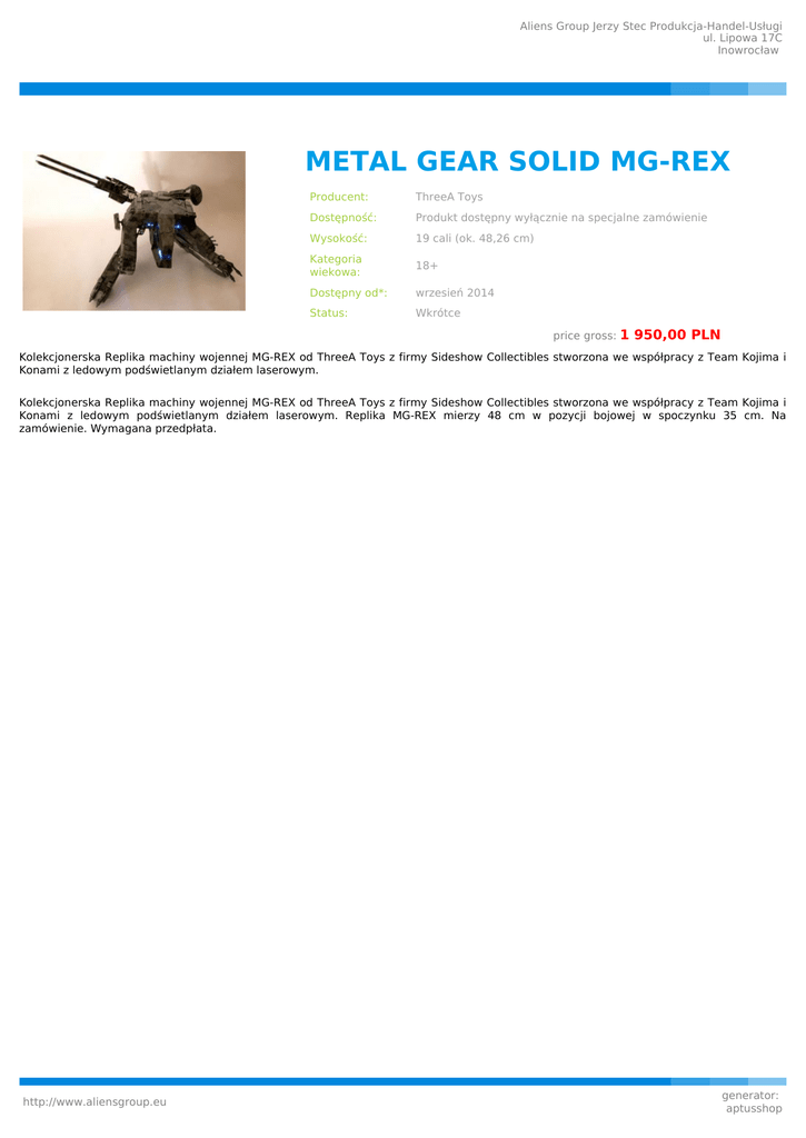 Aliens Group Jerzy Stec Produkcja-Handel-Usługi ul. Lipowa 17C Inowrocław METAL GEAR SOLID MG-REX Producent: ThreeA Toys Dostępność: Produkt dostępny wyłącznie na specjalne zamówienie Wysokość: 19 cali (ok. 48,26 cm) Kategoria wiekowa: 18+ Dostępny od*: wrzesień 2014 Status: Wkrótce price gross: 1 950,00 PLN Kolekcjonerska Replika machiny wojennej MG-REX od ThreeA Toys z firmy Sideshow Collectibles stworzona we współpracy z Team Kojima i Konami z ledowym podświetlanym działem laserowym. Kolekcjonerska Replika machiny wojennej MG-REX od ThreeA Toys z firmy Sideshow Collectibles stworzona we współpracy z Team Kojima i Konami z ledowym podświetlanym działem laserowym. Replika MG-REX mierzy 48 cm w pozycji bojowej w spoczynku 35 cm. Na zamówienie. Wymagana przedpłata. http://www.aliensgroup.eu generator: aptusshop