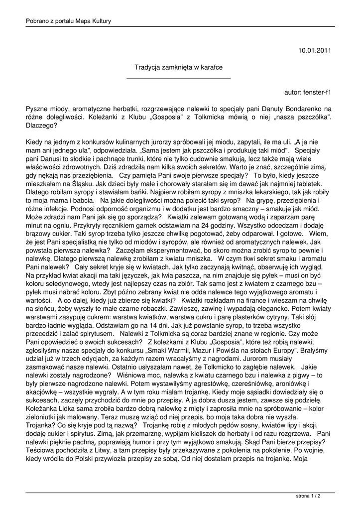 Pobrano z portalu Mapa Kultury 10.01.2011 Tradycja zamknięta w karafce ____________________________ autor: fenster-f1 Pyszne miody, aromatyczne herbatki, rozgrzewające nalewki to specjały pani Danuty Bondarenko na różne dolegliwości. Koleżanki z Klubu „Gosposia” z Tolkmicka mówią o niej „nasza pszczółka”. Dlaczego? Kiedy na jednym z konkursów kulinarnych jurorzy spróbowali jej miodu, zapytali, ile ma uli. „A ja nie mam ani jednego ula”, odpowiedziała. „Sama jestem jak pszczółka i produkuję taki miód”. Specjały pani Danusi to słodkie i pachnące trunki, które nie tylko cudownie smakują, lecz także mają wiele właściwości zdrowotnych. Dziś zdradziła nam kilka swoich sekretów. Warto je znać, szczególnie zimą, gdy nękają nas przeziębienia. Czy pamięta Pani swoje pierwsze specjały? To było, kiedy jeszcze mieszkałam na Śląsku. Jak dzieci były małe i chorowały starałam się im dawać jak najmniej tabletek. Dlatego robiłam syropy i stawiałam bańki. Najpierw robiłam syropy z mniszka lekarskiego, tak jak robiły to moja mama i babcia. Na jakie dolegliwości można polecić taki syrop? Na grypę, przeziębienia i różne infekcje. Podnosi odporność organizmu i w dodatku jest bardzo smaczny – smakuje jak miód. Może zdradzi nam Pani jak się go sporządza? Kwiatki zalewam gotowaną wodą i zaparzam parę minut na ogniu. Przykryty ręcznikiem garnek odstawiam na 24 godziny. Wszystko odcedzam i dodaję brązowy cukier. Taki syrop trzeba tylko jeszcze chwilkę pogotować, żeby odparował. I gotowe. Wiem, że jest Pani specjalistką nie tylko od miodów i syropów, ale również od aromatycznych nalewek. Jak powstała pierwsza nalewka? Zaczęłam eksperymentować, bo skoro można zrobić syrop to pewnie i nalewkę. Dlatego pierwszą nalewkę zrobiłam z kwiatu mniszka. W czym tkwi sekret smaku i aromatu Pani nalewek? Cały sekret kryje się w kwiatach. Jak tylko zaczynają kwitnąć, obserwuję ich wygląd. Na przykład kwiat akacji ma taki języczek, jak lwia paszcza, na nim znajduje się pyłek – musi on być koloru seledynowego, wtedy jest najlepszy czas na zbiór. Tak samo jest z kwiatem z czarnego bzu – pyłek musi nabrać koloru. Zbyt późno zebrany kwiat nie odda nalewce tego wyjątkowego aromatu i wartości. A co dalej, kiedy już zbierze się kwiatki? Kwiatki rozkładam na firance i wieszam na chwilę na słońcu, żeby wyszły te małe czarne robaczki. Zawieszę, zawinę i wypadają elegancko. Potem kwiaty warstwami zasypuję cukrem: warstwa kwiatków, warstwa cukru i parę plasterków cytryny. Taki słój bardzo ładnie wygląda. Odstawiam go na 14 dni. Jak już powstanie syrop, to trzeba wszystko przecedzić i zalać spirytusem. Nalewki z Tolkmicka są coraz bardziej znane w regionie. Czy może Pani opowiedzieć o swoich sukcesach? Z koleżkami z Klubu „Gosposia”, które też robią nalewki, zgłosiłyśmy nasze specjały do konkursu „Smaki Warmii, Mazur i Powiśla na stołach Europy”. Brałyśmy udział już w trzech edycjach, za każdym razem wracałyśmy z nagrodami. Jurorom musiały zasmakować nasze nalewki. Ostatnio usłyszałam nawet, że Tolkmicko to zagłębie nalewek. Jakie nalewki zostały nagrodzone? Wiśniowa moc, nalewka z kwiatu czarnego bzu i nalewka z pigwy – to były pierwsze nagrodzone nalewki. Potem wystawiłyśmy agrestówkę, czereśniówkę, aroniówkę i akacjówkę – wszystkie wygrały. A w tym roku miałam trojankę. Kiedy moje sąsiadki dowiedziały się o sukcesach, zaczęły przychodzić do mnie po przepisy. A ja dobra dusza jestem, zawsze się podzielę. Koleżanka Lidka sama zrobiła bardzo dobrą nalewkę z mięty i zaprosiła mnie na spróbowanie – kolor zieloniutki jak malowany. Teraz muszę wziąć od niej przepis, bo moja taka dobra nie wyszła. Trojanka? Co się kryje pod tą nazwą? Trojankę robię z młodych pędów sosny, kwiatów lipy i akcji, dodaję cukier i spirytus. Zimą, jak przemarznę, wypijam kieliszek do herbaty i od razu rozgrzewa. Pani nalewki pięknie pachną, poprawiają humor i przy tym wyjątkowo smakują. Skąd Pani bierze przepisy? Teściowa pochodziła z Litwy, a tam przepisy były przekazywane z pokolenia na pokolenie. Po wojnie, kiedy wróciła do Polski przywiozła przepisy ze sobą. Od niej dostałam przepis na trojankę. Moja strona 1 / 2 Pobrano z portalu Mapa Kultury trojanka to superlekarstwo na przeziębienia. Akacjówkę sama wymyśliłam. Jak mieszkałam na Śląsku, moja teściowa smażyła dzieciom „placki z ogonkami” – maczała kwiat akcji w cieście naleśnikowym, a z patelni wystawały tylko ogonki. Akacja ma niezwykły aromat, więc spróbowałam zrobić z niej nalewkę. Dziękuję za wywiad. Na zdrowie. Nalewki to coś więcej niż alkohol, kolor, zapach i smak – to wspomnienie lata, dojrzałych, rozgrzanych słońcem wiśni, truskawek i malin. W nalewkach są ukryte zapach łąk i lasów oraz dobroczynna moc ziół często przywracających zdrowie i pogodę ducha. Te smakowite rękodzieła po wielu latach wracają w swoim bogactwie do naszych domów, przypominają nam o tradycji i mądrości naszych przodków. Dajcie się uwieść ich urokowi. strona 2 / 2