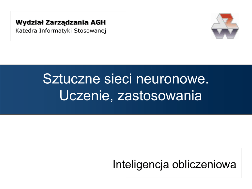 Wydział Zarządzania AGH Katedra Informatyki Stosowanej Sztuczne sieci neuronowe. Uczenie, zastosowania Inteligencja obliczeniowa Sztuczne sieci neuronowe • Metody uczenia • Budowa modelu • Algorytm wstecznej propagacji błędu Inteligencja obliczeniowa • Zastosowania SSN 2 Metody uczenia Uczenie polega na takim wyznaczeniu współczynników wag, by sieć rozwiązywała wyuczone zadanie w sposób automatyczny. Wyróżniamy dwie kategorie: – uczenie nienadzorowane, gdzie sieć samodzielnie próbuje odkryć statystycznie istotne cechy wzorca; w tej metodzie nie ma danego a priori zbioru kategorii, według których mają być klasyfikowane wzorce. Inteligencja obliczeniowa – uczenie nadzorowane (supervised), gdzie dostarcza się wzorce wejściowe i odpowiadające im wyjścia. 3 Metody uczenia Wszystkie metody uczenia są wariantami reguły uczenia Hebba opisanej w Organization of Behaviour (1949). Podstawową ideą jest tu założenie, że jeśli dwa elementy działają zgodnie, ich połączenie musi być wzmocnione. Jeżeli element i otrzymuje wejście od j, to najprostsza wersja reguły Hebba opisuje zmianę wag wij o: wij a oi o j gdzie a jest dodatnią stałą nazywaną stałą uczenia. Inteligencja obliczeniowa • 4 Metody uczenia Inna powszechnie stosowana reguła używa nie aktualnej aktywacji elementu i, lecz różnicy między aktualną a wagi zmieniane są tym silniej, im większy jest błąd pożądaną aktywacją elementu: gdzie di jest pożądaną aktywacją, której wartość jest podawana przez nauczyciela. Reguła ta jest nazywana regułą Widrowa-Hoffa (1960) lub regułą delty. wagi zmieniane są proporcjonalnie do wielkości sygnałów wejściowych Inteligencja obliczeniowa wij a (di oi ) o j 5 Inteligencja obliczeniowa Metody uczenia Graficzna ilustracja procesu uczenia nadzorowanego 6 Metody uczenia Uczenie sieci, to proces minimalizacji błędu kwadratowego: 1 E[ w] (t d o d ) 2 2dD Uczenie jest zbieżne, jeśli: … nie ma nieliniowych zależności między danymi, … stała uczenia a ma małą wartość, … nie ma warstw ukrytych. Inteligencja obliczeniowa D = dane treningowe 7 Budowa modelu Co to znaczy zbudować model ? Input: X1 X2 X3 Output: Y Model: Y = f(X1 X2 X3) W przypadku SSN : matematyczny zapis f(...) jest zbyt skomplikowany. • • • • • liczba neuronów wejściowych, liczba warstw ukrytych, liczba neuronów w warstwach ukrytych, liczba neuronów wyjściowych, wagi wszystkich połączeń. Budowa modelu SSN = określenie wartości powyższych parametrów Ten i sześć następnych slajdów - autor: Angshuman Saha http://www.geocities.com/adotsaha/NNinExcel.html Inteligencja obliczeniowa Jednakże wystarczająco charakteryzują go: 8 Budowa modelu Input: X1 X2 X3 X1 Output: Y X2 X3 Model: Y = f(X1 X2 X3) Parametry Przykład L. neuronów wejściowych 3 -0.1 0.1 0.5 -0.2 L. warstw ukrytych 1 Neurony w warstwie ukr. 2 0.7 L. neuronów wyjściowych 1 0.1 -0.2 Y Wagi Zależą od struktury problemu Liczba neur. wej.= liczba X Liczba neur. wyj. = liczba Y rysunek Inteligencja obliczeniowa 0.6 Wolne parametry 9 X1 =1 Output: Y X2=-1 0.6 -0.1 X3 =2 -0.2 0.1 0.7 0.5 0.2 f (0.2) = 0.55 0.55 0.9 f (0.9) = 0.71 0.71 0.1 Model: Y = f(X1 X2 X3) 0.2 = 0.5 * 1 –0.1*(-1) –0.2 * 2 f(x) = ex / (1 + ex) f(0.2) = e0.2 / (1 + e0.2) = 0.55 Wyliczone Y = 0.478 -0.2 -0.087 f (-0.087) = 0.478 0.478 Jeśli wzorcowe Y = 2, to błąd oszacowania = (2-0.478) =1.522 Inteligencja obliczeniowa Input: X1 X2 X3 Budowa modelu 10 Budowa modelu Input: X1 X2 X3 Output: Y Model: Y = f(X1 X2 X3) L. neuronów wej. = liczba X = 3 L.warstw ukrytych = ??? L.neuronów w warstwie = ??? L. neuronów wyj. = liczba Y = 1 próbuj 1 próbuj 2 Mamy architekturę … Nie ma reguły. Metoda prób i błędów. A co z wagami ??? Dane treningowe: (Yi , X1i, X2i, X3i ) i = 1,2,…,n Dla określonych wag W, otrzymamy oszacowane n wartości Y ( V1,V2,…,Vn) Oczywiście są one funkcją W, czyli ogólna reguła brzmi: Dobierz tak W, by błąd oszacowania E był zminimalizowany Inteligencja obliczeniowa Przy tej architekturze mamy do określenia 8 wartości wag: W = (W1, W2, …, W8) E = (Yi – Vi) 2 i 11 Uczenie sieci Przykład prostej sieci z 2 neuronami wejściowymi i 1 - wyjściowym. E( w1, w2 ) = [ Yi – Vi(w1, w2 ) ] 2 w1 w2 • Para ( w1, w2 ) jest punktem w 2-wymiarowej płaszczyźnie. • Dla każdej takiej pary mamy wartość E. • Funkcja E=f(w1, w2) wyznacza - ‘przestrzeń błędów’ Algorytm hill climbing 1. Zacznij od losowej pary ( w1, w2 ) 2. 3. Przesuń się do pary ( w’1, w’2 ), dla której błąd jest mniejszy. Inteligencja obliczeniowa • Cel: znaleźć taką parę wag, dla której E jest minimalny. Kontynuuj krok 2 aż dojdziesz do pary ( w*1, w*2 ), gdzie E jest minimalny. 12 W2 0.0 Minimum globalne Przestrzeń wag Inteligencja obliczeniowa -3.000 -2.000 -1.000 10.0 0.000 1.000 w* 2.000 4.0 3.000 4.000 w0 5.000 6.000 6.000 5.000 4.000 3.000 2.000 1.000 0.000 -1.000 2.0 -2.000 -3.000 14.0 Uczenie sieci Przestrzeń błędów 12.0 Minimum lokalne 8.0 Error 6.0 W1 13 Uczenie sieci E = (Yi – Vi) 2 1. Zacznij z wylosowanymi wartościami wag. 2. Zaprezentuj sieci pierwszą obserwację X1 -> sieć -> V1 ; Błąd = (Y1 – V1)2 3. Zmodyfikuj wagi tak, by zminimalizować błąd (sieć dopasowuje się do 1. obserwacji) 4. Zaprezentuj sieci kolejną obserwację. Zmodyfikuj wagi tak, by zminimalizować błąd. 5. Powtarzaj krok 3. aż do ostatniej obserwacji. 6. To kończy jeden cykl treningowy. 7. Wykonaj wiele takich cykli (epok), aż E osiągnie małą (minimalną?) wartość. Inteligencja obliczeniowa Feed forward Back Propagation Algorytm wstecznej propagacji błędu Backpropagation Algorithm uogólnienie reguły delty dla złożonych sieci 14 Uczenie sieci Parametry uczenia: Im wyższy współczynnik uczenia tym sieć uczy się szybciej, ale może wpaść w oscylacje • stała uczenia • bezwładność (momentum) w ji (t ) a j (t )oi (t ) w ji (t 1) Pozwala usuną
