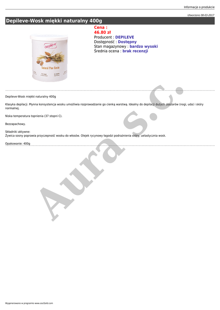 Informacje o produkcie Utworzono 08-03-2017 Depileve-Wosk miękki naturalny 400g Cena : 46.80 zł Depileve-Wosk miękki naturalny 400g s. c. Producent : DEPILEVE Dostępność : Dostępny Stan magazynowy : bardzo wysoki Średnia ocena : brak recenzji Klasyka depilacji. Płynna konsystencja wosku umożliwia rozprowadzanie go cienką warstwą. Idealny do depilacji dużych obszarów (nogi, uda) i skóry normalnej. Niska temperatura topnienia (37 stopni C). Bezzapachowy. Składniki aktywne: Żywica sosny poprawia przyczepność wosku do włosów. Olejek rycynowy łagodzi podrażnienia skóry, uelastycznia wosk. Au r a Opakowanie: 400g Wygenerowano w programie www.oscGold.com