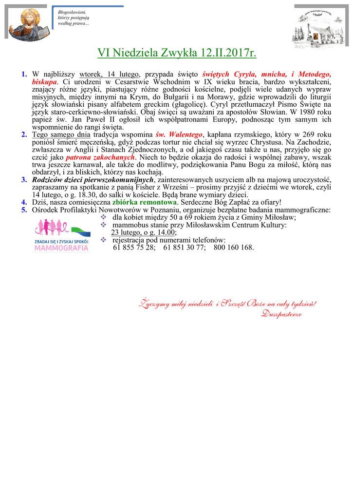 Błogosławieni, którzy postępują według prawa… VI Niedziela Zwykła 12.II.2017r. 1. W najbliższy wtorek, 14 lutego, przypada święto świętych Cyryla, mnicha, i Metodego, biskupa. Ci urodzeni w Cesarstwie Wschodnim w IX wieku bracia, bardzo wykształceni, znający różne języki, piastujący różne godności kościelne, podjęli wiele udanych wypraw misyjnych, między innymi na Krym, do Bułgarii i na Morawy, gdzie wprowadzili do liturgii język słowiański pisany alfabetem greckim (głagolicę). Cyryl przetłumaczył Pismo Święte na język staro-cerkiewno-słowiański. Obaj święci są uważani za apostołów Słowian. W 1980 roku papież św. Jan Paweł II ogłosił ich współpatronami Europy, podnosząc tym samym ich wspomnienie do rangi święta. 2. Tego samego dnia tradycja wspomina św. Walentego, kapłana rzymskiego, który w 269 roku poniósł śmierć męczeńską, gdyż podczas tortur nie chciał się wyrzec Chrystusa. Na Zachodzie, zwłaszcza w Anglii i Stanach Zjednoczonych, a od jakiegoś czasu także u nas, przyjęło się go czcić jako patrona zakochanych. Niech to będzie okazja do radości i wspólnej zabawy, wszak trwa jeszcze karnawał, ale także do modlitwy, podziękowania Panu Bogu za miłość, którą nas obdarzył, i za bliskich, którzy nas kochają. 3. Rodziców dzieci pierwszokomunijnych, zainteresowanych uszyciem alb na majową uroczystość, zapraszamy na spotkanie z panią Fisher z Wrześni – prosimy przyjść z dziećmi we wtorek, czyli 14 lutego, o g. 18.30, do salki w kościele. Będą brane wymiary dzieci. 4. Dziś, nasza comiesięczna zbiórka remontowa. Serdeczne Bóg Zapłać za ofiary! 5. Ośrodek Profilaktyki Nowotworów w Poznaniu, organizuje bezpłatne badania mammograficzne: dla kobiet między 50 a 69 rokiem życia z Gminy Miłosław; mammobus stanie przy Miłosławskim Centrum Kultury: 23 lutego, o g. 14.00; rejestracja pod numerami telefonów: 61 855 75 28; 61 851 30 77; 800 160 168. Życzymy miłej niedzieli i Szczęść Boże na cały tydzień! Duszpasterze Intencje Mszalne 12.II. – 19.II.2017r. VI Niedziela Zwykła 12 lutego Poniedziałek 7.30 †Helena Janiszewska - od syna Krzysztofa z Żoną 9.30 †Antoni, Lucyna i Aleksander Ostojscy, Maria, Stanisława, Franciszek Wojciechowscy 10.45 †Janina Matuszewska - od córki Anety z Rodziną 12.00 †Zofia – 18 rocz. śm. i Stefan Kosmowscy oraz Teresa i Ryszard Grześkowiak 17.00 †Irena Gogolkiewicz - od córki Renaty z Mężem 17.00 †Tomasz Czerniak - od rodzin Świtów, Andrzejewskich i Nowaków 13 lutego Wtorek 14 lutego Środa 17.00 †Tomasz Czerniak - od rodzin Klarów i Talarczyków z Orzechowa oraz Teresy i Bronisława Strugałów z Wrześni †Zygmunt Zakrzewicz - od Mirosławy Nowak i Anny Surdyk z Mężem i Dziećmi †Józef Nowak - od Czesławy Zięty z Rodziną †Marianna Banaszak - od wnuków: Justyny, Doroty i Szymona z Rodzinami †Elżbieta Owieśniak - od Leszka 17.00 †Joanna i Stanisław Lewandowscy oraz Henryk Jędraszak 15 lutego Czwartek 16 luty Pięczkowo Piątek 17 lutego Sobota 18 lutego VII Niedziela Zwykła 19 lutego 17.00 †Danuta i Ryszard Szymańscy 18.00 †Maria Pietrzak - od Węcławiaków z Orzechowa i Zofii Zawitaj z Pięczkowa †Feliks Wawrzyniak - od Tomasza z Żoną i Synami †Krystyna Miśkiewicz - od córki Beaty z Mężem i Córkami †Czesław Krajewski - od żony Czesławy †Tadeusz Waligóra - od Żony z córką Gosią, Sławkiem i wnuczką Oliwią 17.00 †Helena Pisarczyk – z okazji urodzin - od Pracowników Sklepu Spożywczego w Orzechowie 17.00 †Helena Dzieciuchowicz - od rodziny Budaszów i Węcławiaków 15.00 Msza Św. chrzcielna 17.00 †Joanna i Feliks Klameccy, Kazimiera i Stanisław Mikołajczak oraz Zmarli z Rodziny 7.30 Za Parafian 9.30 †Antonina i Józef Kopczyńscy oraz Władysława, Stanisław i Zdzisław Łach 10.45 †Stanisław Majsnerowski – 2 rocz. śm. oraz Zmarli z rodziny Majsnerowskich 12.00 †Roman Nather (I) - od żony Małgorzaty 17.00 †Antonina i Franciszek Strugała, Krystyna i Władysław Szalewscy