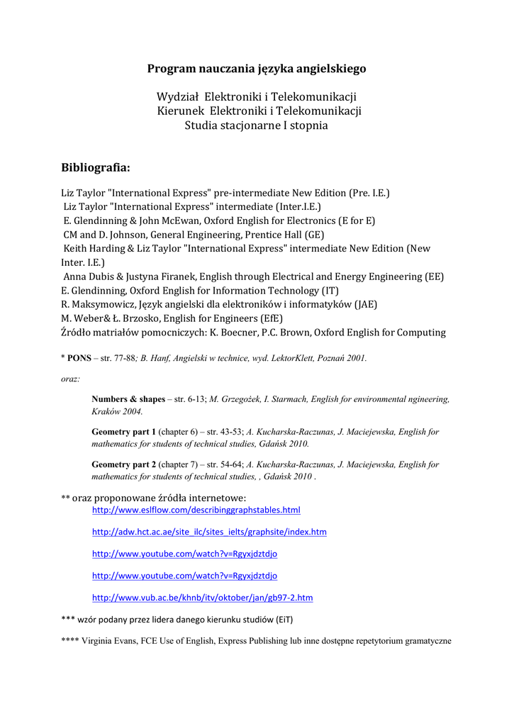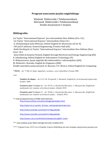 Program nauczania języka angielskiego Wydział Elektroniki i Telekomunikacji Kierunek Elektroniki i Telekomunikacji Studia stacjonarne I stopnia Bibliografia: Liz Taylor "International Express" pre-intermediate New Edition (Pre. I.E.) Liz Taylor "International Express" intermediate (Inter.I.E.) E. Glendinning & John McEwan, Oxford English for Electronics (E for E) CM and D. Johnson, General Engineering, Prentice Hall (GE) Keith Harding & Liz Taylor "International Express" intermediate New Edition (New Inter. I.E.) Anna Dubis & Justyna Firanek, English through Electrical and Energy Engineering (EE) E. Glendinning, Oxford English for Information Technology (IT) R. Maksymowicz, Język angielski dla elektroników i informatyków (JAE) M. Weber& Ł. Brzosko, English for Engineers (EfE) Źródło matriałów pomocniczych: K. Boecner, P.C. Brown, Oxford English for Computing * PONS – str. 77-88; B. Hanf, Angielski w technice, wyd. LektorKlett, Poznań 2001. oraz: Numbers & shapes – str. 6-13; M. Grzegożek, I. Starmach, English for environmental ngineering, Kraków 2004. Geometry part 1 (chapter 6) – str. 43-53; A. Kucharska-Raczunas, J. Maciejewska, English for mathematics for students of technical studies, Gdańsk 2010. Geometry part 2 (chapter 7) – str. 54-64; A. Kucharska-Raczunas, J. Maciejewska, English for mathematics for students of technical studies, , Gdańsk 2010 . ** oraz proponowane źródła internetowe: http://www.eslflow.com/describinggraphstables.html http://adw.hct.ac.ae/site_ilc/sites_ielts/graphsite/index.htm http://www.youtube.com/watch?v=Rgyxjdztdjo http://www.youtube.com/watch?v=Rgyxjdztdjo http://www.vub.ac.be/khnb/itv/oktober/jan/gb97-2.htm *** wzór podany przez lidera danego kierunku studiów (EiT) **** Virginia Evans, FCE Use of English, Express Publishing lub inne dostępne repetytorium gramatyczne I semestr Zagadnienia 1. Maths 2. Describing graphs Materiały 8. Batteries 9. Remote Control 10. HD Television 11. GPS 12. Oral Examination Topics PONS* Inter Express Pre-I.E U-7 oraz Inter. I.E. Unit 4** EE Chapter 1 E for E Appendix 2, E for E Unit 1 GE Unit 9 Inter.I.E. Unit 6 Video CD (library): Effective Presentations E for E Unit 5 E for E Unit 8 E for E Unit 20 EfE Part 3 Topics 1-7 (biblioteka) 13. writing letter of complaint (materiały biblioteczne) 3. The Phenomenon of Electricity 4. Circuit Symbols, Describing Block Diagrams and Circuits 5. Computer History 6. Talks and Presentations 7. Effective Presentations Liczba godzin 60 Uwagi Liczba godzin Uwagi 14. Presentations given by students Optional: Rechargeable Battery II semestr Zagadnienia 1. artykuł techniczny 2. Analogue and Digital Signals. Sampling 3. Digital Electronics 4. Alarm Systems 5. Radio 6. Telecommunications 7. Cellphones 8. Computers, Combinational Logic 9. Guided writing 10. Grammar (“zadawanie pytań”) 11. Oral Examination Topics 12. Presentations given by students Optional: Mobile Phone Optional: Integrated Circuit JAE Unit 8 Materiały Wskazany przez lidera kierunku z wybranego czasopisma lub magazynu naukowego (Focus, etc.) GE Unit 9, E for E Unit 15 JAE Unit 19 E for E Unit 9 E for E Unit 10 E for E Unit 26 E for E Unit 27 E for E Unit 23 Wg tekstu modelowego*** FCE Use of English**** Topics 8-15 (biblioteka) JAE Unit 22 JAE Unit 10