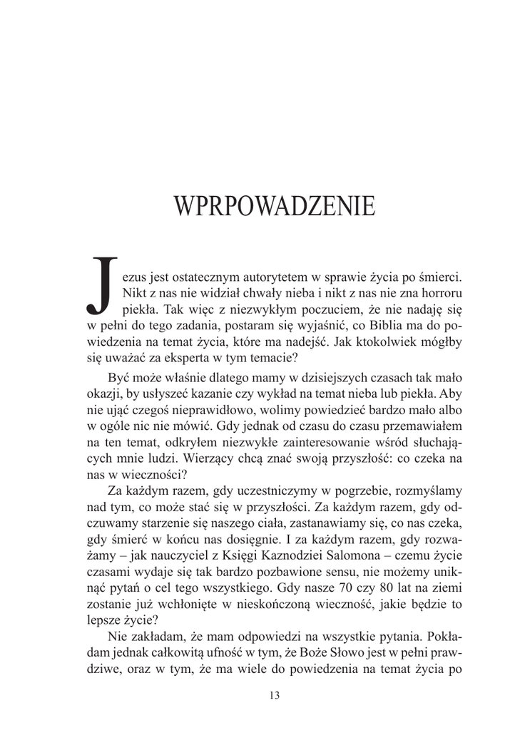 WPRPOWADZENIE J ezus jest ostatecznym autorytetem w sprawie życia po śmierci. Nikt z nas nie widział chwały nieba i nikt z nas nie zna horroru piekła. Tak więc z niezwykłym poczuciem, że nie nadaję się w pełni do tego zadania, postaram się wyjaśnić, co Biblia ma do powiedzenia na temat życia, które ma nadejść. Jak ktokolwiek mógłby się uważać za eksperta w tym temacie? Być może właśnie dlatego mamy w dzisiejszych czasach tak mało okazji, by usłyszeć kazanie czy wykład na temat nieba lub piekła. Aby nie ująć czegoś nieprawidłowo, wolimy powiedzieć bardzo mało albo w ogóle nic nie mówić. Gdy jednak od czasu do czasu przemawiałem na ten temat, odkryłem niezwykłe zainteresowanie wśród słuchających mnie ludzi. Wierzący chcą znać swoją przyszłość: co czeka na nas w wieczności? Za każdym razem, gdy uczestniczymy w pogrzebie, rozmyślamy nad tym, co może stać się w przyszłości. Za każdym razem, gdy odczuwamy starzenie się naszego ciała, zastanawiamy się, co nas czeka, gdy śmierć w końcu nas dosięgnie. I za każdym razem, gdy rozważamy – jak nauczyciel z Księgi Kaznodziei Salomona – czemu życie czasami wydaje się tak bardzo pozbawione sensu, nie możemy uniknąć pytań o cel tego wszystkiego. Gdy nasze 70 czy 80 lat na ziemi zostanie już wchłonięte w nieskończoną wieczność, jakie będzie to lepsze życie? Nie zakładam, że mam odpowiedzi na wszystkie pytania. Pokładam jednak całkowitą ufność w tym, że Boże Słowo jest w pełni prawdziwe, oraz w tym, że ma wiele do powiedzenia na temat życia po 13 14 Życie po życiu śmierci. Możemy czasami źle zrozumieć to, co mówi do nas Pismo, ale nawet biorąc pod uwagę nasze ludzkie ograniczenia, jesteśmy w stanie zgromadzić wiele informacji dzięki uważnemu studium. Głupotą byłoby dogmatyzowanie naszych wniosków, ale jeszcze większą – zaniechanie poszukiwań. Książka ta będzie moją próbą prześledzenia tego, co Biblia mówi na temat nieba i piekła. Nie będę się starał dotrzeć do wszystkiego, co zostało w tej kwestii powiedziane. Całkowity brak przypisów w większości tekstu książki bez wątpienia będzie irytować niektórych czytelników. Uznałem jednak, że lepiej będzie skupić się na tym, co ma do powiedzenia samo Pismo i przekazać skumulowane informacje na ten temat. Modlę się, żeby ta skoncentrowana na niebie podróż przez Pismo okazała się pożyteczna. Ponieważ to Jezus ma ostatnie słowo na temat nieba, zdecydowałem się zacząć tę książkę od tego, czego nauczał On w Ewangelii Jana 14,13. Zdanie po zdaniu Jego słowa ustalą ton reszty naszego studium. Później zbadamy całe Pismo, zaczynając od 1 Księgi Mojżeszowej, żeby zobaczyć, w jak niezwykły sposób będzie się rozwijać prawda dotycząca nieba. Karty Starego Testamentu odsłaniają radość nieba powoli, jakby przesuwając się od światła gwiazd, przez świt, aż do pełnego blasku dnia. Tak samo informacje dotyczące piekła są początkowo skromne, ale w Nowym Testamencie w pełni dostrzegamy ich straszliwość. Na każdym kroku będziemy się starali podążać za przykładem Berejczyków, którzy „codziennie badali Pisma, czy tak się rzeczy mają” (Dz 17,11). Książka ta ma być przewodnikiem zachęcającym do uważnego studiowania Biblii. Nie ma na celu przedstawienia czytelnikowi listy przyjętych z góry założeń, które sprawią, że studiowanie Biblii stanie się niepotrzebne. Nie ma to też być podręcznik do teologii systematycznej czy eschatologii. Oto nasza metoda: zlokalizować teksty dotyczące życia po śmierci, a następnie omówić je, biorąc pod uwagę ich kontekst. Oto nasz cel: odkrycie biblijnego nauczania na temat życia po śmierci. Niebo – nasz ostateczny dom – będzie wspaniałym miejscem. Piekło – miejsce, którego należy uniknąć za wszelką cenę – będzie wieczną grozą. Nasze studium, nawet jeśli nie miałoby się przydać do niczego innego, może służyć jako zachęta, by dążyć do pierwszego z tych miejsc i uciekać przed tym drugim. Moją modlitwą jest, byście dzięki tej książce „bardziej dołożyli starań, aby swoje powołanie i wybranie umocnić” (2 P 1,10).