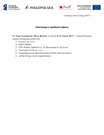 Kraków, dnia 2 lutego 2017 r. Informacja o wynikach naboru Na Targi Turystyczne ITB w Berlinie w dniach 8-12 marca 2017 r. zakwalifikowane zostały następujące podmioty: 1. Ivotrans sp. z.o.o. 2. PAVO TRAVEL 3. TOP TRAVEL SERVICE s.c. B. Marchewka K. Szczurek 4. Thermaleo PLUS sp. z.o.o. 5. Przedsiębiorstwo Wielobranżowe ALPOL Andrzej Lepiarz 6. Jordan Group Jacek Legendziewicz