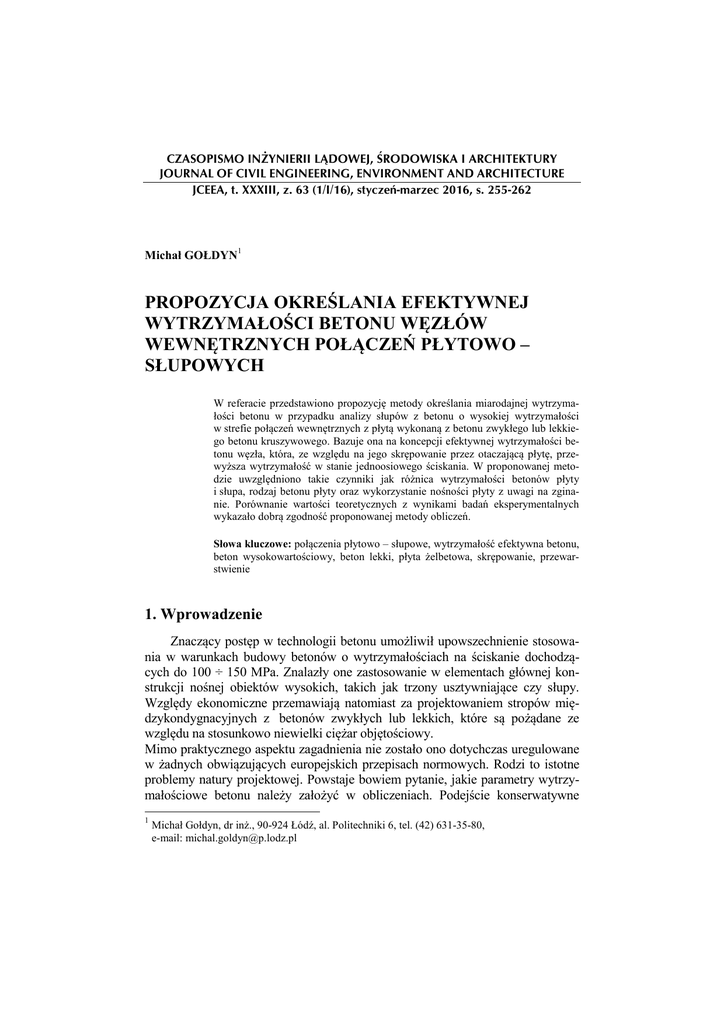 CZASOPISMO INŻYNIERII LĄDOWEJ, ŚRODOWISKA I ARCHITEKTURY JOURNAL OF CIVIL ENGINEERING, ENVIRONMENT AND ARCHITECTURE JCEEA, t. XXXIII, z. 63 (1/I/16), styczeń-marzec 2016, s. 255-262 Michał GOŁDYN1 PROPOZYCJA OKREŚLANIA EFEKTYWNEJ WYTRZYMAŁOŚCI BETONU WĘZŁÓW WEWNĘTRZNYCH POŁĄCZEŃ PŁYTOWO – SŁUPOWYCH W referacie przedstawiono propozycję metody określania miarodajnej wytrzymałości betonu w przypadku analizy słupów z betonu o wysokiej wytrzymałości w strefie połączeń wewnętrznych z płytą wykonaną z betonu zwykłego lub lekkiego betonu kruszywowego. Bazuje ona na koncepcji efektywnej wytrzymałości betonu węzła, która, ze względu na jego skrępowanie przez otaczającą płytę, przewyższa wytrzymałość w stanie jednoosiowego ściskania. W proponowanej metodzie uwzględniono takie czynniki jak różnica wytrzymałości betonów płyty i słupa, rodzaj betonu płyty oraz wykorzystanie nośności płyty z uwagi na zginanie. Porównanie wartości teoretycznych z wynikami badań eksperymentalnych wykazało dobrą zgodność proponowanej metody obliczeń. Słowa kluczowe: połączenia płytowo – słupowe, wytrzymałość efektywna betonu, beton wysokowartościowy, beton lekki, płyta żelbetowa, skrępowanie, przewarstwienie 1. Wprowadzenie Znaczący postęp w technologii betonu umożliwił upowszechnienie stosowania w warunkach budowy betonów o wytrzymałościach na ściskanie dochodzących do 100 ÷ 150 MPa. Znalazły one zastosowanie w elementach głównej konstrukcji nośnej obiektów wysokich, takich jak trzony usztywniające czy słupy. Względy ekonomiczne przemawiają natomiast za projektowaniem stropów międzykondygnacyjnych z betonów zwykłych lub lekkich, które są pożądane ze względu na stosunkowo niewielki ciężar objętościowy. Mimo praktycznego aspektu zagadnienia nie zostało ono dotychczas uregulowane w żadnych obwiązujących europejskich przepisach normowych. Rodzi to istotne problemy natury projektowej. Powstaje bowiem pytanie, jakie parametry wytrzymałościowe betonu należy założyć w obliczeniach. Podejście konserwatywne 1 Michał Gołdyn, dr inż., 90-924 Łódź, al. Politechniki 6, tel. (42) 631-35-80, e-mail: [email protected] 256 M. Gołdyn nakazywałoby, aby w przypadku wykonywania płyty z jednego rodzaju betonu przyjmować do analizy wytrzymałość słabszego z betonów. Wówczas jednak cechy wytrzymałościowe betonu słupa pozostawałyby niewykorzystane. Teoretyczny spadek nośności słupa w strefie przewarstwienia może zostać skompensowany poprzez zastosowanie dodatkowego zbrojenia podłużnego. Rozwiązanie to jest jednak w znacznym stopniu ograniczone maksymalnym, dopuszczalnym przekrojem zbrojenia, który zgodnie z PN-EN 1992-1-1 [8] nie powinien przekraczać 0,04Ac (gdzie Ac stanowi pole przekroju poprzecznego słupa), a także względami technologicznym – rozstaw zbrojenia powinien umożliwiać właściwe ułożenie mieszanki betonowej. Normy zagraniczne (m.in. ACI 318-14 [1], AS 3600-2001 [2] oraz CSA A23.3-04 [3]) wskazują na możliwość uniknięcia wspomnianego problemu poprzez wykonanie płyty w strefie węzłowej z betonu o wysokiej wytrzymałości. Konieczność właściwego zespolenia płyty stropowej oraz jednoczesne stosowanie dwóch różnych betonów może rodzić problemy natury wykonawczej i stwarza możliwość katastrofalnej w skutkach pomyłki. Dotychczasowe badania eksperymentalne, omówione m.in. w pracach [6], [7], [9], i [10], wykazały, iż przewarstwienie słabszym betonem płyty może skutkować obniżeniem nośności słupa wykonanego z betonu o wysokiej wytrzymałości. Spadek ten jest jednak znacznie mniejszy niż wynikałoby to z różnicy wytrzymałości obu betonów w stanie jednoosiowego ściskania. Celowe wydaje się zatem poszukiwanie zasad pozwalających określać rzeczywistą wytrzymałość betonu węzła, która, wskutek skrępowania przez otaczającą płytę, może znacznie przewyższać wartość nominalną fcs, a niekiedy także wytrzymałość betonu słupa fcc. 2. Beton skrępowany Wskutek ograniczenia odkształceń poprzecznych zmianie ulegają efektywne cechy wytrzymałościowe betonu. Zachowanie materiału staje się bardziej plastyczne, dlatego też zniszczenie następuje przy znacznie większych odkształceniach niż w przypadku osiowego ściskania (por. rys. 1a). Jest ono przy tym związane z wyższą wartością naprężeń ściskających σ1. W ujęciu procedur normowych jak również niektórych zależności empirycznych (m. in. Hobbs [4]) efektywna wytrzymałość betonu skrępowanego fc,c powiązana jest z względnym poziomem naprężeń poprzecznych σ2/fc: σ f c ,c = α + k 2 fc f c (1) gdzie: α, k – współczynniki (patrz rys. 2) σ2 – (= σ3) poprzeczne naprężenia ściskające, działające prostopadłe do naprężeń głównych σ1 fc – wytrzymałość betonu w stanie jednoosiowego ściskania Propozycja określania efektywnej wytrzymałości betonu węzłów… a) fc,c σ1 b) beton skrępowany σ2 fc,c /fc 5.0 σ1 fc 4.0 σ3 Hobbs [4] 1.0+4.8σ2 /fc 3.0 2.0 jednosiowe ściskanie εc2 εcu2 εc2,c 257 ε Eurokod 2 [8] 1.125+2.5σ2 /fc σ2 /fc 1.0 εcu2,c 0.25 0.5 0.75 1.0 Rys. 1. Cechy betonu skrępowanego: zależność naprężenie – odkształcenie, b) efektywna wytrzymałość w funkcji naprężeń σ2 (w ujęciu empirycznym) Fig. 1. Properties of confined concrete: stress – strain relationship, b) relation between effective strength of concrete and confining stress σ2 (according to empirical equations) Porównując pokazane na rys. 1b proste teoretyczne, wyznaczające efektywną wytrzymałość betonu skrępowanego, można zauważyć, iż przy naprężeniach σ2 stanowiących 25% wytrzymałości betonu fc, efektywna wytrzymałość betonu fc,c może ponad dwukrotnie przewyższać wartość fc, wynikającą z badań w stanie osiowego ściskania. Pokazuje to, iż przy skutecznym skrępowaniu betonu węzła przewarstwienie