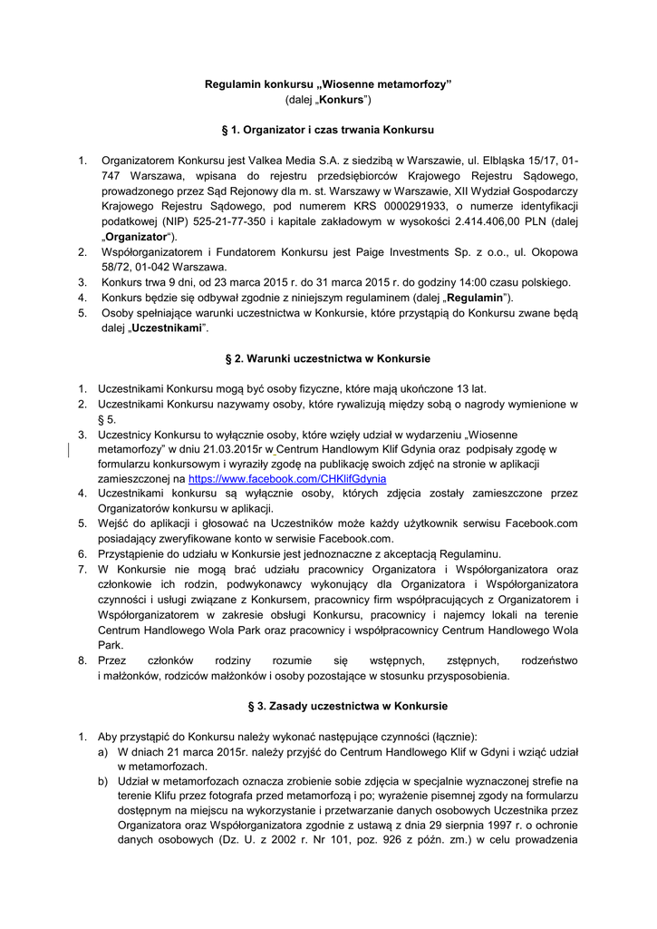 Regulamin konkursu „Wiosenne metamorfozy” (dalej „Konkurs”) § 1. Organizator i czas trwania Konkursu 1. 2. 3. 4. 5. Organizatorem Konkursu jest Valkea Media S.A. z siedzibą w Warszawie, ul. Elbląska 15/17, 01747 Warszawa, wpisana do rejestru przedsiębiorców Krajowego Rejestru Sądowego, prowadzonego przez Sąd Rejonowy dla m. st. Warszawy w Warszawie, XII Wydział Gospodarczy Krajowego Rejestru Sądowego, pod numerem KRS 0000291933, o numerze identyfikacji podatkowej (NIP) 525-21-77-350 i kapitale zakładowym w wysokości 2.414.406,00 PLN (dalej „Organizator“). Współorganizatorem i Fundatorem Konkursu jest Paige Investments Sp. z o.o., ul. Okopowa 58/72, 01-042 Warszawa. Konkurs trwa 9 dni, od 23 marca 2015 r. do 31 marca 2015 r. do godziny 14:00 czasu polskiego. Konkurs będzie się odbywał zgodnie z niniejszym regulaminem (dalej „Regulamin”). Osoby spełniające warunki uczestnictwa w Konkursie, które przystąpią do Konkursu zwane będą dalej „Uczestnikami”. § 2. Warunki uczestnictwa w Konkursie 1. Uczestnikami Konkursu mogą być osoby fizyczne, które mają ukończone 13 lat. 2. Uczestnikami Konkursu nazywamy osoby, które rywalizują między sobą o nagrody wymienione w § 5. 3. Uczestnicy Konkursu to wyłącznie osoby, które wzięły udział w wydarzeniu „Wiosenne metamorfozy” w dniu 21.03.2015r w Centrum Handlowym Klif Gdynia oraz podpisały zgodę w formularzu konkursowym i wyraziły zgodę na publikację swoich zdjęć na stronie w aplikacji zamieszczonej na https://www.facebook.com/CHKlifGdynia 4. Uczestnikami konkursu są wyłącznie osoby, których zdjęcia zostały zamieszczone przez Organizatorów konkursu w aplikacji. 5. Wejść do aplikacji i głosować na Uczestników może każdy użytkownik serwisu Facebook.com posiadający zweryfikowane konto w serwisie Facebook.com. 6. Przystąpienie do udziału w Konkursie jest jednoznaczne z akceptacją Regulaminu. 7. W Konkursie nie mogą brać udziału pracownicy Organizatora i Współorganizatora oraz członkowie ich rodzin, podwykonawcy wykonujący dla Organizatora i Współorganizatora czynności i usługi związane z Konkursem, pracownicy firm współpracujących z Organizatorem i Współorganizatorem w zakresie obsługi Konkursu, pracownicy i najemcy lokali na terenie Centrum Handlowego Wola Park oraz pracownicy i współpracownicy Centrum Handlowego Wola Park. 8. Przez członków rodziny rozumie się wstępnych, zstępnych, rodzeństwo i małżonków, rodziców małżonków i osoby pozostające w stosunku przysposobienia. § 3. Zasady uczestnictwa w Konkursie 1. Aby przystąpić do Konkursu należy wykonać następujące czynności (łącznie): a) W dniach 21 marca 2015r. należy przyjść do Centrum Handlowego Klif w Gdyni i wziąć udział w metamorfozach. b) Udział w metamorfozach oznacza zrobienie sobie zdjęcia w specjalnie wyznaczonej strefie na terenie Klifu przez fotografa przed metamorfozą i po; wyrażenie pisemnej zgody na formularzu dostępnym na miejscu na wykorzystanie i przetwarzanie danych osobowych Uczestnika przez Organizatora oraz Współorganizatora zgodnie z ustawą z dnia 29 sierpnia 1997 r. o ochronie danych osobowych (Dz. U. z 2002 r. Nr 101, poz. 926 z późn. zm.) w celu prowadzenia Konkursu oraz przyznania i wręczenia nagród, jak również opcjonalnie w celach marketingowych. Zgoda także obejmuje wykorzystanie wizerunku Uczestnika w aplikacji konkursowej i Uczestnik zrzeka się praw autorskich do wizerunku na rzecz Organizatora. c) Zdjęcie Uczestnika będzie umieszczone przez Organizatora w dedykowanej aplikacji konkursowej w dniu 23 marca 2015r. na profilu www.facebook.com/CHKlifGdynia d) Uczestnik może udostępnić dodane do aplikacji konkursowej zdjęcie na swojej tablicy w serwisie Facebook i zachęcać do głosowania swoich znajomych. e) Na dodane przez Uczestnika zdjęcia inni Uczestnicy Konkursu i użytkownicy Aplikacji będą mogli oddawać głosy. f) Warunkiem zagłosowania na zdjęcie Uczestnika jest wejście w aplikację i zaakceptowanie Regulaminu oraz wyrażenie zgody na wykorzystanie i przetwarzanie danych osobowych Uczestnika przez Organizatora oraz Współorganizatora zgodnie z ustawą z dnia 29 sierpnia 1997 r. o ochronie danych osobowych (Dz. U. z 2002 r. Nr 101, poz. 926 z późn. zm.) w celu prowadzenia Konkursu, oraz opcjonalnie w celach marketingowych. g) Każdy użytkownik Aplikacji może każdego dnia oddać maksymalnie 3 (trzy) głosy na zdjęcia Uczestników Konkursu. h) Na podstawie liczby uzyskanych głosów tworzony jest Ranking. § 4. Zasady wybory zwycięzców Konkursu 1. Spośród Uczestników, których zdjęcia otrzymają największą liczbę głosów Jury wyłoni 5 (pięciu) Laureatów nagród. Laureaci będą wyłonieni spośród 10 zdjęć, które zdobędą najwięcej głosów w Rankingu. 2. Zwycięzcami konkursu zostaje 5 osób. (dalej „Laureaci”) 3. Nagrody wskazane w § 5 Regulaminu otrzymają Uczestnicy, których zdjęcia zostaną uznane przez Jury za najciekawsze, najbardziej oryginalne i najlepiej wyczerpujące tematykę „Metamorfozy”. Przy wyborze Laureatów Jurorzy będzie kierować się w szczególności kryterium kreatywności, pomysłowości, estetyki oraz stylu. 4. W skład Jury wejdą Organizator oraz Współorganizator oraz stylistka z Klifu Gdynia. 5. Każdy Laureat może otrzymać tylko jedną nagrodę. 6. Wyniki Konkursu zostaną ogłoszone dnia 3 kwietnia 2014 r. do godziny 16:00 w aplikacji konkursowej, 7. Warunkiem odebrania Nagród (zdefiniowanych poniżej) jest odpowiedź Laureata, na maila wysłanego przez Organizatora z adresu mailowego [email protected], zawierająca dane osobowe Laureata Konkursu (imię, nazwisko zgodne z danymi podanymi w formularzu) do 13 kwietnia 2015 r. do godziny 12:00. 8. Warunkiem odbioru Nagrody jest potwierdzenie przez Organizatora otrzymania wiadomości email wraz z niezbędnymi danymi wymaganymi do wydania Nagrody i potwierdzenie terminu jej odbioru. 9. Nagro