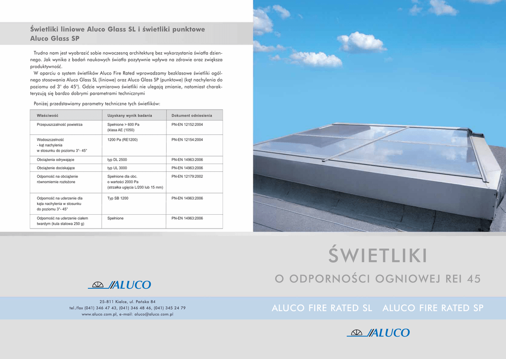 Trudno nam jest wyobrazić sobie nowoczesną architekturę bez wykorzystania światła dziennego. Jak wynika z badań naukowych światło pozytywnie wpływa na zdrowie oraz zwiększa produktywność. W oparciu o system świetlików Aluco Fire Rated wprowadzamy bezklasowe świetliki ogólnego stosowania Aluco Glass SL (liniowe) oraz Aluco Glass SP (punktowe) (kąt nachylenia do poziomu od 3° do 45°). Gdzie wymiarowo świetliki nie ulegają zmianie, natomiast charakteryzują się bardzo dobrymi parametrami technicznymi Poniżej przedstawiamy parametry techniczne tych świetlików: Przepuszczalność powietrza Spełnione > 600 Pa (klasa AE (1050) PN-EN 12152:2004 Wodoszczelność - kąt nachylenia w stosunku do poziomu 3°- 45° 1200 Pa (RE1200) PN-EN 12154:2004 Obciążenia odrywające typ DL 2500 PN-EN 14963:2006 Obciążenie dociskające typ UL 3000 PN-EN 14963:2006 Odporność na obciążenie równomiernie rozłożone Spełnione dla obc. o wartości 2000 Pa (strzałka ugięcia L/200 lub 15 mm) PN-EN 12179:2002 Odporność na uderzenie dla kąta nachylenia w stosunku do poziomu 3°- 45° Typ SB 1200 PN-EN 14963:2006 Odporność na uderzenie ciałem twardym (kula stalowa 250 g) Spełnione PN-EN 14963:2006 ALUCO FIRE RATED SL ALUCO FIRE RATED SP Właściwe doświetlenie światłem naturalnym pomieszczeń budynków odgrywa coraz większą rolę. Jest to związane z oszczędnością energii elektrycznej, której niskie zużycie jest jednym z parametrów pozwalającym zaliczyć obiekt do ekologicznych, a także wiąże się z zapewnieniem komfortu jego użytkownikom. Dachy szklane muszą spełniać surowe wymagania bezpieczeństwa pożarowego. Z powyższych powodów nasza firma wprowadza na rynek świetliki Aluco Fire Rated SL oraz Aluco Fire Rated SP w klasie odporności ogniowej, zgodnie z normą PN-EN-1365-2:2002 REI 45, co oznacza, że nasz produkt nie ulegnie zniszczeniu przez min. 45 min a także zapewni bezproblemowe opuszczenie obiektu oraz umożliwi działanie służb ratowniczych. Świetliki Aluco Fire Rated SP w klasie odporności ogniowej REI 45 można stosować na dowolnej podkonstrukcji nośnej w klasie minimum REI 45. Wymiary świetlików w świetle wynoszą: r szerokość- maksymalny wymiar 1400 mm r długość- maksymalny wymiar 2000 mm r kąt nachylenia do poziomu od 0° do 15° Świetliki Aluco Fire Rated SL w klasie odporności ogniowej REI 45 można stosować na dowolnej podkonstrukcji nośnej w klasie minimum REI 45. Wymiary świetlików w świetle wynoszą: r r r r szerokość - maksymalny wymiar 2000 mm długość – nie ma ograniczeń wymiar maksymalny jednego pola -1400 mm x 2000 mm kąt nachylenia do poziomu od 0° do 15° Można także stosować świetliki dwuspadowe. ALUCO FIRE RATED SL r ALUCO FIRE RATED SP