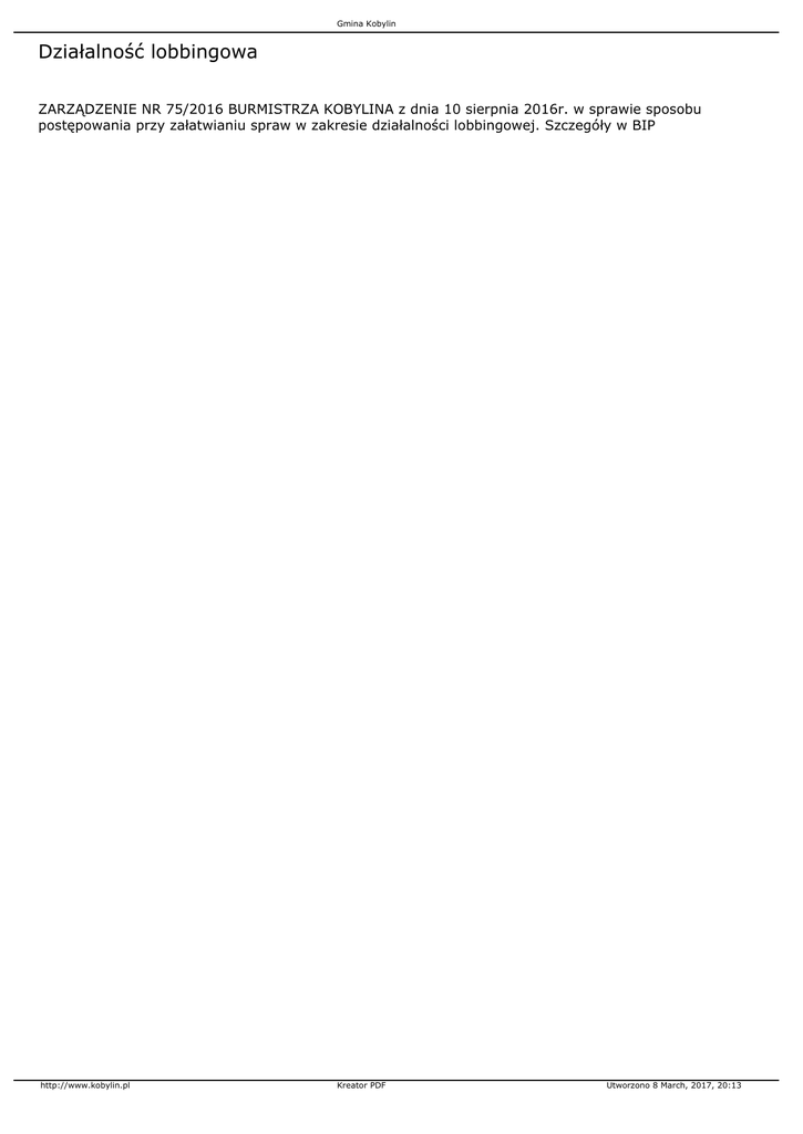 Gmina Kobylin Działalność lobbingowa ZARZĄDZENIE NR 75/2016 BURMISTRZA KOBYLINA z dnia 10 sierpnia 2016r. w sprawie sposobu postępowania przy załatwianiu spraw w zakresie działalności lobbingowej. Szczegóły w BIP http://www.kobylin.pl Kreator PDF Utworzono 8 March, 2017, 20:13