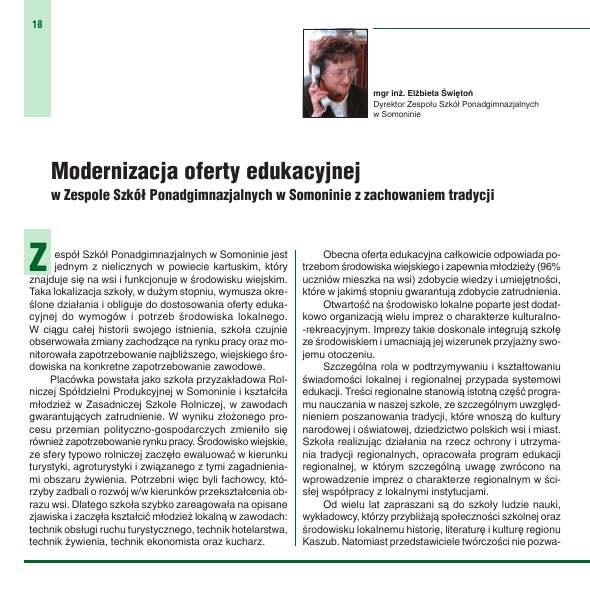 18 mgr in¿. El¿bieta Œwiêtoñ Dyrektor Zespo³u Szkó³ Ponadgimnazjalnych w Somoninie Modernizacja oferty edukacyjnej w Zespole Szkó³ Ponadgimnazjalnych w Somoninie z zachowaniem tradycji Z espó³ Szkó³ Ponadgimnazjalnych w Somoninie jest jednym z nielicznych w powiecie kartuskim, który znajduje siê na wsi i funkcjonuje w œrodowisku wiejskim. Taka lokalizacja szko³y, w du¿ym stopniu, wymusza okreœlone dzia³ania i obliguje do dostosowania oferty edukacyjnej do wymogów i potrzeb œrodowiska lokalnego. W ci¹gu ca³ej historii swojego istnienia, szko³a czujnie obserwowa³a zmiany zachodz¹ce na rynku pracy oraz monitorowa³a zapotrzebowanie najbli¿szego, wiejskiego œrodowiska na konkretne zapotrzebowanie zawodowe. Placówka powsta³a jako szko³a przyzak³adowa Rolniczej Spó³dzielni Produkcyjnej w Somoninie i kszta³ci³a m³odzie¿ w Zasadniczej Szkole Rolniczej, w zawodach gwarantuj¹cych zatrudnienie. W wyniku z³o¿onego procesu przemian polityczno-gospodarczych zmieni³o siê równie¿ zapotrzebowanie rynku pracy. Œrodowisko wiejskie, ze sfery typowo rolniczej zaczê³o ewaluowaæ w kierunku turystyki, agroturystyki i zwi¹zanego z tymi zagadnieniami obszaru ¿ywienia. Potrzebni wiêc byli fachowcy, którzyby zadbali o rozwój w/w kierunków przekszta³cenia obrazu wsi. Dlatego szko³a szybko zareagowa³a na opisane zjawiska i zaczê³a kszta³ciæ m³odzie¿ lokaln¹ w zawodach: technik obs³ugi ruchu turystycznego, technik hotelarstwa, technik ¿ywienia, technik ekonomista oraz kucharz. Obecna oferta edukacyjna ca³kowicie odpowiada potrzebom œrodowiska wiejskiego i zapewnia m³odzie¿y (96% uczniów mieszka na wsi) zdobycie wiedzy i umiejêtnoœci, które w jakimœ stopniu gwarantuj¹ zdobycie zatrudnienia. Otwartoœæ na œrodowisko lokalne poparte jest dodatkowo organizacj¹ wielu imprez o charakterze kulturalno-rekreacyjnym. Imprezy takie doskonale integruj¹ szko³ê ze œrodowiskiem i umacniaj¹ jej wizerunek przyjazny swojemu otoczeniu. Szczególna rola w podtrzymywaniu i kszta³towaniu œwiadomoœci lokalnej i regionalnej przypada systemowi edukacji. Treœci regionalne stanowi¹ istotn¹ czêœæ programu nauczania w naszej szkole, ze szczególnym uwzglêdnieniem poszanowania tradycji, które wnosz¹ do kultury narodowej i oœwiatowej, dziedzictwo polskich wsi i miast. Szko³a realizuj¹c dzia³ania na rzecz ochrony i utrzymania tradycji regionalnych, opracowa³a program edukacji regionalnej, w którym szczególn¹ uwagê zwrócono na wprowadzenie imprez o charakterze regionalnym w œcis³ej wspó³pracy z lokalnymi instytucjami. Od wielu lat zapraszani s¹ do szko³y ludzie nauki, wyk³adowcy, którzy przybli¿aj¹ spo³ecznoœci szkolnej oraz œrodowisku lokalnemu historiê, literaturê i kulturê regionu Kaszub. Natomiast przedstawiciele twórczoœci nie pozwa- 19 laj¹ zapomnieæ o rêkodzielnictwie, rzemioœle, potrawach kaszubskich, a nade wszystko jêzyku kaszubskim. G³ówne, planowane dzia³ania w kszta³towaniu sylwetki absolwenta szko³y turystycznej w zawodach: technik hotelarstwa w przysz³oœci technik us³ug gastronomicznych, to likwidacja barier w dostêpie m³odzie¿y wiejskiej do dzia³añ kultury, zmiana postawy ucznia z biernego na aktywnego uczestnika dzia³añ, kszta³towanie umiejêtnoœci spo³ecznych w ¿yciu publicznym i kulturze regionu z wykorzystaniem technologii i aktywnych metod nauczania, kszta³towanie umiejêtnoœci praktycznych, wdra¿anie do dzia³añ na rzecz œrodowiska lokalnego, pobudzenie aktywnoœci w celu dzia³añ na zwiêkszenie szans zawodowych i ¿yciowych , kszta³towanie postaw prospo³ecznych wœród m³odzie¿y wiejskiej. Budowanie wizerunku szko³y, jako aktywnego uczestnika ¿ycia lokalnego, poprawa jakoœci i efektywnoœci pracy szko³y z zakresu oceniania i egzaminów zewnêtrznych, promocja szko³y jako partnera dla innych szkó³ i instytucji. Przewiduje siê dalsze zmiany w motywacji uczniów, g³ównie ze œrodowiska wiejskiego, do nauki poprzez rozwiniêcie ich zainteresowañ, zachêcanie do udzia³u i w³¹czanie w prace projektowe, ró¿ne formy zajêæ pozalekcyjnych – warsztaty, wyjazdy. Nabycie praktycznych umiejêtnoœci stosowania jêzyków obcych, technologii informatycznych, korzystanie z ró¿nych Ÿróde³ wiedzy ma rozbudowaæ chêæ do nauki jêzyka kaszubskiego, jêzyków obcych, przedmiotów zawodowych. Na aktywnoœæ zawodow¹ wp³ywaj¹ te¿ dzia³ania: organizacja i udzia³ w pilota¿u, rajdzie, wycieczkach, imprezach œrodowiskowych o charakterze regionalnym oraz debatach. Uczniowie Technikum maj¹ obowi¹zek realizacji programu praktyk zawodowych i zajêæ praktycznych, które s¹ organizowane w obiektach hotelarskich i gospodarstwach agroturystycznych w klasach m³odszych w bliskim s¹siedztwie szko³y, póŸniejszych na terenie Trójmiasta, równie¿ w ramach sta¿y miêdzynarodowych. Ten ostatni dodatkowo wzbogaci kszta³towanie zawodowe poprzez: - gromadzenie wiedzy w okreœlonej dziedzinie (gastronomia, hotelarstwo), - zdobycie nowych doœwiadczeñ, nabywanie nowych kompetencji zawodowych i jêzykowych, - poznanie nowych ludzi, kultury i ich tradycji, - poznanie wymagañ europejskiego rynku pracy, dotycz¹cych umiejêtnoœci zawodowych. Na powiatowym rynku pracy panuje deficyt ofert pracy dla zawodów ze sfery turystyki i hotelarstwa. Du¿o lepiej przedstawia siê sytuacja dla osób posiadaj¹cych zawód kucharza i pokrewne. Jednak strategia powiatu i województwa stawiaj¹ na rozwój turystyki, tworzenie ma³ych rodzinnych przedsiêbiorstw, a tak¿e wzbogacenie Ÿróde³ utrzymania ludnoœci wiejskiej przez stworzenie miejsc pracy w rejonie zamieszkania, co pozwala przypuszczaæ, ¿e zawody zwi¹zane z obs³ug¹ ruchu turystycznego bêd¹ coraz bardziej poszukiwane na rynku. Analizy podkreœlaj¹ bowiem, ¿e tereny okalaj¹ce wielkie aglomeracje zyskuj¹ coraz to bardziej jako tereny atrakcyjne dla weekendowej rekreacji, co spowodowaæ powinno rozwój zaplecza us³