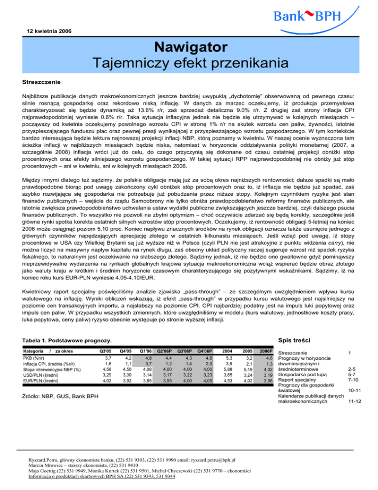 12 kwietnia 2006 Nawigator Tajemniczy efekt przenikania Streszczenie Najbliższe publikacje danych makroekonomicznych jeszcze bardziej uwypuklą „dychotomię” obserwowaną od pewnego czasu: silnie rosnącą gospodarkę oraz rekordowo niską inflację. W danych za marzec oczekujemy, iż produkcja przemysłowa charakteryzować się będzie dynamiką aż 13.6% r/r, zaś sprzedaż detaliczna 9.0% r/r. Z drugiej zaś strony inflacja CPI najprawdopodobniej wyniesie 0.6% r/r. Taka sytuacja inflacyjna jednak nie będzie się utrzymywać w kolejnych miesiącach – począwszy od kwietnia oczekujemy powolnego wzrostu CPI w stronę 1% r/r na skutek wzrostu cen paliw, żywności, istotnie przyspieszającego funduszu płac oraz pewnej presji wynikającej z przyspieszającego wzrostu gospodarczego. W tym kontekście bardzo interesująca będzie lektura najnowszej projekcji inflacji NBP, którą poznamy w kwietniu. W naszej ocenie wyznaczona tam ścieżka inflacji w najbliższych miesiącach będzie niska, natomiast w horyzoncie oddziaływania polityki monetarnej (2007, a szczególnie 2008) inflacja wróci już do celu, do czego przyczynią się dokonane od czasu ostatniej projekcji obniżki stóp procentowych oraz efekty silniejszego wzrostu gospodarczego. W takiej sytuacji RPP najprawdopodobniej nie obniży już stóp procentowych – ani w kwietniu, ani w kolejnych miesiącach 2006. Między innymi dlatego też sądzimy, że polskie obligacje mają już za sobą okres najniższych rentowności; dalsze spadki są mało prawdopodobne biorąc pod uwagę zakończony cykl obniżek stóp procentowych oraz to, iż inflacja nie będzie już spadać, zaś szybko rozwijająca się gospodarka nie potrzebuje już pobudzania przez niższe stopy. Kolejnym czynnikiem ryzyka jest stan finansów publicznych – wejście do rządu Samoobrony nie tylko obniża prawdopodobieństwo reformy finansów publicznych, ale istotnie zwiększa prawdopodobieństwo uchwalania ustaw wydatki publiczne zwiększających jeszcze bardziej, czyli dalszego psucia finansów publicznych. To wszystko nie pozwoli na zbytni optymizm – choć oczywiście zdarzać się będą korekty, szczególnie jeśli główne rynki spotka korekta ostatnich silnych wzrostów stóp procentowych. Oczekujemy, iż rentowność obligacji 5-letniej na koniec 2006 może osiągnąć poziom 5.10 proc. Koniec napływu znacznych środków na rynek obligacji oznacza także usunięcie jednego z głównych czynników napędzających aprecjację złotego w ostatnich kilkunastu miesiącach. Jeśli wziąć pod uwagę, iż stopy procentowe w USA czy Wielkiej Brytanii są już wyższe niż w Polsce (czyli PLN nie jest atrakcyjne z punktu widzenia carry), nie można liczyć na masywny napływ kapitału na rynek długu, zaś obecny układ polityczny raczej sugeruje wzrost niż spadek ryzyka fiskalnego, to naturalnym jest oczekiwanie na słabszego złotego. Sądzimy jednak, iż nie będzie ono gwałtowne gdyż pominąwszy nieprzewidywalne wydarzenia na rynkach globalnych krajowa sytuacja makroekonomiczna wciąż wspierać będzie obraz złotego jako waluty kraju w krótkim i średnim horyzoncie czasowym charakteryzującego się pozytywnymi wskaźnikami. Sądzimy, iż na koniec roku kurs EUR-PLN wyniesie 4.05-4.10/EUR. Kwietniowy raport specjalny poświęciliśmy analizie zjawiska „pass-through” – ze szczególnym uwzględnieniem wpływu kursu walutowego na inflację. Wyniki obliczeń wskazują, iż efekt „pass-through” w przypadku kursu walutowego jest najsilniejszy na poziomie cen transakcyjnych importu, a najsłabszy na poziomie CPI. CPI najbardziej podatny jest na impuls luki popytowej oraz impuls cen paliw. W przypadku wszystkich zmiennych, które uwzględniliśmy w modelu (kurs walutowy, jednostkowe koszty pracy, luka popytowa, ceny paliw) ryzyko obecnie występuje po stronie wyższej inflacji. Spis treści Tabela 1. Podstawowe prognozy. Kategoria / za okres PKB (%r/r) Inflacja CPI, średnia (%r/r) Stopa interwencyjna NBP (%) USD/PLN (średni) EUR/PLN (średni) Q3'05 Q4'05 Q1'06 Q2'06P Q3'06P Q4'06P 2004 2005 2006P 3,7 1,6 4,58 3,29 4,02 4,2 1,1 4,50 3,30 3,92 4,8 0,7 4,08 3,14 3,85 4,4 1,2 4,00 3,17 3,95 4,3 1,4 4,00 3,22 4,00 4,8 2,0 4,00 3,23 4,05 5,3 3,5 5,88 3,65 4,53 3,2 2,1 5,19 3,24 4,02 4,6 1,3 4,02 3,19 3,96 Źródło: NBP, GUS, Bank BPH Ryszard.Petru, główny ekonomista banku, (22) 531 9303, (22) 531 9990 email: [email protected] Marcin Mrowiec – starszy ekonomista, (22) 531 9410 Maja Goettig (22) 531 9949, Monika Kurtek (22) 531 9501, Michał Chyczewski (22) 531 9770 – ekonomiści Informacja o produktach skarbowych BPH SA (22) 531 9343, 531 9344 Streszczenie Prognozy w horyzoncie dwumiesięcznym i średnioterminowe Gospodarka pod lupą Raport specjalny Prognozy dla gospodarki światowej Kalendarze publikacji danych makroekonomicznych 1 2-5 5-7 7-10 10-11 11-12 12 kwietnia 2006 Nawigator PROGNOZY W HORYZONCIE DWUMIESIĘCZNYM I ŚREDNIOTERMINOWE Podtrzymujemy naszą prognozę wzrostu PKB w Q1’06 na poziomie 4.8%r/r. Taką skalę wskazują przede wszystkim dane dotyczące produkcji przemysłowej w styczniu i lutym (wzrost o odpowiednio 9.8%r/r i 10.1%r/r). Wzrost w tzw. branżach eksportowych produkcji przemysłowej wskazuje, że nie tylko popyt krajowy przyczyni się do wzrostu gospodarczego w Q1’06, ale również zanotowany zostanie pozytywny wkład eksportu netto (według naszych wyliczeń będzie to ok. 0.6pp). Wzrost konsumpcji indywidualnej sektora gospodarstw domowych szacujemy na 3.7%r/r (zmiana w stosunku do poprzedniej prognozy o 0.2%), na co wskazują z jednej strony dane dotyczące sprzedaży detalicznej (wzrost w styczniu o 8.6%r/r i o 10.2%r/r w lutym), a z drugiej nominalny wzrost wynagrodzeń (nominalnie odpowiednio o 3.6%r/r i 4.8%r/r), który w połączeniu z niską inflacją przyczynia się do wzrostu siły nabywczej dochodów gospodarstw domowych. Dodatkowo w marcu br. – po dwóch latach przerwy – dokonana została walory