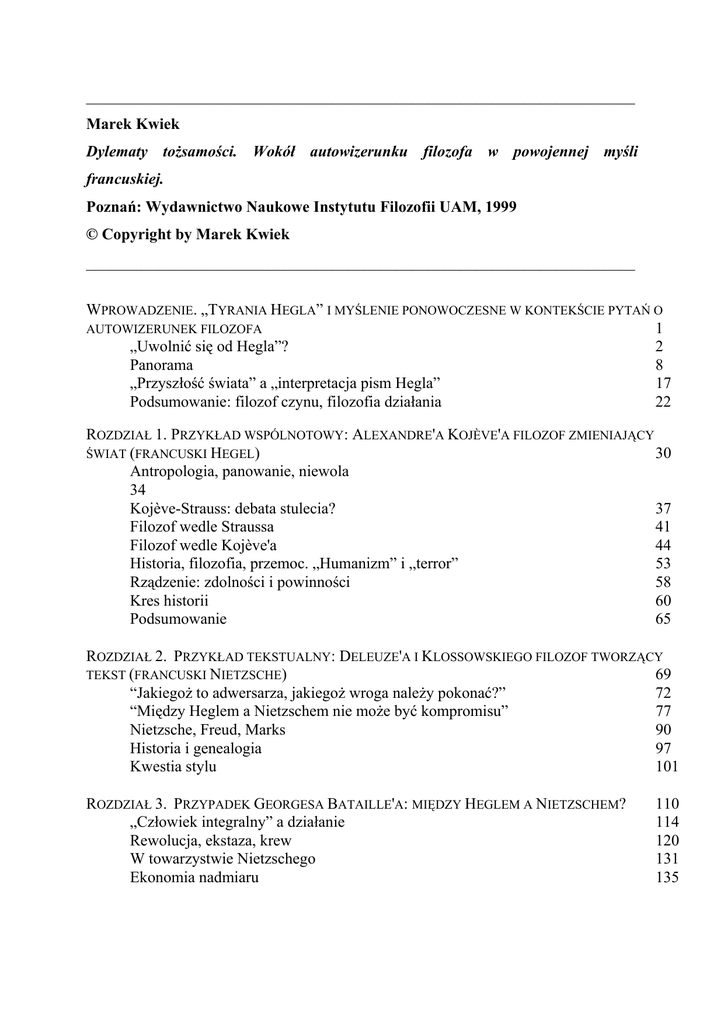 _____________________________________________________________________ Marek Kwiek Dylematy tożsamości. Wokół autowizerunku filozofa w powojennej myśli francuskiej. Poznań: Wydawnictwo Naukowe Instytutu Filozofii UAM, 1999 © Copyright by Marek Kwiek _____________________________________________________________________ WPROWADZENIE. „TYRANIA HEGLA” I MYŚLENIE PONOWOCZESNE W KONTEKŚCIE PYTAŃ O AUTOWIZERUNEK FILOZOFA 1 „Uwolnić się od Hegla”? 2 Panorama 8 „Przyszłość świata” a „interpretacja pism Hegla” 17 Podsumowanie: filozof czynu, filozofia działania 22 ROZDZIAŁ 1. PRZYKŁAD WSPÓLNOTOWY: ALEXANDRE'A KOJÈVE'A FILOZOF ZMIENIAJĄCY ŚWIAT (FRANCUSKI HEGEL) 30 Antropologia, panowanie, niewola 34 Kojève-Strauss: debata stulecia? 37 Filozof wedle Straussa 41 Filozof wedle Kojève'a 44 Historia, filozofia, przemoc. „Humanizm” i „terror” 53 Rządzenie: zdolności i powinności 58 Kres historii 60 Podsumowanie 65 ROZDZIAŁ 2. PRZYKŁAD TEKSTUALNY: DELEUZE'A I KLOSSOWSKIEGO FILOZOF TWORZĄCY TEKST (FRANCUSKI NIETZSCHE) 69 “Jakiegoż to adwersarza, jakiegoż wroga należy pokonać?” 72 “Między Heglem a Nietzschem nie może być kompromisu” 77 Nietzsche, Freud, Marks 90 Historia i genealogia 97 Kwestia stylu 101 ROZDZIAŁ 3. PRZYPADEK GEORGESA BATAILLE'A: MIĘDZY HEGLEM A NIETZSCHEM? „Człowiek integralny” a działanie Rewolucja, ekstaza, krew W towarzystwie Nietzschego Ekonomia nadmiaru 110 114 120 131 135 ROZDZIAŁ 4. WOKÓŁ ZAANGAŻOWANIA. OD WSPÓLNOTY DO TEKSTU I DALEJ: SARTRE, BARTHES, BLANCHOT, FOUCAULT „Umiłowanie mądrości” a polityka Filozofia, polityka – tekst, wspólnota Pisarze i piszący „Co to znaczy pisać?” Pisanie – czysta bierność na marginesie historii? 163 Poza opozycję esteta/pisarz zaangażowany Intelektualiści – władza Książki-doświadczenia i książki-prawdy „Tyrania prawdy” 142 142 145 148 152 169 174 180 183 ROZDZIAŁ 5. FILOZOF A CZASY PRZEŁOMU. FRANCUSKIE BURZE WOKÓŁ MARTINA HEIDEGGERA W PERSPEKTYWIE SPORU O MIEJSCE FILOZOFII W SFERZE OBYWATELSKOŚCI Początki Heidegger – francuski „mistrz myślenia” „Czy można jeszcze wierzyć filozofom?” Heideggera sen o przywództwie Dyskusje, dyskusje Specyficzna aura filozofa? „Przyjdźcie do nas, a będziecie mogli przekuć waszą myśl w czyn” 188 188 196 200 204 221 227 248 ROZDZIAŁ 6. WOKÓŁ PAULA DE MANA Kontekst europejski – rewolucja intelektualna Nowy porządek, nowy początek „Konstruktywne” podejście do rewolucji a „humanizm” Europejski cień człowieka czynu Ideologia estetyczna 252 257 270 278 281 287 ROZDZIAŁ 7. W STRONĘ ESTETYKI EGZYSTENCJI: MICHEL FOUCAULT „Dać żyjącym exempla...” Kanta i Nietzschego „troska o siebie” Etyka jako estetyka Foucault, Kant i „ontologia teraźniejszości” „Troska o siebie” jako praktyka wolności Myślenie – niebezpiecznym aktem? 292 293 295 300 310 312 318 BIBLIOGRAFIA SUMMARY CONTENTS 321