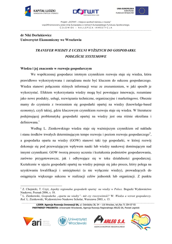 Projekt „DOTWIT – miejsce spotkań biznesu z nauką” współfinansowany przez Unię Europejską w ramach Europejskiego Funduszu Społecznego. CZŁOWIEK – NAJLEPSZA INWESTYCJA dr Niki Derlukiewicz Uniwersytet Ekonomiczny we Wrocławiu TRANSFER WIEDZY Z UCZELNI WYŻSZYCH DO GOSPODARKI. PODEJŚCIE SYSTEMOWE Wiedza i jej znaczenie w rozwoju gospodarczym We współczesnej gospodarce istotnym czynnikiem rozwoju staje się wiedza, która prawidłowo wykorzystywana i zarządzana może być kluczem do sukcesu gospodarczego. Wiedza stanowi połączenie różnych informacji wraz ze zrozumieniem, w jaki sposób je wykorzystać. Efektem wykorzystania wiedzy mogą być powstające innowacje, rozumiane jako nowe produkty, usługi, rozwiązania techniczne, organizacyjne i marketingowe. Obecnie mamy do czynienia z tworzeniem się gospodarki opartej na wiedzy (knowledge-based economy), czyli takiej, gdzie kluczowym czynnikiem rozwoju staje się wiedza. W literaturze podejmującej problematykę gospodarki opartej na wiedzy jest ona różnie określana i definiowana.1 Według L. Zienkowskiego wiedza staje się ważniejszym czynnikiem od nakładu i stanu środków trwałych determinującym tempo rozwoju i poziom rozwoju gospodarczego 2, a gospodarka oparta na wiedzy (GOW) stanowi taki typ gospodarki, w której rozwój dokonuje się pod przeważającym wpływem nauki lub wiedzy naukowej dominującym nad innymi czynnikami. GOW tworzą procesy uczenia i kształcenia podmiotów gospodarowania, zarówno przygotowawcze, jak i odbywające się w toku działalności gospodarczej. Kształcenie w ujęciu gospodarki opartej na wiedzy pojmuje się jako proces, który polega na uzyskiwaniu kwalifikacji i umiejętności (a nie wyłącznie wiedzy), prowadzących do osiągnięcia większego sukcesu w realizacji celów jednostek lub organizacji. Z punktu 1 Z. Chojnicki, T. Czyż, Aspekty regionalne gospodarki opartej na wiedzy w Polsce. Bogucki Wydawnictwo Naukowe, Poznań 2006, s. 18. 2 L. Zienkowski, Gospodarka „oparta na wiedzy”- mit czy rzeczywistość? W: Wiedza a wzrost gospodarczy. Red. L. Zienkowski, Wydawnictwo Naukowe Scholar, Warszawa 2003, s. 15. LIDER: Agencja Rozwoju Innowacji SA, ul. Ostródzka 38, 54 – 116 Wrocław, tel./fax 71 354 07 93 PARTNERZY PROJEKTU: Uniwersytet Wrocławski, Agencja Rozwoju Regionalnego ARLEG SA, Powiat Legnicki Projekt „DOTWIT – miejsce spotkań biznesu z nauką” współfinansowany przez Unię Europejską w ramach Europejskiego Funduszu Społecznego. CZŁOWIEK – NAJLEPSZA INWESTYCJA widzenia kształcenia gospodarka oparta na wiedzy ma stanowić gospodarkę ludzi uczących się3.. Według OECD i Banku Światowego gospodarka oparta na wiedzy to taka gospodarka, w której wiedza jest tworzona, przyswajana, przekazywana i wykorzystywana bardziej efektywnie przez przedsiębiorstwa, organizacje i jednostki, sprzyjając szybszemu rozwojowi społeczno-gospodarczemu4. W rezultacie wspólnych działań OECD i Banku Światowego powstała publikacja, analizująca proces przejścia do gospodarki opartej na wiedzy, w którym to wyróżniono następujące elementy:5 rozwój systemu, stwarzającego bodźce do efektywnego wykorzystania istniejącej wiedzy, kreowania nowej wiedzy, rozpoczynania nowych działalności, opartych na innowacjach, wykształcone i przedsiębiorcze społeczeństwo, które potrafi tworzyć i wykorzystywać nową wiedzę, dynamiczna struktura informacyjna, która ułatwia procesy przetwarzania i rozprzestrzeniania informacji, efektywny system innowacji, który obejmuje przedsiębiorstwa, ośrodki badawcze, uczelnie wyższe, firmy konsultingowe i inne organizacje, które współdziałając mogą sięgać do zasobów wiedzy globalnej, adaptować tę wiedzę do potrzeb lokalnych oraz wykorzystywać ją do tworzenia nowej wiedzy i technologii." Należy podkreślić, że aktualnie wzrasta rola kapitału intelektualnego, dzięki któremu podmioty gospodarcze zyskują tożsamość, stabilność oraz zdolność do tworzenia i asymilowania postępu techniczno-organizacyjnego. Staje się on czynnikiem wpływającym na rozwój społeczeństw, przedsiębiorstw i całych gospodarek. Wysoki poziom kapitału intelektualnego w bezpośredni sposób determinuje możliwość wykształcenia społeczeństwa wiedzy: kreatywnego, innowacyjnego, otwartego na zmiany, zdolnego do tworzenia trwałych więzi społecznych i ekonomicznych. Takie społeczeństwo zdolne jest do budowania 3 Z. Chojnicki, Charakter i rola wiedzy naukowej w rozwoju społeczno-gospodarczym. W: Gospodarka oparta na wiedzy. Perspektywy Banku Światowego. Red. A. Kukliński, KBN, Warszawa 2003, s. 319. 4 C. Dahlman, T. Andersson, Korea and the Konowledge-based Economy. OECD, World Bank Institute, 2000, s. 11. 5 A. Kukliński, Gospodarka oparta na wiedzy- trylogia OECD. W: Gospodarka oparta na wiedzy. Wyzwanie dla Polski XXI wieku. Red. A. Kukliński, KBN, Warszawa 2001, s. 93. LIDER: Agencja Rozwoju Innowacji SA, ul. Ostródzka 38, 54 – 116 Wrocław, tel./fax 71 354 07 93 PARTNERZY PROJEKTU: Uniwersytet Wrocławski, Agencja Rozwoju Regionalnego ARLEG SA, Powiat Legnicki Projekt „DOTWIT – miejsce spotkań biznesu z nauką” współfinansowany przez Unię Europejską w ramach Europejskiego Funduszu Społecznego. CZŁOWIEK – NAJLEPSZA INWESTYCJA gospodarki opartej na wiedzy, której podstawą jest inwestowanie w kapitał intelektualny oraz efektywne wykorzystywanie zewnętrznych źródeł wiedzy, co pozwala na trwały rozwój oraz tworzenie wartości dodanej na najwyższym poziomie.6 Uwzględniając powyższą charakterystykę wiedzy w kontekście jej wykorzystania można wyróżnić:7 wiedzę formalną (skodyfikowaną) - jasno określoną i usystematyzowaną, którą można przedstawić za pomocą słów, liczb, znaków i symboli. Tworzą ją przede wszystkim dokumenty, bazy danych oraz inne rodzaje zapisanych informacji, mające na celu wspomaganie podejmowania właściwych decyzji, wiedzę cichą (ukryt