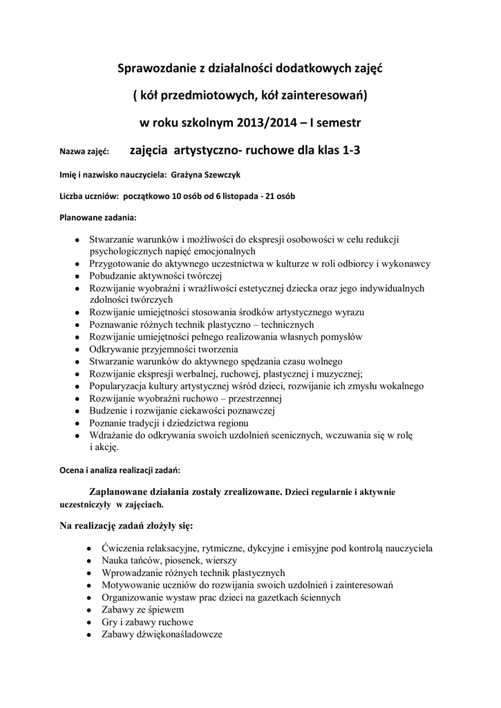 Sprawozdanie z działalności dodatkowych zajęd ( kół przedmiotowych, kół zainteresowao) w roku szkolnym 2013/2014 – I semestr Nazwa zajęd: zajęcia artystyczno- ruchowe dla klas 1-3 Imię i nazwisko nauczyciela: Grażyna Szewczyk Liczba uczniów: początkowo 10 osób od 6 listopada - 21 osób Planowane zadania: Stwarzanie warunków i możliwości do ekspresji osobowości w celu redukcji psychologicznych napięć emocjonalnych Przygotowanie do aktywnego uczestnictwa w kulturze w roli odbiorcy i wykonawcy Pobudzanie aktywności twórczej Rozwijanie wyobraźni i wrażliwości estetycznej dziecka oraz jego indywidualnych zdolności twórczych Rozwijanie umiejętności stosowania środków artystycznego wyrazu Poznawanie różnych technik plastyczno – technicznych Rozwijanie umiejętności pełnego realizowania własnych pomysłów Odkrywanie przyjemności tworzenia Stwarzanie warunków do aktywnego spędzania czasu wolnego Rozwijanie ekspresji werbalnej, ruchowej, plastycznej i muzycznej; Popularyzacja kultury artystycznej wśród dzieci, rozwijanie ich zmysłu wokalnego Rozwijanie wyobraźni ruchowo – przestrzennej Budzenie i rozwijanie ciekawości poznawczej Poznanie tradycji i dziedzictwa regionu Wdrażanie do odkrywania swoich uzdolnień scenicznych, wczuwania się w rolę i akcję. Ocena i analiza realizacji zadao: Zaplanowane działania zostały zrealizowane. Dzieci regularnie i aktywnie uczestniczyły w zajęciach. Na realizację zadań złożyły się: Ćwiczenia relaksacyjne, rytmiczne, dykcyjne i emisyjne pod kontrolą nauczyciela Nauka tańców, piosenek, wierszy Wprowadzanie różnych technik plastycznych Motywowanie uczniów do rozwijania swoich uzdolnień i zainteresowań Organizowanie wystaw prac dzieci na gazetkach ściennych Zabawy ze śpiewem Gry i zabawy ruchowe Zabawy dźwiękonaśladowcze Udział w konkursach Inscenizacje Osiągnięcia: Wykonanie prac plastyczno- technicznych: „Jesienne drzewa”, „Jesienne liście”, „Jesienne ptaki”, „Mieszkam w żabim kraju” Udział w konkursach i akcjach: (wykonanie kartek urodzinowych dla chorej Oliwki, udział w gminnym konkursie plastycznym „Święta Rodzina” -I miejsce Oliwia Smoter i Patrycja Hanzlik; wyróżnienia: Kacper Holewik, Maja Grim, Milena Ługowska; udział w ogólnopolskim konkursie plastycznym „Łamańce językowe w ulubionym wierszu Juliana Tuwima”; udział w konkursie na najciekawszą bajkę -konkurs wewnętrzny), Zabawy muzyczne Tańce – „Wiewiórki ”( do utworu ”Obladi, oblada”, The Beatles); „Taniec grzybków” Wykorzystanie tablicy interaktywnej- korzystanie z programu „Mały artysta”, „Mały projektant” Ćwiczenia dykcyjne, emisyjne –przygotowywanie przedstawienia- „Jasełkowa łezkahumoreska) Nauka kolęd i pastorałek do przedstawienia, Wystawy prac dzieci na korytarzu i w klasie; zdjęcia z zajęć na stronie internetowej szkoły. Uwagi: --------------------------------------------------------------------------------------------------------------------- Grażyna Szewczyk