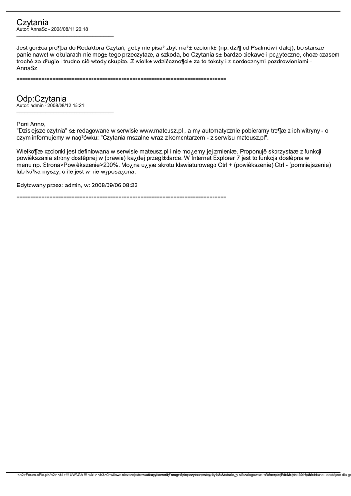 Czytania Autor: AnnaSz - 2008/08/11 20:18 _____________________________________ Jest gor±ca pro¶ba do Redaktora Czytañ, ¿eby nie pisa³ zbyt ma³± czcionk± (np. dzi¶ od Psalmów i dalej), bo starsze panie nawet w okularach nie mog± tego przeczytaæ, a szkoda, bo Czytania s± bardzo ciekawe i po¿yteczne, choæ czasem trochê za d³ugie i trudno siê wtedy skupiæ. Z wielk± wdziêczno¶ci± za te teksty i z serdecznymi pozdrowieniami AnnaSz ============================================================================ Odp:Czytania Autor: admin - 2008/08/12 15:21 _____________________________________ Pani Anno, "Dzisiejsze czytnia" s± redagowane w serwisie www.mateusz.pl , a my automatycznie pobieramy tre¶æ z ich witryny - o czym informujemy w nag³ówku: "Czytania mszalne wraz z komentarzem - z serwisu mateusz.pl". Wielko¶æ czcionki jest definiowana w serwisie mateusz.pl i nie mo¿emy jej zmieniæ. Proponujê skorzystaæ z funkcji powiêkszania strony dostêpnej w (prawie) ka¿dej przegl±darce. W Internet Explorer 7 jest to funkcja dostêpna w menu np. Strona>Powiêkszenie>200%. Mo¿na u¿yæ skrótu klawiaturowego Ctrl + (powiêkszenie) Ctrl - (pomniejszenie) lub kó³ka myszy, o ile jest w nie wyposa¿ona. Edytowany przez: admin, w: 2008/09/06 08:23 ============================================================================ <h2>Forum.oPio.pl</h2> <h1>!!! UWAGA !!! </h1> <h3>Chwilowo niezarejestrowani Joomlaboard u¿ytkownicyForum mog±Component tylko czytaæversion: posty, by 1.1.3 pisaæ Stable nale¿y siê zalogowaæ.</h3> Generated: <p>(Forum 8 March, jest 2017, niemoderowane 20:14 i dostêpne dla go