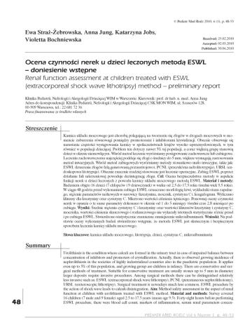 © Pediatr Med Rodz 2010, 6 (1), p. 48-53 Ewa Straż-Żebrowska, Anna Jung, Katarzyna Jobs, Violetta Bochniewska Received: 25.02.2010 Accepted: 02.03.2010 Published: 30.06.2010 Ocena czynności nerek u dzieci leczonych metodę) ESWL - doniesienie wstępne Renal function assessment at children treated with ESWL (extracorporeal shock wave lithotripsy) method - preliminary report Klinika Pediatrii, Nefrologii i Alergologii Dziecięcej W IM w Warszawie. Kierownik: prof. dr hab. n. med. Anna Jung Adres do korespondencji: Klinika Pediatrii, Nefrologii i Alergologii Dziecięcej C SK M O N W IM , ul. Szaserów 128, 00-909 Warszawa, tel.: 22 681 72 36 Praca finansowana ze środków własnych Streszczenie Kamica układu moczowego jest chorobą polegającą na tworzeniu się złogów w drogach moczowych w m o mencie zaburzenia równowagi pomiędzy promotorami i inhibitorami krystalizacji. Obecnie obserwuje się narastanie częstości występowania kamicy w społeczeństwach krajów wysoko uprzemysłowionych, w tym również w populacji dziecięcej. Problem ten dotyczy nawet 5% tej populacji, a coraz większą grupę stanowią dzieci w okresie niemowlęcym. Wśród metod leczenia wyróżniamy postępowanie zachowawcze lub zabiegowe. Leczeniu zachowawczemu najczęściej poddaje się złogi o średnicy do 5 mm, większe wymagają zastosowania metod inwazyjnych. Wśród metod zabiegowych wyróżniamy metody stosunkowo mało inwazyjne, takie jak: ESWL (kruszenie złogów falą generowaną pozaustrojowo), PCNL (przezskóma nefrolitotrypsja), LTRSL (en doskopowa litotrypsja). Obecnie znacznie rzadziej stosowane jest leczenie operacyjne. Zabieg ESWL poprzez działanie fali uderzeniowej powoduje dezintegrację złogu. Cel: Ocena bezpieczeństwa metody w aspekcie funkcji nerek u dzieci leczonych z powodu kamicy układu moczowego metodą ESWL. Materia! i metody: Badaniem objęto 16 dzieci (7 chłopców i 9 dziewczynek) w wieku od 2,5 do 17,5 roku (średni wiek 9,5 roku). W ciągu 48 godzin przed wykonaniem zabiegu ESWL oznaczano morfologię krwi, wykładniki stanu zapalne go, stężenie parametrów nerkowych w surowicy (kreatynina, mocznik, cystatyna C), koagulogram. Wyliczano klirensy dla kreatyniny oraz cystatyny C. Mierzono wartości ciśnienia tętniczego. Ponownej oceny czynności nerek w oparciu o te same parametry dokonano w okresie od 1 do 5 miesięcy (średni czas 2,8 miesiąca) po zabiegu. Wyniki: Średnie stężenia cystatyny C i kreatyniny oraz wartości klirensów kreatyniny i cystatyny C, mocznika, wartości ciśnienia skurczowego i rozkurczowego nie wykazały istotnych statystycznie różnic przed i po zabiegu ESWL. Stwierdzono statystycznie znamienne zmniejszenie mikroalbuminuiii. Wnioski: Na pod stawie oceny wykonanych badań stwierdzono wstępnie, że metoda ESWL jest skutecznym i bezpiecznym sposobem leczenia kamicy układu moczowego. Słowa kluczowe: kamica układu moczowego, litotrypsja, dzieci, cystatyna C, mikroalbuminuiia Summary 48 LTrolithiasis is the condition where calculi are formed in the urinary tract in case of impaired balance between concentration of inhibitors and promoters of crystallization. Actually, there is observed growing incidence of nephrolithiasis in the societies of highly industrialized countries also in the paediatric population. It applies even up to 5% of this population, and growing group are children in infancy. Lhere are conservative and sur gical methods of treatment. Suitable for conservative treatment are usually stones up to 5 111111 in diameter, larger deposits require invasive procedures. Among surgical methods there can be distinguished relatively less invasive such as: ESWL (extracorporeal shockwave lithotripsy), PCNL (percutaneous nephrolithotomy), LTRSL (ureteroscopic lithotripsy). Surgical treatment is nowadays much less common. ESWL procedure by the action of shockwave leads to calculi disintegration. Aim: Method safety assessment in the aspect of renal function at children with urolithiasis treated with ESWL method. Material and methods: Survey covered 16 children (7 male and 9 female) aged 2.5 to 17.5 years (mean age 9.5). Forty-eight hours before performing ESWL procedure, there were blood cell count, markers of inflammation, serum renal parameters concen- PEDIATR M E D R O D Z Vol 6 N u r n e r 1, p. 4 8 - 5 3 P RΛ C E O RY G I N Λ L N E I RO G L Ą D O W E / O RIG I N Λ L C O N T RI B U T I O N S tration (creatinine, urea, cystatiii C) and coagulogram determined. Creatinine and cystatin C clearance was calculated. Arterial blood pressure was measured. Reassessment compiled on the basis of the same parameters were made after the period of 1 to 5 months (mean time 2.8 months) after the ESWL treatment. Results: Mean concentration of cystatin C, creatinine, urea and values of creatinine clearance, cystatin C clearance, systolic and diastolic blood pressure before and after ESWL procedure showed no statistically significant differences. Statistically significant reduction of microalbuminuria was found. Conclusions: On the basis of testing carried out, the ESWL procedure was preliminarily found as an effective and safe method of urolithiasis treatment. Keywords: nephrolithiasis, lithotripsy, children, cystatin C, microalbuminuria amica układu moczowego jest chorobą polega jącą na tworzeniu się ziogów w drogach mo czowych w momencie zaburzenia równowagi pomiędzy promotorami i inhibitorami krystalizacji. Złogi tworzą się z substancji chemicznych stanowią cych fizjologiczny lub patologiczny składnik moczu1U). Do metabolicznych predyspozycji kamicy układu moczowego należą: hiperkalciuria, hiperoksaluria, hiperfosfaturia, hiperurikozuria, cystynuria. Tworzeniu się złogów sprzyjają nieprawidłowy odczyn moczu, zakażenia układu moczowego oraz niedobór inhibito rów krystalizacji. Hamująco na powstawanie złogów w układzie moczowym wpływają: białko Tamma-Horsfalla, cytryniany jony magnezu, fluoru i cynku, pirofosforany uro