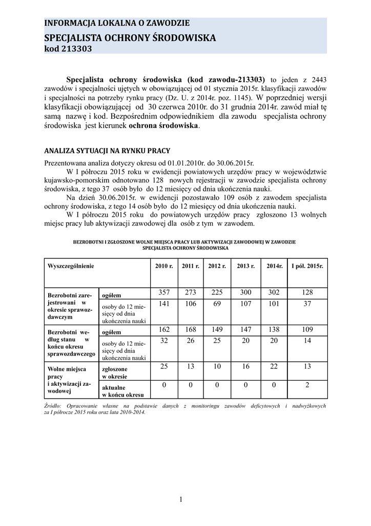 INFORMACJA LOKALNA O ZAWODZIE SPECJALISTA OCHRONY ŚRODOWISKA kod 213303 Specjalista ochrony środowiska (kod zawodu-213303) to jeden z 2443 zawodów i specjalności ujętych w obowiązującej od 01 stycznia 2015r. klasyfikacji zawodów i specjalności na potrzeby rynku pracy (Dz. U. z 2014r. poz. 1145). W poprzedniej wersji klasyfikacji obowiązującej od 30 czerwca 2010r. do 31 grudnia 2014r. zawód miał tę samą nazwę i kod. Bezpośrednim odpowiednikiem dla zawodu specjalista ochrony środowiska jest kierunek ochrona środowiska. ANALIZA SYTUACJI NA RYNKU PRACY Prezentowana analiza dotyczy okresu od 01.01.2010r. do 30.06.2015r. W I półroczu 2015 roku w ewidencji powiatowych urzędów pracy w województwie kujawsko-pomorskim odnotowano 128 nowych rejestracji w zawodzie specjalista ochrony środowiska, z tego 37 osób było do 12 miesięcy od dnia ukończenia nauki. Na dzień 30.06.2015r. w ewidencji pozostawało 109 osób z zawodem specjalista ochrony środowiska, z tego 14 osób było do 12 miesięcy od dnia ukończenia nauki. W I półroczu 2015 roku do powiatowych urzędów pracy zgłoszono 13 wolnych miejsc pracy lub aktywizacji zawodowej dla osób z tym w zawodem. BEZROBOTNI I ZGŁOSZONE WOLNE MIEJSCA PRACY LUB AKTYWIZACJI ZAWODOWEJ W ZAWODZIE SPECJALISTA OCHRONY ŚRODOWISKA Wyszczególnienie Bezrobotni zarejestrowani w okresie sprawozdawczym ogółem Bezrobotni według stanu w końcu okresu sprawozdawczego ogółem Wolne miejsca pracy i aktywizacji zawodowej zgłoszone w okresie osoby do 12 miesięcy od dnia ukończenia nauki osoby do 12 miesięcy od dnia ukończenia nauki aktualne w końcu okresu 2010 r. 2011 r. 2012 r. 2013 r. 2014r. I pół. 2015r. 357 141 273 106 225 69 300 107 302 101 128 37 162 32 168 26 149 25 147 20 138 20 109 14 25 13 10 16 22 13 0 0 0 0 0 2 Źródło: Opracowanie własne na podstawie danych z monitoringu zawodów deficytowych i nadwyżkowych za I półrocze 2015 roku oraz lata 2010-2014. 1 LICZBA BEZROBOTNYCH ZAREJESTROWANYCH W OKRESIE PRZYPADAJĄCYM NA 1 OFERTĘ PRACY W ZAWODZIE SPECJALISTA OCHRONY ŚRODOWISKA 25 21 20 22,5 18,7 15 14,3 13,7 9,8 10 5 0 2010r. 2011r. 2012r. 2013r. 2014r. I pół. 2015r. . Z uwagi na zmianę metodologii prowadzenia monitoringu zawodów deficytowych i nadwyżkowych zawód specjalista ochrony środowiska w I półroczu 2015 r. nie miał określonego statusu na rynku pracy1. Brak lub nieznaczna liczba zgłaszanych wolnych miejsc pracy lub aktywizacji zawodowej spowodowała, że zawód specjalista ochrony środowiska w latach 2010-2014 sklasyfikowany został jako nadwyżkowy, tzn. taki, na który na rynku pracy istnieje niższe zapotrzebowanie niż liczba osób poszukujących pracy w tym zawodzie2. BEZROBOTNI Z ZAWODEM SPECJALISTA OCHRONY ŚRODOWISKA WEDŁUG POWIATÓW Wyszczególnienie Bezrobotni wg stanu w końcu okresu 2011r. 2012r. 2013r. 2014r. I pół. 2015r. 70 7 0 66 5 1 147 25 9 138 28 9 109 15 6 Grudziądz ziemski 0 0 1 2 3 2 0 1 1 0 Toruń grodzki 11 10 17 17 10 Województwo kujawsko-pomorskie Bydgoszcz grodzki Bydgoszcz ziemski Grudziądz grodzki 1 Metodologię wprowadzono od 2015 roku. Wypracowana została w ramach projektu „Opracowanie nowych zaleceń metodycznych prowadzenia monitoringu zawodów deficytowych i nadwyżkowych na lokalnym rynku pracy” zainicjowanego przez Departament Rynku Pracy w Ministerstwie Pracy i Polityki Społecznej. Metodologia dostępna jest na stronie internetowej http://podlupa.wup.torun.pl/ w zakładce Biblioteka/Materiały ze spotkań. 2 Podziału na zawody deficytowe, zrównoważone i nadwyżkowe dokonywano na podstawie wskaźnika intensywności nadwyżki (deficytu) wyrażonego jako iloraz liczby zgłoszonych wolnych miejsc pracy i miejsc aktywizacji zawodowej w badanym okresie, w danym zawodzie i liczby zarejestrowanych bezrobotnych w badanym okresie, w danym zawodzie. Zawody deficytowe to takie, dla których wskaźnik przekracza wartość 1,1; zawody zrównoważone to te, dla których wartość wskaźnika mieści się w przedziale od 0,9 do 1,1; natomiast zawody nadwyżkowe to te, w których przypadku wskaźnik wynosi poniżej 0,9. 2 Toruń ziemski Włocławek grodzki Włocławek ziemski Aleksandrów Kujawski Brodnica Chełmno Golub Dobrzyń Inowrocław Lipno Mogilno Nakło nad Notecią Radziejów Rypin Sępólno Krajeńskie Świecie Tuchola Wąbrzeźno Żnin 0 20 1 18 4 6 2 10 3 8 13 0 14 0 5 1 5 2 5 3 1 0 0 2 8 4 7 1 5 2 0 2 1 1 5 20 4 21 4 18 2 2 1 1 7 2 6 5 6 5 2 6 2 4 6 3 4 3 5 3 2 0 1 0 1 2 2 1 1 2 0 0 1 0 6 1 3 2 1 1 0 2 0 0 2 8 0 5 1 4 Źródło: Opracowanie własne na podstawie danych z monitoringu zawodów deficytowych i nadwyżkowych za I półrocze 2015 roku oraz lata 2010-2014. WYNIKI BADAŃ PRACODAWCÓW W wynikach badania ankietowego pracodawców kluczowych branż województwa kujawsko-pomorskiego w 2014 roku nie występują informacje na temat zawodu specjalista ochrony środowiska3. W badaniach sondażowych realizowanych w latach 2013-2010 pracodawcy nie zgłaszali planów zatrudnienia lub zwolnienia osób z zawodem specjalista ochrony środowiska4. BADANIE INTERNETOWYCH OFERT PRACY Celem badania była analiza ilościowa i jakościowa treści internetowych ofert pracy dla województwa kujawsko-pomorskiego zamieszczonych na 4 portalach ogólnopolskich: Pracuj.pl, Praca.Gratka.pl, GazetaPraca.pl, Regiopraca.pl. W Raporcie końcowym z badania internetowych ofert pracy dla województwa kujawsko-pomorskiego od września do listopada 2014 roku oraz od lutego do kwietnia 2015 roku dla osób z zawodem specjalista ochrony środowiska były 1 oferta pracy5. 3 Raport z badania ankietowego 445 pracodawców 6 kluczowych branż woj. kujawsko-pomorskiego przeprowadzonego w 2014r. w ramach projektu Rynek Pracy pod Lupą II znajduje się na stronie www.podlupa.wup.torun.pl 4 Wyniki badań 2000 pracodawców woj. kujawsko-pomorskiego przeprowadzonych w latach 2010-2013 w ramach projektu Rynek Pracy pod Lupą znajdują się na stronie www.podlupa.wup.torun.pl 5 Analiza ilości