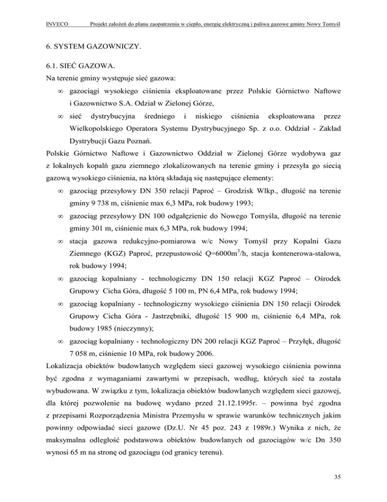 INVECO Projekt załoŜeń do planu zaopatrzenia w ciepło, energię elektryczną i paliwa gazowe gminy Nowy Tomyśl 6. SYSTEM GAZOWNICZY. 6.1. SIEĆ GAZOWA. Na terenie gminy występuje sieć gazowa: • gazociągi wysokiego ciśnienia eksploatowane przez Polskie Górnictwo Naftowe i Gazownictwo S.A. Odział w Zielonej Górze, • sieć dystrybucyjna średniego i niskiego ciśnienia eksploatowana przez Wielkopolskiego Operatora Systemu Dystrybucyjnego Sp. z o.o. Oddział - Zakład Dystrybucji Gazu Poznań. Polskie Górnictwo Naftowe i Gazownictwo Oddział w Zielonej Górze wydobywa gaz z lokalnych kopalń gazu ziemnego zlokalizowanych na terenie gminy i przesyła go siecią gazową wysokiego ciśnienia, na którą składają się następujące elementy: • gazociąg przesyłowy DN 350 relacji Paproć – Grodzisk Wlkp., długość na terenie gminy 9 738 m, ciśnienie max 6,3 MPa, rok budowy 1993; • gazociąg przesyłowy DN 100 odgałęzienie do Nowego Tomyśla, długość na terenie gminy 301 m, ciśnienie max 6,3 MPa, rok budowy 1994; • stacja gazowa redukcyjno-pomiarowa w/c Nowy Tomyśl przy Kopalni Gazu Ziemnego (KGZ) Paproć, przepustowość Q=6000m3/h, stacja kontenerowa-stalowa, rok budowy 1994; • gazociąg kopalniany - technologiczny DN 150 relacji KGZ Paproć – Ośrodek Grupowy Cicha Góra, długość 5 100 m, PN 6,4 MPa, rok budowy 1994; • gazociąg kopalniany - technologiczny wysokiego ciśnienia DN 150 relacji Ośrodek Grupowy Cicha Góra - Jastrzębniki, długość 15 900 m, ciśnienie 6,4 MPa, rok budowy 1985 (nieczynny); • gazociąg kopalniany - technologiczny DN 200 relacji KGZ Paproć – Przyłęk, długość 7 058 m, ciśnienie 10 MPa, rok budowy 2006. Lokalizacja obiektów budowlanych względem sieci gazowej wysokiego ciśnienia powinna być zgodna z wymaganiami zawartymi w przepisach, według, których sieć ta została wybudowana. W związku z tym, lokalizacja obiektów budowlanych względem sieci gazowej, dla której pozwolenie na budowę wydano przed 21.12.1995r. – powinna być zgodna z przepisami Rozporządzenia Ministra Przemysłu w sprawie warunków technicznych jakim powinny odpowiadać sieci gazowe (Dz.U. Nr 45 poz. 243 z 1989r.) Wynika z nich, Ŝe maksymalna odległość podstawowa obiektów budowlanych od gazociągów w/c Dn 350 wynosi 65 m na stronę od gazociągu (od granicy terenu). 35 INVECO Projekt załoŜeń do planu zaopatrzenia w ciepło, energię elektryczną i paliwa gazowe gminy Nowy Tomyśl Na terenie gminy znajdują się następujące złoŜa gazu ziemnego: • część udokumentowanego złoŜa gazu ziemnego Paproć, • udokumentowane złoŜe gazu ziemnego „Paproć W", • udokumentowane złoŜe gazu ziemnego Nowy Tomyśl. Załącznik mapowy Nr 1 przedstawia lokalizację obszarów górniczych i odwiertów gazowych na terenie gminy Nowy Tomyśl. Gaz podgrupy Ls (zaazotowany GZ-35, wartość opałowa 25,41 MJ/m3) wydobywany ze złoŜa Paproć wykorzystywany jest częściowo do zasilania Nowego Tomyśla, pozostała ilość gazu oddawana jest poprzez Mieszalnię Gazu Grodzisk do sytemu przesyłowego. Strukturę całkowitego wydobycia gazu ze złoŜa Paproć przedstawia poniŜsza Tabela. Tab.20. Wydobycie gazu w latach 1999-2006. Podgrupa Wydobycie gazu gazu 1999r. 2000r. 2001r. 2002r. 2003r. 2004r. 2005r. 2006r. ZłoŜe Paproć [m3/h] Ls 39 653 40 769 39 008 37 051 22 995 2 016 3 722 3 196 ZłoŜe Paproć [tyś.m3/rok] Ls 317222 326 153 312 063 296 404 183 963 16 129 29 772 25 571 ZłoŜa Istnieją moŜliwości zwiększenia wydobycia gazu ziemnego ze złóŜ, Tabela 21 przedstawia przewidywane zdolności wydobywcze złóŜ na terenie gminy. Tab.21. Przewidywane zdolności wydobywcze złóŜ na terenie gminy. ZłoŜa Paproć Paproć Jednostka Podgrupa gazu [tyś. m3/rok] Ls 3 [m /h] Paproć W el. W [tyś. m3/rok] poniŜej Paproć W el. W [m3/h] Nowy Tomyśl Nowy Tomyśl Paproć W + Nowy Tomyśl Paproć W + Nowy Tomyśl Kierunek "Paproć" Kierunek "Paproć" Lm 3 [tyś. m /rok] poniŜej 3 Lm [m /h] 3 [tyś. m /rok] poniŜej 3 [m /h] [tyś. m3/rok] 3 [m /h] Lm Zdolności wydobywcze 2010r. 2015r. 2020r. 322 320 229 440 156 752 40 290 28 680 19 594 169 168 153 152 109 112 21 146 19 144 13 639 35 536 30 128 23 224 4 442 3 766 2 903 219 672 188 384 135016 27 459 23 548 16 877 541 992 417 824 291 768 67 749 52 228 36 471 36 INVECO Projekt załoŜeń do planu zaopatrzenia w ciepło, energię elektryczną i paliwa gazowe gminy Nowy Tomyśl Wielkopolski Operator Systemu Dystrybucyjnego Sp. z o.o. Oddział - Zakład Dystrybucji Gazu Poznań zajmuje się dystrybucją i dostawą gazu ziemnego wydobywanego przez PGNiG Oddział w Zielonej Górze do odbiorców w miejscowościach: Boruja Kościelna, Boruja Nowa, Bukowiec, Chojniki, Glinno, Nowy Tomyśl, Paproć, Sątopy, Stary Tomyśl. Przedmiotowy obszar zasilany jest gazem ziemnym zaazotowanym podgrupy Ls (GZ-35) zgodnym z normą PN-C-04753 Paliwa gazowe rozprowadzane wspólna siecią i przeznaczone dla gospodarki komunalnej. Całkowita długość sieci dystrybucyjnej na terenie gminy wynosi: • gazociągi średniego ciśnienia 62 649 m, • gazociągi niskiego ciśnienia 23 300 m. Strukturę sieci dystrybucyjnej przedstawia Tabela 22, natomiast przebieg i lokalizację gazociągów średniego i wysokiego ciśnienia przedstawia załącznik mapowy Nr.1. Tab.22. Struktura sieci gazowej średniego ciśnienia na terenie gminy. Miejscowość Materiał Rok budowy Długość m Nowy Tomyśl Sątopy Boruja Kościelna; Boruja Nowa; Chojniki Paproć Glinno Stary Tomyśl Bukowiec (od Sworzyc) SUMA PE/stal PE/stal 1981-2003 1984-2006 15 414 m 18 210 m PE 1999-2000 16 972 m PE/stal PE PE PE 1994-2006 1997-2007 2007 1996-1998 1 864 m 2 734 m 680 m 6 775 m 62 649 Na terenie gminy znajdują się trzy sieciowe stacje gazowe II stopnia zasilające sieć gazową niskiego ciśnienia oraz cztery stacje gazowe II stopnia dla odbiorców przemysłowych. Tab.23. Struktura sieci gazowej niskiego ciśnienia na terenie gminy. M