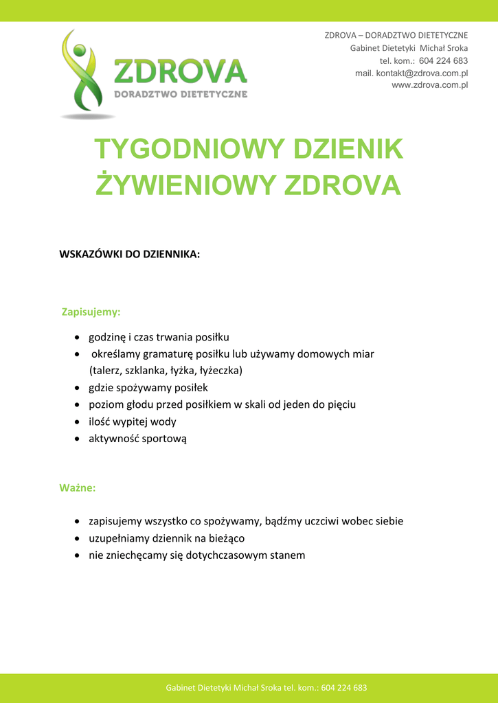 ZDROVA – DORADZTWO DIETETYCZNE Gabinet Dietetyki Michał Sroka tel. kom.: 604 224 683 mail. [email protected] www.zdrova.com.pl TYGODNIOWY DZIENIK ŻYWIENIOWY ZDROVA WSKAZÓWKI DO DZIENNIKA: Zapisujemy: godzinę i czas trwania posiłku określamy gramaturę posiłku lub używamy domowych miar (talerz, szklanka, łyżka, łyżeczka) gdzie spożywamy posiłek poziom głodu przed posiłkiem w skali od jeden do pięciu ilośd wypitej wody aktywnośd sportową Ważne: zapisujemy wszystko co spożywamy, bądźmy uczciwi wobec siebie uzupełniamy dziennik na bieżąco nie zniechęcamy się dotychczasowym stanem Gabinet Dietetyki Michał Sroka tel. kom.: 604 224 683 ZDROVA – DORADZTWO DIETETYCZNE Gabinet Dietetyki Michał Sroka tel. kom.: 604 224 683 mail. [email protected] www.zdrova.com.pl DZIEŃ 1 Godzina i czas trwania posiłku Gramatura, rodzaj posiłku Gdzie spożywamy posiłek Poziom głodu przed posiłkiem od 1-5 Ilośd wypitej wody Gabinet Dietetyki Michał Sroka tel. kom.: 604 224 683 Aktywnośd sportowa ZDROVA – DORADZTWO DIETETYCZNE Gabinet Dietetyki Michał Sroka tel. kom.: 604 224 683 mail. [email protected] www.zdrova.com.pl DZIEŃ 2 Godzina i czas trwania posiłku Gramatura, rodzaj posiłku Gdzie spożywamy posiłek Poziom głodu przed posiłkiem od 1-5 Ilośd wypitej wody Gabinet Dietetyki Michał Sroka tel. kom.: 604 224 683 Aktywnośd sportowa ZDROVA – DORADZTWO DIETETYCZNE Gabinet Dietetyki Michał Sroka tel. kom.: 604 224 683 mail. [email protected] www.zdrova.com.pl DZIEŃ 3 Godzina i czas trwania posiłku Gramatura, rodzaj posiłku Gdzie spożywamy posiłek Poziom głodu przed posiłkiem od 1-5 Ilośd wypitej wody Gabinet Dietetyki Michał Sroka tel. kom.: 604 224 683 Aktywnośd sportowa ZDROVA – DORADZTWO DIETETYCZNE Gabinet Dietetyki Michał Sroka tel. kom.: 604 224 683 mail. [email protected] www.zdrova.com.pl DZIEŃ 4 Godzina i czas trwania posiłku Gramatura, rodzaj posiłku Gdzie spożywamy posiłek Poziom głodu przed posiłkiem od 1-5 Ilośd wypitej wody Gabinet Dietetyki Michał Sroka tel. kom.: 604 224 683 Aktywnośd sportowa ZDROVA – DORADZTWO DIETETYCZNE Gabinet Dietetyki Michał Sroka tel. kom.: 604 224 683 mail. [email protected] www.zdrova.com.pl DZIEŃ 5 Godzina i czas trwania posiłku Gramatura, rodzaj posiłku Gdzie spożywamy posiłek Poziom głodu przed posiłkiem od 1-5 Ilośd wypitej wody Gabinet Dietetyki Michał Sroka tel. kom.: 604 224 683 Aktywnośd sportowa ZDROVA – DORADZTWO DIETETYCZNE Gabinet Dietetyki Michał Sroka tel. kom.: 604 224 683 mail. [email protected] www.zdrova.com.pl DZIEŃ 6 Godzina i czas trwania posiłku Gramatura, rodzaj posiłku Gdzie spożywamy posiłek Poziom głodu przed posiłkiem od 1-5 Ilośd wypitej wody Gabinet Dietetyki Michał Sroka tel. kom.: 604 224 683 Aktywnośd sportowa ZDROVA – DORADZTWO DIETETYCZNE Gabinet Dietetyki Michał Sroka tel. kom.: 604 224 683 mail. [email protected] www.zdrova.com.pl DZIEŃ 7 Godzina i czas trwania posiłku Gramatura, rodzaj posiłku Gdzie spożywamy posiłek Poziom głodu przed posiłkiem od 1-5 Ilośd wypitej wody Gabinet Dietetyki Michał Sroka tel. kom.: 604 224 683 Aktywnośd sportowa