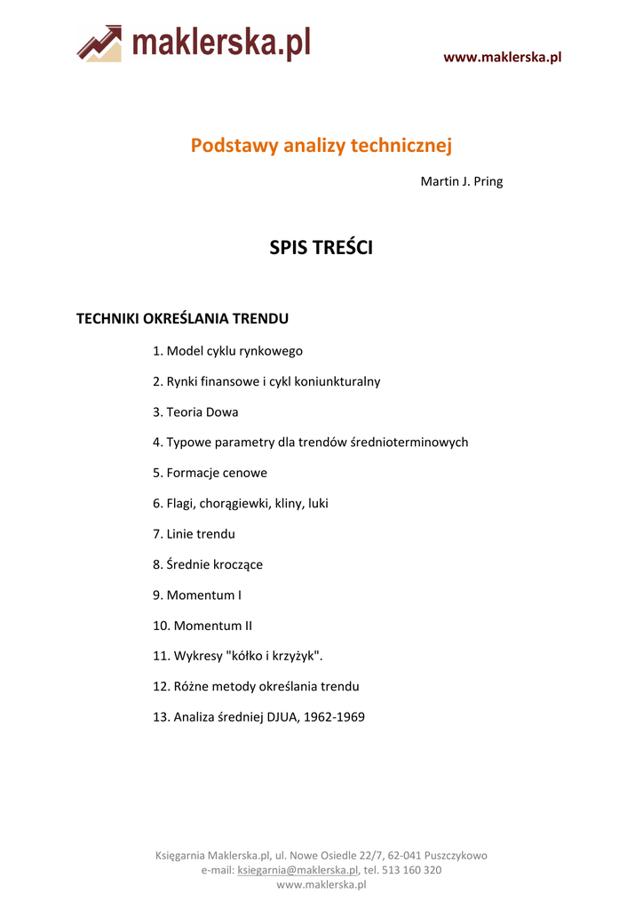 www.maklerska.pl Podstawy analizy technicznej Martin J. Pring SPIS TREŚCI TECHNIKI OKREŚLANIA TRENDU 1. Model cyklu rynkowego 2. Rynki finansowe i cykl koniunkturalny 3. Teoria Dowa 4. Typowe parametry dla trendów średnioterminowych 5. Formacje cenowe 6. Flagi, chorągiewki, kliny, luki 7. Linie trendu 8. Średnie kroczące 9. Momentum I 10. Momentum II 11. Wykresy "kółko i krzyżyk". 12. Różne metody określania trendu 13. Analiza średniej DJUA, 1962-1969 Księgarnia Maklerska.pl, ul. Nowe Osiedle 22/7, 62-041 Puszczykowo e-mail: [email protected], tel. 513 160 320 www.maklerska.pl www.maklerska.pl STRUKTURA RYNKU 14. Cena: najważniejsze indeksy 15. Cena: charakterystyka grup 16. Czas: cykle długoterminowe 17. Czas: rozpoznawanie cykli w praktyce 18. Wolumen 19. Szerokość rynku STOPY PROCENTOWE A RYNEK AKCJI 20. Dlaczego stopy procentowe wpływają na rynek akcji 21. Krótkoterminowe stopy procentowe 22. Długoterminowe stopy procentowe INNE ASPEKTY ZACHOWAŃ RYNKU 23. Wskaźniki nastrojów 24. Aktywność spekulacyjna 25. Zautomatyzowane systemy dokonywania transakcji 26. Wskaźniki SPECYFIKA RYNKÓW FINANSOWYCH 27. Analiza techniczna międzynarodowych rynków akcji 28. Analiza techniczna poszczególnych spółek 29. Analiza techniczna rynku złota 30. Analiza techniczna rynków walutowych Księgarnia Maklerska.pl, ul. Nowe Osiedle 22/7, 62-041 Puszczykowo e-mail: [email protected], tel. 513 160 320 www.maklerska.pl www.maklerska.pl 31. Analiza techniczna rynków towarowych DODATEK A Wykresy świecowe DODATEK B Teoria fal Elliotta SŁOWNIK Księgarnia Maklerska.pl, ul. Nowe Osiedle 22/7, 62-041 Puszczykowo e-mail: [email protected], tel. 513 160 320 www.maklerska.pl