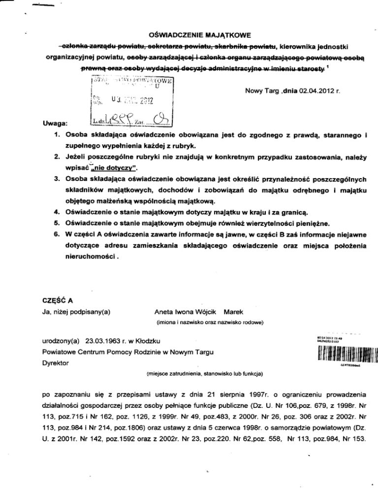 oŚWADczENlE mAJĄTKoWE erlo1ka zarEącu powiatEi sekretat?a pewiatu' 3karbnika powiatu, kierownika jednostki organ izacyinej powiatu, I i"t Nowy Targ dnaa 02.04.2012 r. u J' Uwaga: 1. Osoba skladająca oświadczenieobowiązana jest do zgodnego z prawdą, starannego i zupełnego wypełnienia każdej z rubryk' 2. Jeżeli poszczególne rubryki nie znajdują w konkretnym przypadku zastoaowania, należy wpisaólg!gg!g@y]. 3' osoba składająca oświadczenie obowiązana jest określićpr:zynależnośćposzczególnych składników majątkowych' dochodów i zobowiązań do majątku odrębnego i majątku objętego małżeńskąwspólnością majątkową' 4. 5. 6. oświadczenie o stanie majątkowym dotyczy majątku w kraju i zą granicą. oświadczenie o stanie majątkowym obejmuie również wiezytelności pieniężne. W częściA oświadczenia zawańe informacje są jawne, w częściB zaśinformacje niejawne doĘczące adresu zamieszkania składającego oświadczenieoraz miejsca położenia nieruchomości . czĘŚc A Ja' niżej podpisany(a) Aneta lwona Wójcik Marek (imiona i nazwisko oraz nazwisko rodowe) urodzony(a) 23.03.1963 r. w Kłodzku Powiatowe Centrum Pomocy Rodzinie w Nowym Targu Dyrektor (miejsce zatrudnienia, stanowisko lub funkcja) pzepisami ustawy z dnia 21 sierpnia 'l997r. o ograniczeniu prowadzenia działalnościgospodarczej pzez osoby pełniące funkcje publiczne (Dz. U. Nr 106,poz. 679' z'1998r. Nr 113,poz-715 iNr 162, poz. 1126, z 1999r. Nr49, po2.483,22000r. Nr26, poz.306 oraz z2OO2r.Nr po zapoznaniu się z 113' poz.984 i Nr 214' poz.1806) oraz ustawy z dnia 5 czerwca 1998r. o samorządzie powiatowym (Dz. U.22001r. Nr 142, po2.1592 orazz 2002r. Nr 23, poz.220. Nr 62,poz. 558, Nr 1'13, po2.984, Nr 153. poz.1271, Nr 200, poz. 1688 i Nr 214, poz' 't806)' zgodnie z ań.25c tej ustawy oświadczam, że posiadam wchodzące w skład małŹeńskiej wspólności majątkowej lub stanołYĘ€-nój_łTlająłekodębny: t. zasoby pieniężne: _ środkipieniężne zgromadzone w walucie polskiej 15 000'00 zł _ Środki pieniężne zgromadzone w walucie obcej: nie dotyczy _ papiery wańościowe: nie dotyczy il. '1.Dom o powiezchni: nie dotyczy 2.Mieszkanie o powiezchni: 62 m2, o wańości300 000,00 zł tytuł prawny: współwłasnośćmażeńska 3. Gospodarstwo rolne: nie dotyczy 4. lnne nieruchomości:. - działka budowlana o powierzchni: 780 m2, o wańości'l00 000,00 zł tytuł prawny: współwłasnośćmałŹeńska - mieszkanie o powiezchni: 40 m2, o wańości 300 000,00 zł tytuł prawny: współwłasnośćmażeńska - mieszkanie o powiezchni: 33 m2, o wańości100 000,00 zł tytuł prawny: wspohłlaściciel1/2 - mieszkanie o powiezchni: 25 m2, o wańoŚci 60 000,00 zł tytuł prawny: współwłaściciel1/2 - garaż o powieŻchni: '16 m2, o wańości 30 000,00 zł tytuł prawny: współwłasnośćmażeńska il1. Posiadam udziały w społkach handlowych - należy podać liczbę i emitenta udziałów udziały te stanowią pakiet większy niż'lo o/o udziałów w społce: .....'...............'.. z tego tytufu osiągnąłem(ęłam) w roku ubiegłym dochód w wysokości:- nie dotyczy _ nie dotyczy F-----------7 '/ ,/ tv. Posiadam akcje w spółkach handlowych_ należy podać liczbę iemitenta akcji: _ nie dotyczy akcje te stanowią pakiet większy niŻ 10o/o akcji w spółce: z tego tytułu osiągnąłem(ęłam) w roku ubiegłym dochód w wysokości; ........'........ v. Nabyłem(am) (nabył mój maźonek, z wyłączeniem mienia pŻynależnego do majątku odrębnego) od skarbu Państwa, innej państwowej osoby prawnej, jednostek samorządu terytorialnego, ich związków lub od komunalnej osoby prawnej następujące mienie, które podlegało zbyciu W drodze pŻetargu _ należy podać opis mienia i datę nabycia, od kogo: - nie dotyczy vt. Prowadzę działalnośćgospodarczą2 (naleŹy podać formę prawną i przedmiot działalności): - nie dotyczy - wspólnie z innymi osobami: _';;;il; z tego tytułu osiągnąłem(ęłam) w roku ubiegĘm pŻychód i dochód w wysokości:'.'.' 2'zalządzam działalnoŚcią gospodarczą lub jestem pzedstawicielem, pełnomocnikiem' takiej działalności(należy podać formę prawną i pzedmiot działalności):. - nie dotyczy -osobiście.- nie dotyczy - -.ta'" " r ,".t., "."0"r - "'" il;;. z tego tytułu osiągnąłem(ęłam) W roku ubiegłym dochód w wysokoŚci: - nie dotyczy. vil. 1'W spolkach handlowych (nazwa, siedziba społki): - nie dotyczy.. - jestem członkiem zarządu ( od kiedy):'.'.'''' _ jestem członkiem rady nadzorczej ( od kiedy): - jestem członkiem komisji rewizyjnej (od kiedy): Z tego tytułu osiągnąłem(ęłam) w roku ubiegłym dochód w wysokości: ............'...' 2. W spółdzielniach: - nie dotyczy. _ jestem członkiem zarządu (od kiedy): - jestem członkiem rady nadzorczej' 1od kiedy;: _ jestem członkiem komisji rewizyjnej (od kiedy): Z tego tytułu osiągnąłem(ęłam) w roku ubiegłym dochód w wysokości: ............-...' 3. W fundacjach prowadzących działalnośćgospodarczą: - jestem członkiem zaządu ( od kiedy):'.'..... ..'.'.''''.'''.'. - jestem członkiem rady nadzorczej ( od kiedy): _ jestem członkiem komisji rewizyjnej (od kiedy): _ nie dotyczy. ł''''''' z tego tytułu osiągnąłem(ęłam) w roku ubiegłym dochód w wysokości:_ nie dotyczy vllr. lnne dochody osiągane z tytułu zatrudnienia lub innej działalnościzarobkowej lub zajęó' z podaniem kwot uzyskiwanych z każdego tytułu: .....'.........'..' - dochody z tytułu zatrudnienia: - umowy zlecenia: 6 483,50 -oFE _ 61 114,53zł polisa na życie 53 512 zł zł 1 15 51Er'65A ['V łł'l\ l /\ /t, Składniki mienia ruchomego o wańoŚci powyżej 10 000 złotych ( w pzypadku pojazdów mechanicznych należy podać markę, model i rok produkcji): - nie dotyczy x. Zobowiązania pieniężne o wańości powyżej 10 000 złotych, w tym zaciągnięte kredyty i poŻyczki oraz warunki, na jakich zostały udzielone (Wobec kogo, w związku z jakim zdazeniem, w jakiej wys
