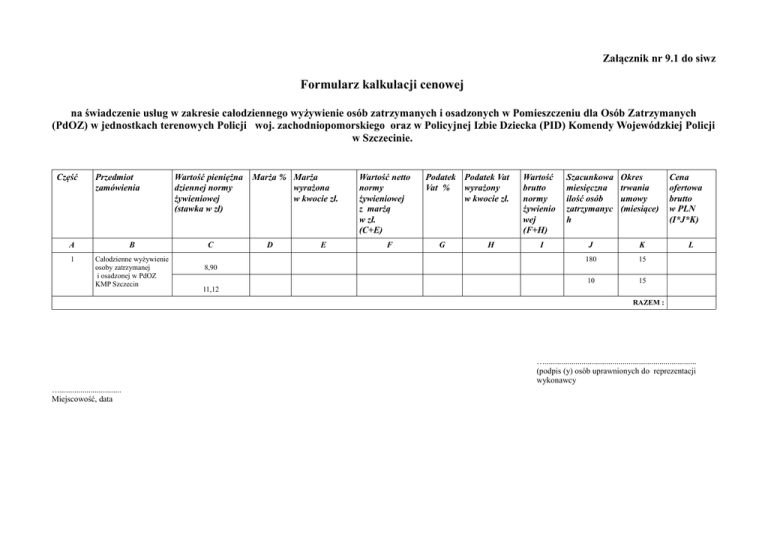 Załącznik nr 9.1 do siwz Formularz kalkulacji cenowej na świadczenie usług w zakresie całodziennego wyżywienie osób zatrzymanych i osadzonych w Pomieszczeniu dla Osób Zatrzymanych (PdOZ) w jednostkach terenowych Policji woj. zachodniopomorskiego oraz w Policyjnej Izbie Dziecka (PID) Komendy Wojewódzkiej Policji w Szczecinie. Część Przedmiot zamówienia A B 1 Całodzienne wyżywienie osoby zatrzymanej i osadzonej w PdOZ KMP Szczecin Wartość pieniężna dziennej normy żywieniowej (stawka w zł) C Marża % Marża wyrażona w kwocie zł. D E Wartość netto normy żywieniowej z marżą w zł. (C+E) F Podatek Podatek Vat Vat % wyrażony w kwocie zł. G H Wartość brutto normy żywienio wej (F+H) I Szacunkowa miesięczna ilość osób zatrzymanyc h Okres trwania umowy (miesiące) J K 180 15 10 15 Cena ofertowa brutto w PLN (I*J*K) L 8,90 11,12 RAZEM : ….......................................................................... (podpis (y) osób uprawnionych do reprezentacji wykonawcy ….............................. Miejscowość, data Załącznik nr 9.2 do siwz Formularz kalkulacji cenowej na świadczenie usług w zakresie całodziennego wyżywienie osób zatrzymanych i osadzonych w Pomieszczeniu dla Osób Zatrzymanych (PdOZ) w jednostkach terenowych Policji woj. zachodniopomorskiego oraz w Policyjnej Izbie Dziecka (PID) Komendy Wojewódzkiej Policji w Szczecinie. Część Przedmiot zamówienia A B 2 Całodzienne wyżywienie osoby zatrzymanej i osadzonej w PdOZ KPP Drawsko Pomorskie Wartość pieniężna dziennej normy żywieniowej (stawka w zł) C Marża % Marża wyrażona w kwocie zł. D E Wartość netto normy żywieniowej z marżą w zł. (C+E) F Podatek Podatek Vat Vat % wyrażony w kwocie zł. G H Wartość brutto normy żywienio wej (F+H) I Szacunkowa miesięczna ilość osób zatrzymanyc h Okres trwania umowy (miesiące) J K 17 15 1 15 Cena ofertowa brutto w PLN (I*J*K) L 8,90 11,12 RAZEM : ….......................................................................... (podpis (y) osób uprawnionych do reprezentacji wykonawcy ….............................. Miejscowość, data Załącznik nr 9.3 do siwz Formularz kalkulacji cenowej na świadczenie usług w zakresie całodziennego wyżywienie osób zatrzymanych i osadzonych w Pomieszczeniu dla Osób Zatrzymanych (PdOZ) w jednostkach terenowych Policji woj. zachodniopomorskiego oraz w Policyjnej Izbie Dziecka (PID) Komendy Wojewódzkiej Policji w Szczecinie. Część Przedmiot zamówienia A B 3 Całodzienne wyżywienie osoby zatrzymanej i osadzonej w PdOZ KPP Kołobrzeg Wartość pieniężna dziennej normy żywieniowej (stawka w zł) C Marża % Marża wyrażona w kwocie zł. D E Wartość netto normy żywieniowej z marżą w zł. (C+E) F Podatek Podatek Vat Vat % wyrażony w kwocie zł. G H Wartość brutto normy żywienio wej (F+H) I Szacunkowa miesięczna ilość osób zatrzymanyc h Okres trwania umowy (miesiące) J K 28 15 1 15 Cena ofertowa brutto w PLN (I*J*K) L 8,90 11,12 RAZEM : ….......................................................................... (podpis (y) osób uprawnionych do reprezentacji wykonawcy ….............................. Miejscowość, data Załącznik nr 9.4 do siwz Formularz kalkulacji cenowej na świadczenie usług w zakresie całodziennego wyżywienie osób zatrzymanych i osadzonych w Pomieszczeniu dla Osób Zatrzymanych (PdOZ) w jednostkach terenowych Policji woj. zachodniopomorskiego oraz w Policyjnej Izbie Dziecka (PID) Komendy Wojewódzkiej Policji w Szczecinie. Część Przedmiot zamówienia A B 4 Całodzienne wyżywienie osoby zatrzymanej i osadzonej w PdOZ KPP Łobez Wartość pieniężna dziennej normy żywieniowej (stawka w zł) C Marża % Marża wyrażona w kwocie zł. D E Wartość netto normy żywieniowej z marżą w zł. (C+E) F Podatek Podatek Vat Vat % wyrażony w kwocie zł. G H Wartość brutto normy żywienio wej (F+H) I Szacunkowa miesięczna ilość osób zatrzymanyc h Okres trwania umowy (miesiące) J K 9 15 1 15 Cena ofertowa brutto w PLN (I*J*K) L 8,90 11,12 RAZEM : ….......................................................................... (podpis (y) osób uprawnionych do reprezentacji wykonawcy ….............................. Miejscowość, data Załącznik nr 9.5 do siwz Formularz kalkulacji cenowej na świadczenie usług w zakresie całodziennego wyżywienie osób zatrzymanych i osadzonych w Pomieszczeniu dla Osób Zatrzymanych (PdOZ) w jednostkach terenowych Policji woj. zachodniopomorskiego oraz w Policyjnej Izbie Dziecka (PID) Komendy Wojewódzkiej Policji w Szczecinie. Część Przedmiot zamówienia A B 5 Całodzienne wyżywienie osoby zatrzymanej i osadzonej w PdOZ KPP Myślibórz Wartość pieniężna dziennej normy żywieniowej (stawka w zł) C Marża % Marża wyrażona w kwocie zł. D E Wartość netto normy żywieniowej z marżą w zł. (C+E) F Podatek Podatek Vat Vat % wyrażony w kwocie zł. G H Wartość brutto normy żywienio wej (F+H) I Szacunkowa miesięczna ilość osób zatrzymanyc h Okres trwania umowy (miesiące) J K 15 15 1 15 Cena ofertowa brutto w PLN (I*J*K) L 8,90 11,12 RAZEM : ….......................................................................... (podpis (y) osób uprawnionych do reprezentacji wykonawcy ….............................. Miejscowość, data Załącznik nr 9.6 do siwz Formularz kalkulacji cenowej na świadczenie usług w zakresie całodziennego wyżywienie osób zatrzymanych i osadzonych w Pomieszczeniu dla Osób Zatrzymanych (PdOZ) w jednostkach terenowych Policji woj. zachodniopomorskiego oraz w Policyjnej Izbie Dziecka (PID) Komendy Wojewódzkiej Policji w Szczecinie. Część Przedmiot zamówienia A B 6 Całodzienne wyżywienie osoby zatrzymanej i osadzonej w PdOZ KP Dębno Wartość pieniężna dziennej normy żywieniowej (stawka w zł) C Marża % Marża wyrażona w kwocie zł. D E Wartość netto normy żywieniowej z marżą w zł. (C+E) F Podatek Podatek Vat Vat % wyrażony w kwocie zł. G H Wartoś
