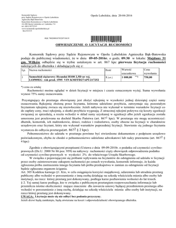 Komornik Sądowy przy Sądzie Rejonowym w Opolu Lubelskim Agnieszka Bąk-Batowska Kancelaria Komornicza w Opolu Lubelskim 24-300 Opole Lubelskie ul. Lubelska 7/4 tel. (081) 8272315 www.komornik-opolelubelskie.pl Km 814/15 #KK *0020001078520*/0419/ Opole Lubelskie, dnia 20-04-2016 *0020001078520* OBWIESZCZENIE O LICYTACJI RUCHOMOŚCI Komornik Sądowy przy Sądzie Rejonowym w Opolu Lubelskim Agnieszka Bąk-Batowska podaje do publicznej wiadomości, że w dniu 09-05-2016r. o godz. 09:30 w lokalu: Majdany 31 gm. Wilków odbędzie się w trybie ustalonym w art. 867 kpc pierwsza licytacja ruchomości należących do dłużnika i składających się z: Lp. Nazwa ruchomości Ilość 1 Samochód ciężarowy Hyundai H100 2,5D nr rej. LOP89EG rok prod. 1995 VIN KMFFD27APU217252 1 [szt.] Wartość szacunkowa 1 000,00 **) Cena wywołania 750,00 *) cena za sztukę Ruchomości można oglądać w dzień licytacji w miejscu i czasie oznaczonym wyżej. Suma wywołania wynosi 75% sumy oszacowania. Przystępujący do przetargu obowiązany jest złożyć rękojmię w wysokości jednej dziesiątej części sumy oszacowania. Rękojmię złożoną przez licytanta, któremu udzielono przybicia, zatrzymuje się; pozostałym licytantom rękojmię zwraca się niezwłocznie. Jeżeli nabywca nie wykonał w terminie warunków licytacji co do zapłaty ceny, traci rękojmię, a skutki przybicia wygasają. Z utraconej rękojmi pokrywa się koszty egzekucji związanej ze sprzedażą, a reszta wchodzi w skład sumy uzyskanej w egzekucji albo jeżeli egzekucja została umorzona jest przelewana na dochód Skarbu Państwa (art. 8671 kpc). W przetargu nie mogą uczestniczyć: dłużnik, komornik, ich małżonkowie, dzieci, rodzice i rodzeństwo, osoby obecne na licytacji w charakterze urzędowym oraz licytant, który nie wykonał warunków poprzedniej licytacji. Stawienie się jednego licytanta wystarcza do odbycia przetargu(art. 8672 § 2 kpc). Pełnomocnictwo do udziału w przetargu powinno być stwierdzone dokumentem z podpisem urzędowo poświadczonym, chyba że chodzi o pełnomocnictwo udzielone adwokatowi lub radcy prawnemu (art. 8672 § 4 kpc) Zgodnie z obowiązującymi przepisami (Ustawa z dnia 09-09-2010r. o podatku od czynności cywilnoprawnych (Dz.U. 2000 Nr 86 poz. 959) na nabywcy ruchomości ciąży obowiązek odprowadzenia podatku od czynności cywilno-prawnych w wyskości 2% do właściwego Urzędu Skarbowego. W związku z pojawiającymi się próbami wpływania na licytantów do odstąpienia od udziału w licytacji przez osoby zainteresowane zakupem ruchomości po cenach wywołania, komornik informuje, że każda zgłoszona próba zastraszenia innego licytanta lub próba przekupstwa w zamian za odstąpienie od licytacji będzie zgłaszana organom ścigania. Art. 305 Kodeksu karnego §1. Kto, w celu osiągnięcia korzyści majątkowej, udaremnia lub utrudnia przetarg publiczny albo wchodzi w porozumienie z inną osobą działając na szkodę właściciela mienia albo osoby lub instytucji, na rzecz której przetarg jest dokonywany, podlega karze pozbawienia wolności do lat trzech. § 2. Tej samej karze podlega, kto w związku z publicznym przetargiem rozpowszechania informacje lub przemilcza istotne okoliczności mające znaczenie dla zawarcia umowy będącej przedmiotem przetargu albo wchodzi w porozumienie z inną osobą, działając na szkodę właściciela mienia albo osoby lub instytucji, na rzecz której przetarg jest dokonywany. UWAGA: Licytacja może się nie odbyć bez podania przyczyny. Jeżeli drzwi będą zamknięte, będą otwierane na koszt i odpowiedzialność obowiązanego dłużnika.