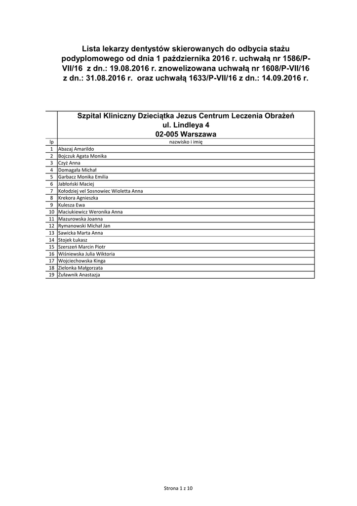 Lista lekarzy dentystów skierowanych do odbycia stażu podyplomowego od dnia 1 października 2016 r. uchwałą nr 1586/PVII/16 z dn.: 19.08.2016 r. znowelizowana uchwałą nr 1608/P-VII/16 z dn.: 31.08.2016 r. oraz uchwałą 1633/P-VII/16 z dn.: 14.09.2016 r. Szpital Kliniczny Dzieciątka Jezus Centrum Leczenia Obrażeń ul. Lindleya 4 02-005 Warszawa lp 1 2 3 4 5 6 7 8 9 10 11 12 13 14 15 16 17 18 19 nazwisko i imię Abazaj Amarildo Bojczuk Agata Monika Czyż Anna Domagała Michał Garbacz Monika Emilia Jabłoński Maciej Kołodziej vel Sosnowiec Wioletta Anna Krekora Agnieszka Kulesza Ewa Maciukiewicz Weronika Anna Mazurowska Joanna Rymanowski Michał Jan Sawicka Marta Anna Stojek Łukasz Szerszeń Marcin Piotr Wiśniewska Julia Wiktoria Wojciechowska Kinga Zielonka Małgorzata Żuławnik Anastazja Strona 1 z 10 Mazowieckie Centrum Stomatologii Sp. z o.o. ul. Nowy Zjazd 1 00-301 Warszawa lp 1 2 3 4 5 6 7 8 9 10 11 12 13 14 15 16 17 18 19 20 21 22 23 24 25 26 27 28 29 30 31 32 33 34 35 nazwisko i imię Chmielewska Justyna Daczewska Katarzyna Anna Derewońko Karolina Drężek Anna Dygas Sebastian Dymkowski Paweł Krzysztof Dziedzic Alina Głaszczka Marta Godowski Janusz Piotr Grzywna Karolina Janas Dominika Janczewska Joanna Jurkowska Malwina Kacprzyk Milena Kaczyński Karol Amadeusz Kapica Anna Kołodziejska Magdalena Kruk Klaudia Leszak Sylwia Katarzyna Łukasik Katarzyna Mateusiak Daria Kamila Mikutel Marta Naumowska Katarzyna Pap Magdalena Piorun Natalia Weronika Pogorzelski Bartłomiej Piotr Sosnowska Paulina Środa Marcin Paweł Świętorzecka Julita Barbara Trawińska Sylwia Trojanowska Zuzanna Magdalena Truszyńska Ewelina Walkiewicz Magdalena Zawadka Dominika Zborzyńska Aleksandra Samodzielny Zespół Publicznych Zakładów Lecznictwa Otwartego Warszawa Praga Północ ul. Jagiellońska 34 03-719 Warszawa lp 1 Ługowska Aleksandra nazwisko i imię Strona 2 z 10 Niepubliczny Zakład Opieki Zdrowotnej Centrum Medyczne Fundacji "Zdrowie" al. Dzieci Polskich 17 04-730 Warszawa PORADNIA STOMATOLOGICZNA ul. Roentgena 23 lok.2 02-781 Warszawa lp 1 2 3 4 5 nazwisko i imię Bielecka Agata Kicka Małgorzata Łuczak Marta Wiktor Aleksandra Magdalena Wiktor Piotr Przychodnia Lekarska Wojskowej Akademii Technicznej SPZOZ ul. Kartezjusza 2 01-480 Warszawa lp 1 2 3 4 5 6 7 8 9 10 nazwisko i imię Czajka Karol Maciej Kaczyńska Agnieszka Kamiński Konrad Kowalczyk Jakub Kruk Magdalena Paulina Pastuszko Anna Agnieszka Piasecka Joanna Dorota Sipińska Aleksandra Suwiński Arkadiusz Wilk Aleksandra Dominika Centralna Wojskowa Przychodnia Lekarska „CePeLek” SPZOZ ul. Koszykowa 78 00-911 Warszawa lp 1 2 3 4 5 6 7 8 9 10 11 12 13 14 15 16 17 18 19 20 21 22 nazwisko i imię Andrzejewicz Anna Bartosik Jonatan Jakub Bikiewicz Katarzyna Borawska Joanna Anna Chojnowska Agnieszka Ciok Anna Maria Czerwata Magdalena Agnieszka Dąbkowska Magdalena Dymitrowa Georgiewa Renata Frelek Joanna Aleksandra Gruchała Anna Elżbieta Kargol Joanna Michalski Jakub Panasiewicz Paulina Beata Piotrowska Milena Anita Pochroń Natalia Rytlewska Agnieszka Siniarski Piotr Bogdan Siuciak Karolina Edyta Skrzat Anna Stolarczyk Agnieszka Wioleta Wojtasiak Sebastian Czesław Strona 3 z 10 Niepubliczny Zakład Opieki Zdrowotnej „CITImedical” Ul. Młynarska 26/28 01-171 Warszawa lp 1 Siejek Katarzyna Anna 2 Szymańska Katarzyna Olga nazwisko i imię Niepubliczny Zakład Opieki Zdrowotnej Poradnia Stomatologiczna „De Wu” Ul. Różana 8, 05-270 Marki Filia nr 1 Warszawa ul. Jagiellońska 34 Filia nr 2 Warszawa ul. Otwocka 1 lp 1 Jarosiewicz Dajana Roksana 2 Skieresz Sylwia Justyna nazwisko i imię Indywidualna Specjalistyczna Praktyka Lekarsko Stomatologiczna IMARI Ul. Walecznych 57 m. 31 03-926 Warszawa lp 1 Biernat Magda Alicja nazwisko i imię Instytut „ Pomnik Centrum Zdrowia Dziecka” al. Dzieci Polskich 20 04-730 Warszawa lp 1 Lipiec Maja nazwisko i imię Wojskowy Instytut Medycyny Lotniczej Publiczny Zakład Opieki Zdrowotnej ul. Krasińskiego 54 01-755 Warszawa lp 1 2 3 4 nazwisko i imię Grot Kacper Filip Karczmarczyk Karolina Piwowarska Karolina Rytel Magdalena Lecznica „GOCŁAW” Maria Kamela ul. Fieldorfa 5 03-984 Warszawa lp 1 Łukasz Karolina 2 Orzechowska Izabela 3 Pacak Maria Zofia nazwisko i imię Strona 4 z 10 Centrum Medyczne Corten Medic Tomasz Sikora Przychodnia Lekarska Nr 1 ul. Modzelewskiego 58, 02-679 Warszawa Przychodnia Lekarska nr 2 ul. Pasaż Ursynowski 9, 02-784 Warszawa Przychodnia lekarska nr 4 ul. Makolągwy 21 lok.U-4, 02-811 Warszawa Przychodnia Lekarska nr 3 ul. Wł. Beliny Prażmowskiego 33A, 26-600 Radom Przychodnia Lekarska nr 5 ul. Krakowskie Przedmieście 24/26, 00-071 Warszawa Przychodnia Lekarska nr 6 ul. Etiudy Rewolucyjnej 48, 02-643 Warszawa lp 1 2 3 4 5 6 7 8 9 nazwisko i imię Celuch Zbigniew Hir Katarzyna Karwat Marlena Lewandowska Katarzyna Małyszek Ewa Struzik Sabrina Beata Syvak Julian Wasąg Natalia Grażyna Wojcieszko Katarzyna Zofia Niepubliczny Zakład Opieki Zdrowotnej Przychodnia Medyczna ul. Kochanowskiego 45 paw. 1 01-864 Warszawa lp 1 Mikicin Marta Anna nazwisko i imię DENTAL STUDIO ul. Sokratesa 2B lok. 1 01-909 Warszawa lp 1 Andrzejewska Anna nazwisko i imię Niepubliczny Zakład Opieki Zdrowotnej „ELEKTORALNA DENTAL CLINIC” ul. Elektoralna 28 00-892 Warszawa lp 1 2 3 4 5 nazwisko i imię Chybalska Katarzyna Maria Lewińska Agnieszka Mashynska Natalia Szymański Maciej Piotr Wysocka Katarzyna Strona 5 z 10 „LASER-DENT” PRZYCHODNIA STOMATOLOGICZNA ul. Grochowska 354 03-838 Warszawa lp 1 Orlik Justyna nazwisko i imię STOMATOLOGIA RAFAŁOWICZ- BARBARA RAFAŁOWICZ ul. Ćmielowska 15 lok. użyt. 8 03-127 Warszawa lp 1 Bączek Iwona Judyta 2 Jachimczyk Olga 3 Szymańska Olga nazwisko i imię BEST DENT Katarzyna Pieńkowska Tomasz Płoszaj S. C. Poradnia Stomatologiczna- 002 ul. Sękocińska11A/1 02-313 Warszawa Filia: ul. Przejazd 4 02-654 Warszawa lp 1 Suchecka Karolina Agata 2 Mieczkowska Paulina nazwisko i imię Niepubliczny Zakład Opieki Zdrowotn