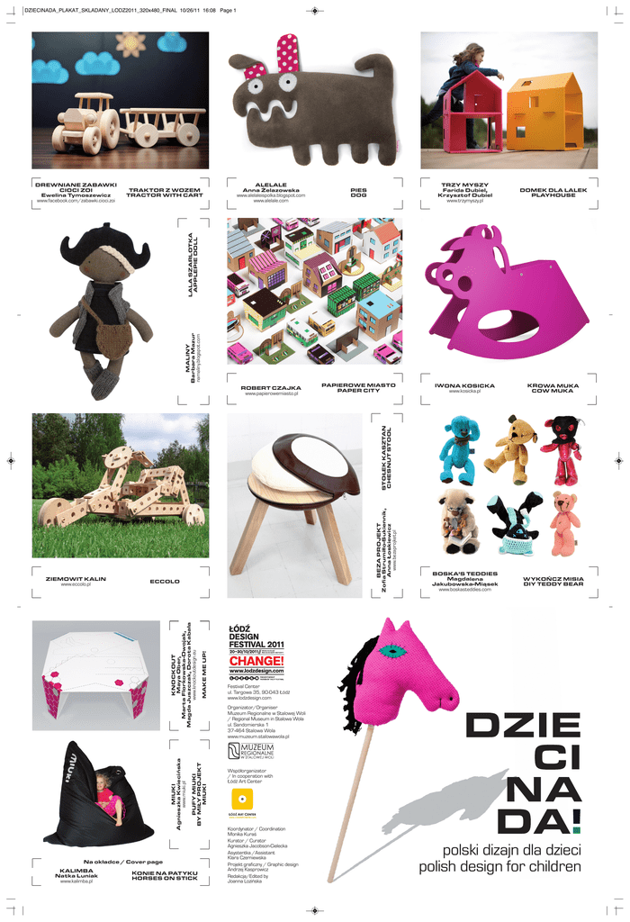 DZIECINADA_PLAKAT_SKLADANY_LODZ2011_320x480_FINAL 10/26/11 16:08 Page 1 TRAKTOR Z WOZEM TRACTOR WITH CART ALELALE Anna Żelazowska www.alelaleispolka.blogspot.com www.alelale.com PIES DOG TRZY MYSZY Farida Dubiel, Krzysztof Dubiel www.trzymyszy.pl DOMEK DLA LALEK PLAYHOUSE PAPIEROWE MIASTO PAPER CITY IWONA KOSICKA www.kosicka.pl KROWA MUKA COW MUKA BOSKA’S TEDDIES Magdalena Jakubowska-Miąsek www.boskasteddies.com WYKOŃCZ MISIA DIY TEDDY BEAR MALINY Barbara Mazur namaliny.blogspot.com LALA SZARLOTKA APPLEPIE DOLL DREWNIANE ZABAWKI CIOCI ZOI Ewelina Tymoszewicz www.facebook.com/zabawki.cioci.zoi PUFY MIUKI BY MIŁY PROJEKT MIUKI MIUKI Agnieszka Kwiecińska www.miuki.pl Na okładce / Cover page KALIMBA Natka Luniak www.kalimba.pl MAKE ME UP! ECCOLO KNOCKOUT Maya Ober, Marta Florkowska-Dwojak, Magda Juszczak, Dorota Kabała www.knockoutdesign.eu ZIEMOWIT KALIN www.eccolo.pl BEZA PROJEKT Zofia Strumiłło-Sukiennik, Anna Łoskiewicz www.bezaprojket.pl STOŁEK KASZTAN CHESNUT STOOL ROBERT CZAJKA www.papierowemiasto.pl KONIE NA PATYKU HORSES ON STICK Festival Center ul. Targowa 35, 90-043 Łódź www.lodzdesign.com Organizator/Organiser Muzeum Regionalne w Stalowej Woli / Regional Museum in Stalowa Wola ul. Sandomierska 1 37-464 Stalowa Wola www.muzeum.stalowawola.pl Współorganizator / In cooperation with Łódź Art Center Koordynator / Coordination Monika Kuraś Kurator / Curator Agnieszka Jacobson-Cielecka Asystentka /Assistant Klara Czerniewska Projekt graficzny / Graphic design Andrzej Kasprowicz Redakcja/Edited by Joanna Lozińska polski dizajn dla dzieci polish design for children DZIECINADA_PLAKAT_SKLADANY_LODZ2011_320x480_FINAL 10/26/11 16:08 Page 2 Dziewczynki na różowo, a chłopcy na niebiesko. Dziewczynki kochają lalki, a chłopcy samochody. Powszechnie obowiązujące schematy nie wzięły się znikąd, lecz czy to znaczy, że musimy wpychać w nie nasze dzieci zanim same odkryją co lubią najbardziej? To co im serwujemy powinno je otwierać, pobudzać, pociągać. To, czego dowiedzą się teraz, w dzieciństwie, to ich bagaż na całe życie. Kształtowanie kolejnych pokoleń to odpowiedzialność. A to jest właśnie zadanie projektanta dla dzieci. Musi zadać sobie wiele pytań. Wrócić do własnego dzieciństwa. Przypomnieć sobie, co go bawiło, a co nie. Zrozumieć dlaczego. I zrobić z tego użytek. Projektanci chodzą różnymi drogami. Niektórzy zdają się na intuicję. Projektując bawią się. W ten sposób powstają zindywidualizowane pluszaki Kalimby, Izabelli Gkagkanis, Boska’s, Alelale. Łatwo taką zabawkę przytulić, nie strach zgubić oko misia. Przecież można przyszyć nowe, inne, z zaczarowanego guzika znalezionego na spacerze. Inni, jak Trzy Myszy czy Ziemowit Kalin, myślą edukacyjnie i wychowawczo. Ich zabawki rozwijają umiejętności, uczą przestrzennego myślenia, planowania, cierpliwości. Bawią w równym stopniu dorosłych i dzieci. Każdy kto projektuje dla dzieci musi je uważnie obserwować. Przedmioty, które je zajmą nie muszą być skomplikowane. Stół przykryty kocem, sterta poduch, kilka piłek, dmuchane koła do pływania. Z poduch można zrobić siedziska albo świetną kryjówkę albo kapelusz. Żeby okiełznąć piłki można zrobić groszek, jak Basia Lewandowska. Nadmuchiwany stołek Ploop Oskara Zięty nie powstał z myślą o dzieciach, a jednak to jeden z niewielu przypadków kiedy pomniejszenie przedmiotu do dziecinnych rozmiarów przyniosło dobre rezultaty. Rozmawiamy z dziećmi o architekturze i designie. To dobrze jeżeli dowiedzą się co nam się podoba. Warto używać słów: ładne, ciekawe, mądre, zabawne, miłe, trudne, ekologiczne... Warto tłumaczyć dlaczego. Warto pytać i słuchać, co nam odpowiedzą dzieci. Agnieszka Jacobson-Cielecka, kurator wystawy Pink is for girls, blue is for boys. Girls love dolls, boys prefer cars. Those common cliches do not steam out of nothing. But does it necessarily mean we are obliged to make our children conform to the scheme before they even find out what they really enjoy? Everything we propose to them should open them up, stimulate, attract.. What we teach them now, during their childhood, will have an impact on their entire life. Molding next generations requires responsibility. It is a task for the designer – he or she has to answer several questions while designing items for kids. He or she has to return to his/her own childhood. Recall everything that amused him/her (or failed to do so), and understand why. And make use of it. Designers follow different paths. Some of them rely on their intuition. They allow their inner child to speak. Whilst designing, they play. Thus emerge the individualized teddies by Kalimba, Izabela Gkagkanis, Boska’s or Alelale. Each teddy is different, unpaired, huggable. You don’t fear losing its eye, because you can sew another one on, made of an enchanted button found somewhere during a walk. Other designers, like Trzy Myszy or Ziemowit Kalin think in educational terms. Their toys help develop certain skills, such as spatial thinking, planning or patience. They entertain children and grown-ups equally. Everyone who designs for children must observe them carefully. The objects which attract the kids’ attention need not be sophisticated. The pillows could be transformed into seats or a hat or a place to hide. The balls can be curbed by a Pod such as the one created by Basia Lewandowska. Oskar Zięta did not think of children while designing inflated Ploop stools. However, the stools present one of the few cases where mechanistic diminishing of an object to fit the child’s size actually brought about good results. Let us talk with children about architecture and design. Inform them about our own tastes. Let them know what is valuable for us. It is worthwhile to explain why. It is worthwhile to ask, and to listen to the answers our children give. Agnieszka Jacobson-Cielecka, curator of the exhibition Projektanci/designers: AL
