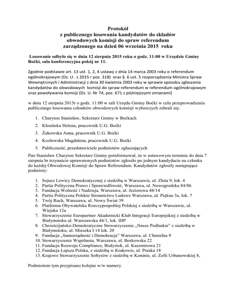 Protokół z publicznego losowania kandydatów do składów obwodowych komisji do spraw referendum zarządzonego na dzień 06 września 2015 roku Losowanie odbyło się w dniu 12 sierpnia 2015 roku o godz. 11:00 w Urzędzie Gminy Boćki, sala konferencyjna pokój nr 11. Zgodnie podstawie art. 13 ust. 1, 2, 4 ustawy z dnia 14 marca 2003 roku o referendum ogólnokrajowym (Dz. U. z 2015 r poz. 318) oraz § 6 ust. 5 rozporządzenia Ministra Spraw Wewnętrznych i Administracji z dnia 30 kwietnia 2003 roku w sprawie sposobu zgłaszania kandydatów do obwodowych komisji do spraw referendum w referendum ogólnokrajowym oraz powoływania komisji (Dz. U. Nr 74, poz. 671 z późniejszymi zmianami) w dniu 12 sierpnia 2015r o godz. 11:00 w sali Urzędu Gminy Boćki w celu przeprowadzenia publicznego losowania członków obwodowych komisji wyborczych zebrali się: 1. Charyton Stanisław, Sekretarz Gminy w Boćkach 2. Kłosińska Helena, pracownik U.G. Boćki 3. Żukowska Anna, pracownik U.G. Boćki 4. Kozłowska Magdalena, pracownik U.G. Boćki 5. Publiczność, przedstawiciele podmiotów zgłaszających Pan Stanisław Charyton Sekretarz Gminy poinformował, że w ustawowym terminie do dnia 7 sierpnia br trzynaście uprawnionych podmiotów zgłosiło po jednym kandydacie na członka do każdej Obwodowej Komisji do Spraw Referendum. Kandydatów zgłosiły następujące podmioty: Sojusz Lewicy Demokratycznej z siedzibą w Warszawie, ul. Złota 9, lok. 4 Partia Polityczna Prawo i Sprawiedliwość, Warszawa, ul. Nowogrodzka 84/86 Fundacja Wolność i Nadzieja, Warszawa, ul. Jeziorowa 48/14 Partia Polityczna Polskie Stronnictwo Ludowe Warszawa, ul. Piękna 3a, lok. 7 Twój Ruch, Warszawa, ul. Nowy Świat 39 Platforma Obywatelska Rzeczypospolitej Polskiej z siedzibą w Warszawie, ul. Wiejska 12a 7. Stowarzyszenie Europartner Akademicki Klub Integracji Europejskiej z siedzibą w Białymstoku ul. Warszawska 44/1, lok. IIIP 8. Chrześcijańsko-Demokratyczne Stowarzyszenie „Nasze Podlaskie” z siedzibą w Białymstoku, ul. Mieszka I 14 lok. 20 9. Fundacja „Samorządność i Demokracja” Warszawa, ul. Chmielna 9 10. Stowarzyszenie Wspólnota, Warszawa, ul. Borkowska 22 11. Fundacja Rozwoju Compliance, Białystok, ul. Kaszmirowa 21 12. Fundacja Lepsza Polska, z siedzibą w Krakowie, ul. Praska 18 13. Krajowe Stowarzyszenie Sołtysów z siedzibą w Koninie, ul. Zofii Urbanowskiej 8, 1. 2. 3. 4. 5. 6. Podmiotom tym przypisano kolejne w/w numery. Zgłoszenia kandydatów na członków obwodowych komisji do spraw referendum zostały zweryfikowane zgodnie z wymogami prawa w tym zakresie. Błędów nie stwierdzono. W związku z tym, że liczba prawidłowo zgłoszonych kandydatów jest większa od ustawowej liczby osób, które mogą być powołane w jej skład, komisja powoływana jest w największym dopuszczalnym składzie to jest 9-cio osobowym, a jej skład ustalany jest w trybie losowania. Losowanie członków komisji spośród kandydatów zgłoszonych do danej komisji dokonuje się odrębnie dla każdej komisji. W losowaniu uczestniczy po jednym kandydacie zgłoszonym przez każdego pełnomocnika. Nazwiska Kandydatów dla każdej komisji wyborczej oznaczone są numerami przypisanymi dla komitetów wyborczych. Do kopert wkładane są kartki z numerami odpowiadającymi numerom, którymi oznaczono nazwiska kandydatów. Po wymieszaniu kopert losowano 8 z nich. Ponieważ najwyższy skład komisji liczy 8 osób zgłoszonych przez uprawnione podmioty i jedna dziewiąta osoba wskazana przez Wójta Gminy. Odrębnie dla każdej komisji wylosowane numery odczytywano, okazywano obecnym przy losowaniu. Odczytywano również imiona i nazwiska kandydatów oznaczonych tymi numerami. 1. Spośród zgłoszonych 13 kandydatów do Obwodowej Komisji Wyborczej Nr 1 w Szkole Podstawowej w Andryjankach wylosowano 8 następujących osób: Lp Nazwisko i imię osoby wylosowanej Nazwa podmiotu zgłaszającego 1. Kozłowska Danuta zam. Bodki 2. Litewnicka Ewa zam. Andryjanki Chrześcijaosko-Demokratyczne Stowarzyszenie „Nasze Podlasie” Białystok, ul. Mieszka I 14 Fundacja Rozwoju Compliance Białystok, ul. Kaszmirowa 21 3. Odachowska Ewelina zam, Bodaczki Partia Polityczna Polskie Stronnictwo Ludowe Warszawa, ul. Piękna 3a 4. Ofman Wojciech Zam. Bodki Małyszczuk Katarzyna Gabriela Zam. Wygonowo Twój Ruch, Warszawa, ul Nowy Świat 39 6. Kozłowska Anna, zam. Andryjanki Krajowe Stowarzyszenie Sołtysów, Konin, ul. Zofii Urbanowskiej 8 7. Malinowski Wojciech Antoni zam. Bodki Stowarzyszenie Europartner Akademicki Klub Integracji Europejskiej Białystok, ul. Warszawska 44/1 8. Chodowiec Anna zam. Andryjanki Partia Polityczna Prawo i Sprawiedliwośd Warszawa, ul. Nowogrodzka 84/86 5. Fundacja Lepsza Polska, Kraków, ul. Praska 18 2. Spośród zgłoszonych 13 kandydatów do Obwodowej Komisji do Spraw Referendum Nr 2 w Gminnym Ośrodku Kultury w Boćkach wylosowano 8 następujących osób: Lp Nazwisko i imię osoby wylosowanej Nazwa podmiotu zgłaszającego 1. Kurowicka Agnieszka zam. Bodki Panasiuk Mateusz zam. Bodki Fundacja Wolnośd i Nadzieja, Warszawa, ul. Jeziorowa 48/14 Fundacja Lepsza Polska, Kraków, ul. Praska 18 3. Koc Walentyna zam. Bodki Fundacja Rozwoju Compliance Białystok, ul. Kaszmirowa 21 4. Laszuk Marta zam. Dubno Platforma Obywatelska Rzeczypospolitej Polskiej, Warszawa, ul. Wiejska 12a 5. Szczęch Anna zam. Bodki Stowarzyszenie Wspólnota, Warszawa, Ul. Borkowska 22 6. Popławska Diana zam. Bodki Fundacja Samorządnośd i Demokracja, Warszawa, ul. Chmielna 9 7. Jabłooski Łukasz zam. Bodki Partia Polityczna Prawo i Sprawiedliwośd Warszawa, ul. Nowogrodzka 84/86 8. Kosioska Karolina zam. Bodaki Partia Polityczna Polskie Stronnictwo Ludowe Warszawa, ul. Piękna 3a 2. 3. Spośród zgłoszonych 13 kandydatów do Obwodowej Komisji do Spraw Referendum Nr 3 w Wiejskim Domu Kultury w Nurcu wylosowano 8 następujących osób: Lp Nazwisko i imię osoby wylosowanej Nazwa podmiotu zgłaszającego 1. Chmur Michał, zam. Bodki