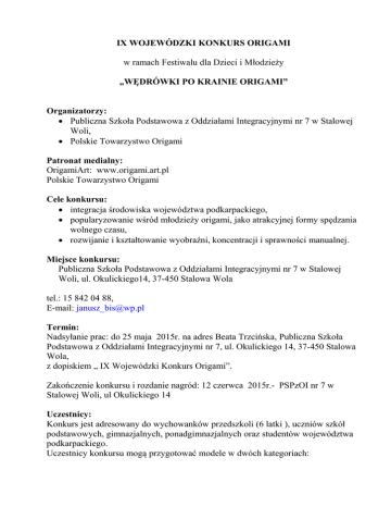 IX WOJEWÓDZKI KONKURS ORIGAMI w ramach Festiwalu dla Dzieci i Młodzieży „WĘDRÓWKI PO KRAINIE ORIGAMI” Organizatorzy: Publiczna Szkoła Podstawowa z Oddziałami Integracyjnymi nr 7 w Stalowej Woli, Polskie Towarzystwo Origami Patronat medialny: OrigamiArt: www.origami.art.pl Polskie Towarzystwo Origami Cele konkursu: integracja środowiska województwa podkarpackiego, popularyzowanie wśród młodzieży origami, jako atrakcyjnej formy spędzania wolnego czasu, rozwijanie i kształtowanie wyobraźni, koncentracji i sprawności manualnej. Miejsce konkursu: Publiczna Szkoła Podstawowa z Oddziałami Integracyjnymi nr 7 w Stalowej Woli, ul. Okulickiego14, 37-450 Stalowa Wola tel.: 15 842 04 88, E-mail: [email protected] Termin: Nadsyłanie prac: do 25 maja 2015r. na adres Beata Trzcińska, Publiczna Szkoła Podstawowa z Oddziałami Integracyjnymi nr 7, ul. Okulickiego 14, 37-450 Stalowa Wola, z dopiskiem „ IX Wojewódzki Konkurs Origami”. Zakończenie konkursu i rozdanie nagród: 12 czerwca 2015r.- PSPzOI nr 7 w Stalowej Woli, ul Okulickiego 14 Uczestnicy: Konkurs jest adresowany do wychowanków przedszkoli (6 latki ), uczniów szkół podstawowych, gimnazjalnych, ponadgimnazjalnych oraz studentów województwa podkarpackiego. Uczestnicy konkursu mogą przygotować modele w dwóch kategoriach: origami klasyczne (z jednej kartki papieru) oraz origami modułowe (z wielu kartek papieru). Warunki uczestnictwa: - własnoręczne złożenie modelu, - 1 osoba może przesłać lub dostarczyć na adres maksymalnie dwie prace, - do każdej pracy należy dołączyć wizytówkę o treści: 1. Tytuł pracy. 2. Imię i nazwisko autora /wykonawcy pracy. 3. Klasa. 4. Nazwa i adres szkoły. 5. Imię i nazwisko nauczyciela/opiekuna (telefon lub e-mail). Prace zbiorowe nie będą oceniane. Jury: W skład Jury wejdą plastycy oraz członkowie Polskiego Towarzystwa Origami. Jury dokonując oceny prac, kierować się będzie: - stopniem trudności wykonania modelu, - ciekawością pomysłu, - estetyką wykonania, - doborem kolorystyki. Prace będą oceniane w następujących kategoriach wiekowych: I przedszkola- 6 latki II szkoła podstawowa klasy 1-3 III szkoła podstawowa klasy 4-6 IV gimnazjum V szkoła ponadgimnazjalna VI studenci Wszystkie prace konkursowe zostaną wystawione w dniach 12-14 czerwca 2015r. w czasie trwania Festiwalu dla Dzieci i Młodzieży „WĘDRÓWKI PO KRAINIE ORIGAMI” w PSPzOI nr 7 ul. Okulickiego 14, 37-450 Stalowa Wola. Nie zwracamy prac konkursowych. Zwycięzcy otrzymają atrakcyjne nagrody rzeczowe i dyplomy, nauczyciele/opiekunowie – podziękowania. Serdecznie zapraszamy do udziału w konkursie. Koordynatorzy konkursu: Janusz Bis – PSPzOI nr 7 w Stalowej Woli, e-mail: [email protected] Beata Trzcińska — PSPzOI nr 7 w Stalowej Woli, e-mail: [email protected] Maria Bis – PSPzOI Nr 7 w Stalowej Woli, e-mail: [email protected]