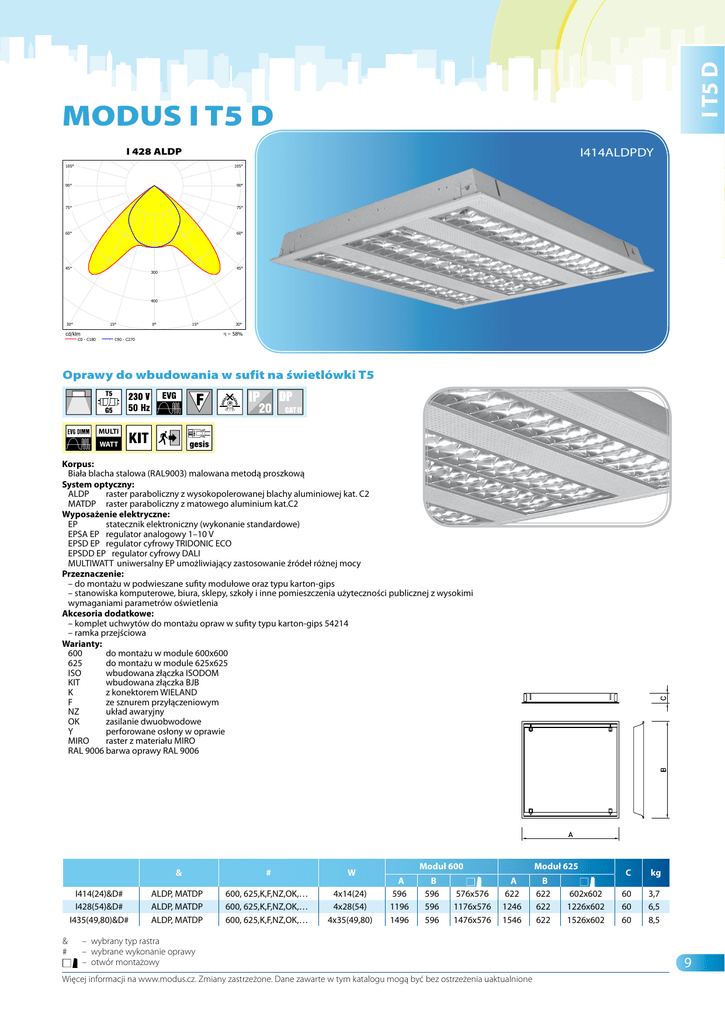 I T5 D rahumäe 6 20.01.2010 Zpracovatel Telefon Fax e-mail MODUS I T5 D C:\Documents and Settings\Milan nb-acer\Dokumenty\data wils\MODUS I 428 ALDP_ldt_161.ldt MODUS I 428 ALDP Zářivkové, ALDP mřížka, vestavné, T5 / LVK (Polárně) Svítidlo: C:\Documents and Settings\Milan nb-acer\Dokumenty\data wils\MODUS I 428 ALDP_ldt_161.ldt MODUS I 428 ALDP Zářivkové, ALDP mřížka, vestavné, T5 Zdroje:: 4 x FH 28 W/830 G5 28W I 428 ALDP 105° 105° 90° 90° 75° 75° 60° 60° 45° I414ALDPDY 45° 300 400 30° 15° cd/klm C0 - C180 0° 15° 30° 58% C90 - C270 Oprawy do wbudowania w sufit na świetlówki T5 DIALux 4.7 by DIAL GmbH Strana 1 MULTI WATT Korpus: Biała blacha stalowa (RAL9003) malowana metodą proszkową System optyczny: ALDP raster paraboliczny z wysokopolerowanej blachy aluminiowej kat. C2 MATDP raster paraboliczny z matowego aluminium kat.C2 Wyposażenie elektryczne: EP statecznik elektroniczny (wykonanie standardowe) EPSA EP regulator analogowy 1–10 V EPSD EP regulator cyfrowy TRIDONIC ECO EPSDD EP regulator cyfrowy DALI MULTIWATT uniwersalny EP umożliwiający zastosowanie źródeł różnej mocy Przeznaczenie: – do montażu w podwieszane sufity modułowe oraz typu karton-gips – stanowiska komputerowe, biura, sklepy, szkoły i inne pomieszczenia użyteczności publicznej z wysokimi wymaganiami parametrów oświetlenia Akcesoria dodatkowe: – komplet uchwytów do montażu opraw w sufity typu karton-gips 54214 – ramka przejściowa Warianty: 600 do montażu w module 600x600 625 do montażu w module 625x625 ISO wbudowana złączka ISODOM KIT wbudowana złączka BJB K z konektorem WIELAND F ze sznurem przyłączeniowym NZ układ awaryjny OK zasilanie dwuobwodowe Y perforowane osłony w oprawie MIRO raster z materiału MIRO RAL 9006barwa oprawy RAL 9006 I414(24)&D# I428(54)&D# I435(49,80)&D# & # W ALDP, MATDP ALDP, MATDP ALDP, MATDP 600, 625,K,F,NZ,OK,… 600, 625,K,F,NZ,OK,… 600, 625,K,F,NZ,OK,… 4x14(24) 4x28(54) 4x35(49,80) Moduł 600 A 596 1196 1496 B 596 596 596 576x576 1176x576 1476x576 Moduł 625 A 622 1246 1546 & – wybrany typ rastra # – wybrane wykonanie oprawy – otwór montażowy Więcej informacji na www.modus.cz. Zmiany zastrzeżone. Dane zawarte w tym katalogu mogą być bez ostrzeżenia uaktualnione B 622 622 622 602x602 1226x602 1526x602 C kg 60 60 60 3,7 6,5 8,5 9