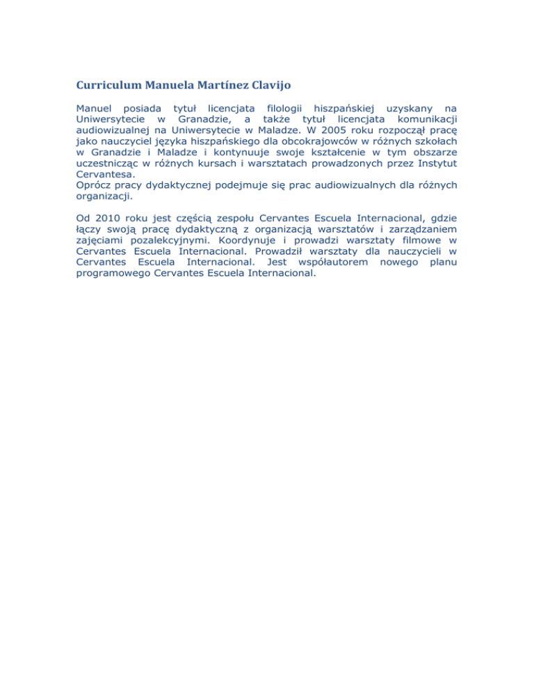 Curriculum Manuela Martínez Clavijo Manuel posiada tytuł licencjata filologii hiszpańskiej uzyskany na Uniwersytecie w Granadzie, a także tytuł licencjata komunikacji audiowizualnej na Uniwersytecie w Maladze. W 2005 roku rozpoczął pracę jako nauczyciel języka hiszpańskiego dla obcokrajowców w różnych szkołach w Granadzie i Maladze i kontynuuje swoje kształcenie w tym obszarze uczestnicząc w różnych kursach i warsztatach prowadzonych przez Instytut Cervantesa. Oprócz pracy dydaktycznej podejmuje się prac audiowizualnych dla różnych organizacji. Od 2010 roku jest częścią zespołu Cervantes Escuela Internacional, gdzie łączy swoją pracę dydaktyczną z organizacją warsztatów i zarządzaniem zajęciami pozalekcyjnymi. Koordynuje i prowadzi warsztaty filmowe w Cervantes Escuela Internacional. Prowadził warsztaty dla nauczycieli w Cervantes Escuela Internacional. Jest współautorem nowego planu programowego Cervantes Escuela Internacional.