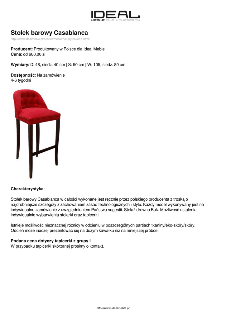 Stołek barowy Casablanca http://www.idealmeble.pl/pl/offer/meble/hokery/hoker-1.html/ Producent: Produkowany w Polsce dla Ideal Meble Cena: od 600.00 zł Wymiary: D: 48, siedz. 40 cm | S: 50 cm | W: 105, siedz. 80 cm Dostępność: Na zamówienie 4-6 tygodni Charakterystyka: Stołek barowy Casablanca w całości wykonane jest ręcznie przez polskiego producenta z troską o najdrobniejsze szczegóły z zachowaniem zasad technologicznych i stylu. Każdy model wykonywany jest na indywidualne zamówienie z uwzględnieniem Państwa sugestii. Stelaż drewno Buk. Możliwość ustalenia indywidualnie wybarwienia stolarki oraz tapicerki. Istnieje możliwość nieznacznej różnicy w odcieniu w poszczególnych partiach tkaniny/eko-skóry/skóry. Odcień może inaczej prezentować się na dużym kawałku niż na mniejszej próbce. Podana cena dotyczy tapicerki z grupy I W przypadku tapicerki skórzanej prosimy o kontakt. http://www.idealmeble.pl Dostępne wersje produktu: nazwa produktu Stołek barowy Casablanca warianty Tapicerka gr I materiał, tkanina, plusz cena 600.00zł dostępne 4-6 tygodni Stołek barowy Casablanca Tapicerka gr II materiał, tkanina, plusz 770.00zł 4-6 tygodni Stołek barowy Casablanca Tapicerka gr III materiał, tkanina, plusz 880.00zł 4-6 tygodni http://www.idealmeble.pl Zdjęcia produktu: http://www.idealmeble.pl Powered by TCPDF (www.tcpdf.org)