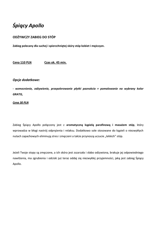 Śpiący Apollo ODŻYWCZY ZABIEG DO STÓP Zabieg polecany dla suchej i spierzchniętej skóry stóp kobiet i mężczyzn. Cena 110 PLN Czas ok. 45 min. Opcje dodatkowe: - wzmocnienie, odżywienie, przepolerowanie płytki paznokcia + pomalowanie na wybrany kolor GRATIS, Cena 30 PLN Zabieg Śpiący Apollo połączony jest z aromatyczną kąpielą parafinową i masażem stóp, który wprowadza w błogi nastrój odprężenia i relaksu. Dodatkowo sole stosowane do kąpieli o niezwykłych nutach zapachowych eliminują stres i zmęczeni a także przynoszą uczucie „lekkich” stóp. Jeżeli Twoje stopy są zmęczone, a ich skóra jest zszarzała i słabo odżywiona, brakuje jej odpowiedniego nawilżenia, ma zgrubienia i odciski już teraz oddaj się niezwykłej przyjemności, jaką jest zabieg Śpiący Apollo.