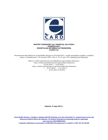 RAPORT OKRESOWY ZA I KWARTAŁ 2014 ROKU ZAWIERAJĄCY KWARTALNĄ INFORMACJĘ FINANSOWĄ eCARD S.A. Prezentowane dane finansowe eCard Spółka Akcyjna za I kwartał 2014 r. zostały sporządzone zgodnie z zasadami ustawy o rachunkowości z 29 września 1994 r. (Dz. U. Nr 121 poz. 591 z późniejszymi zmianami). Okresy, za które prezentowane jest jednostkowe sprawozdanie finansowe: - okres, za który prezentowane jest sprawozdanie finansowe: • 01.01.2014 r. – 31.03.2014 r. - okres, za który prezentowane są porównywalne dane finansowe: • 01.01.2013 r. – 31.12.2013 r. • 01.01.2013-31.03.2013 Gdańsk, 9 maja 2014 r. eCard Spółka Akcyjna z siedzibą w Gdańsku (80-387 Gdańsk), przy ulicy Arkońskiej 11, zarejestrowana przez Sąd Rejonowy Gdańsk-Północ dla Gdańska, VII Wydział Gospodarczy Krajowego Rejestru Sądowego pod numerem KRS 0000042304, o kapitale zakładowym wynoszącym 16 840 000 PLN (wpłaconym w całości), nr NIP: 521-31-03-040 I. 1. WSTĘP – PODSTAWOWE INFORMACJE O SPÓŁCE Dane teleadresowe: Nazwa (firma): Adres siedziby: Telefon: Fax: Adres korespondencyjny: Telefon: Fax: Poczta elektroniczna: Strona internetowa: 2. eCard S.A. ul. Arkońska 11, 80-387 Gdańsk (+48 58) 511 20 00 (+48 58) 511 20 01 ul. Czackiego 7/9/11, 00-043 Warszawa (+48 22) 493 44 90 (+48 22) 493 44 00 [email protected] www.ecard.pl Skład Rady Nadzorczej: W okresie sprawozdawczym, tj. 01.01.2014 r. - 31.03.2014 r., Rada Nadzorcza Emitenta pracowała w następującym składzie: Grzegorz Bierecki – Przewodniczący Rady Nadzorczej, Grzegorz Buczkowski – Wiceprzewodniczący Rady Nadzorczej, Agnieszka Zielińska-Kułaga – Sekretarz Rady Nadzorczej, Andrzej Sosnowski – Członek Rady Nadzorczej, Mariusz Bogusz – Członek Rady Nadzorczej. Na dzień sporządzenia raportu, tj. 9 maja 2014 roku, skład Rady Nadzorczej Emitenta nie uległ zmianie. 3. Skład Zarządu: W okresie sprawozdawczym, tj. 01.01.2014 r. - 31.03.2014 r., Zarząd Emitenta pracował w następującym składzie: Ewa Bereśniewicz-Kozłowska – Prezes Zarządu, Tomasz Krasiński – Wiceprezes Zarządu, Alicja Kuran-Kawka – Członek Zarządu. Na dzień sporządzenia raportu, tj. 9 maja 2014 roku, skład Zarządu Emitenta nie uległ zmianie. II. INFORMACJA DODATKOWA 1. Opis stosowanych zasad rachunkowości. Stosowane przez Emitenta zasady rachunkowości opisane zostały w informacji dodatkowej do sprawozdania finansowego za 2013 rok i w I kwartale 2014 r. nie uległy zmianie. Sprawozdanie finansowe za I kwartał 2014 roku zostało sporządzone zgodnie z Ustawą o rachunkowości z dnia 29 września 1994 roku z późn. zmianami oraz w oparciu o Rozporządzenie Ministra Finansów z dnia 19 lutego 2009 roku w sprawie informacji bieżących i okresowych przekazywanych przez emitentów papierów wartościowych oraz warunków uznawania za równoważne informacji wymaganych przepisami prawa państwa niebędącego państwem członkowskim. W raportowanym okresie nie wystąpiły istotne zmiany wielkości szacunkowych. 2. Zwięzły opis istotnych dokonań lub niepowodzeń emitenta w okresie, którego dotyczy raport, wraz z wykazem najważniejszych zdarzeń ich dotyczących. W I kwartale 2014 roku wygenerowana przez Emitenta wartość przychodów ze sprzedaży wyniosła 10 495 tys. zł i w stosunku do analogicznego kwartału roku poprzedniego nieznacznie się zmniejszyła (spadek o 2,13%). 2 Struktura przychodów ze sprzedaży (w tys. zł) I kw. 2014 Obsługa e-commerce Obsługa terminali POS Sprzedaż doładowań telefonów i SMS Premium Pozostałe usługi Razem I kw. 2013 7 284 519 2 669 23 10 495 7 369 327 2 983 44 10 723 W I kwartale 2014 roku Emitent zanotował stratę netto w wysokości 317 tys. zł. Wpływ na to miały: zanotowana strata na sprzedaży wynikająca głównie z rozwijanej działalności terminali POS oraz presji obniżania prowizji przychodowych z tytułu obsługiwanych transakcji bezgotówkowych, wywołanej spodziewaną od II połowy 2014 roku zmianą kosztowych stawek interchange fee; ujemne saldo z działalności finansowej, w tym obsługa długu i ujemne różnice kursowe wynikające z przewalutowań obsługiwanych transakcji e-commerce. Zarząd Spółki podejmuje działania zmierzające do zminimalizowania ryzyka walutowego w tym obszarze, poprzez zmianę waluty rozliczeniowej z międzynarodowymi instytucjami płatniczymi na polski złoty. Struktura wyniku finansowego netto (w tys. zł) I kw. 2014 Zysk (strata) ze sprzedaży Saldo z pozostałej dział. operacyjnej Saldo z działalności finansowej Wynik netto 3. I kw. 2013 -149 7 -175 -317 205 0 -65 140 Opis czynników i zdarzeń, w szczególności o nietypowym charakterze, mających znaczący wpływ na osiągnięte wyniki finansowe. W opinii Zarządu Emitenta w raportowanym okresie nie wystąpiły czynniki i zdarzenia o nietypowym charakterze, mające znaczący wpływ na osiągnięte wyniki finansowe, a które nie zostałyby opisane w niniejszym raporcie. 4. Objaśnienia dotyczące prezentowanym okresie. sezonowości lub cykliczności działalności emitenta w Emitent nie prowadzi działalności sezonowej czy cyklicznej. 5. Informacje o odpisach aktualizujących wartość zapasów do wartości netto możliwej do uzyskania i odwróceniu odpisów z tego tytułu. Odpisy aktualizujące wartość zapasów nie występują. 6. Informacje o odpisach aktualizujących z tytułu utraty wartości aktywów finansowych, rzeczowych aktywów trwałych, wartości niematerialnych i prawnych lub innych aktywów oraz odwróceniu takich odpisów. Nie zaistniała potrzeba utworzenia odpisów aktualizujących. 7. Informacje o utworzeniu, zwiększeniu, wykorzystaniu i rozwiązaniu rezerw. Wykorzystano rezerwę na koszty badania bilansu za 2013 rok w kwocie 10 tys. zł. Utworzono rezerwę w kwocie 3 tys. zł na przegląd półroczny bilansu na dzień 30 czerwca 2014 roku. 3 8. Informacje o rezerwach i aktywach z tytułu odroczonego podatku dochodowego. Spółka odstąpiła od ust