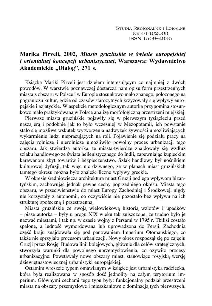 Studia Regionalne i Lokalne Nr 4(14)/2003 ISSN 1509–4995 Marika Pirveli, 2002, Miasto gruzińskie w świetle europejskiej i orientalnej koncepcji urbanistycznej, Warszawa: Wydawnictwo Akademickie „Dialog”, 271 s. Ksia˛żka Mariki Pirveli jest dziełem interesuja˛cym co najmniej z dwóch powodów. W warstwie poznawczej dostarcza nam opisu form przestrzennych miasta z obszaru w Polsce i w Europie stosunkowo mało znanego, położonego na pograniczu kultur, gdzie od czasów starożytnych krzyżowały sie˛ wpływy europejskie i azjatyckie. W aspekcie metodologicznym autorka przypomina stosunkowo mało praktykowana˛ w Polsce analize˛ morfologiczna˛ przestrzeni miejskiej. Pierwsze miasta gruzińskie pojawiły sie˛ w pierwszym tysia˛cleciu przed nasza˛ era˛ i podobnie jak to było wcześniej w Mezopotamii, ich powstanie stało sie˛ możliwe wskutek wytworzenia nadwyżek żywności umożliwiaja˛cych wykarmienie ludzi niepracuja˛cych na roli. Pojawienie sie˛ podziału pracy na zaje˛cia rolnicze i nierolnicze umożliwiło powolny proces urbanizacji tego obszaru. Jak stwierdza autorka, te miasta-twierdze znajdowały sie˛ wzdłuż szlaku handlowego ze świata hellenistycznego do Indii, zapewniaja˛c kupieckim karawanom zbyt towarów i bezpieczeństwo. Szlak handlowy był nośnikiem kulturowej dyfuzji, tak wie˛c nic dziwnego, że w planach miast gruzińskich tamtego okresu można było znaleźć liczne wpływy greckie. W okresie średniowiecza architektura miast Gruzji podlega wpływom bizantyńskim, zachowuja˛c jednak pewne cechy poprzedniego okresu. Miasta tego obszaru, w przeciwieństwie do miast Europy Zachodniej i Środkowej, nigdy nie korzystały z autonomii, co oczywiście nie pozostało bez wpływu na ich strukture˛ społeczna˛ i przestrzenna˛. Miasta gruzińskie ze swoja˛ wielowiekowa˛ historia˛ wzlotów i upadków – pisze autorka – były u progu XIX wieku tak zniszczone, że trudno było je nazwać miastami, i tak np. w czasie wojny z Persami w 1795 r. Tbilisi zostało spalone, a ludność wymordowana lub uprowadzona do Persji. Zachodnia cze˛ść kraju znajdowała sie˛ pod panowaniem Imperium Otomańskiego, co także nie sprzyjało procesom urbanizacji. Nowy okres rozpocza˛ł sie˛ po zaje˛ciu Gruzji przez Rosje˛. Budowa linii kolejowych, głównie dla celów strategicznych, stworzyła warunki dla powolnego uprzemysłowienia, co ożywiło procesy urbanizacyjne. Powstawały nowe obszary miast, stanowia˛ce rosyjska˛ wersje˛ dziewie˛tnastowiecznej urbanistyki europejskiej. Ostatnim wreszcie typem omawianym w ksia˛żce jest urbanistyka radziecka, która była realizowana w sposób dość jednolity na całym terytorium imperium. Głównymi cechami tego typu były: funkcjonalny podział przestrzeni miasta na obszary przemysłowe i mieszkaniowe z dominacja˛ tych pierwszych, 150 RECENZJE ograniczenie usług do niezbe˛dnego minimum i prawie zupełny brak funkcji centralnych, których jedynym wyrazem były budynki administracji państwowej. Urbanistyka ta nie była jednak wynalazkiem, który powstał w ZSRR, ponieważ była to w istocie uproszczona wersja koncepcji miasta opracowanej w środowisku europejskich architektów – urbanistów skupionych w organizacji pod nazwa˛ Congrès Internationaux d’Architecture Moderne (CIAM). Autorka wydaje sie˛ wie˛c przeceniać swoistość radzieckiej urbanistyki i architektury. I tak np. przestrzenne oddzielenie miejsc zamieszkania i pracy było powszechnie stosowana˛ zasada˛ projektowania urbanistycznego, a mikrorejon to nic innego jak trawestacja powstałej w kre˛gu anglosaskim koncepcji jednostki sa˛siedzkiej. Także architekture˛ tzw. socrealizmu można zobaczyć w licznych wydaniach w wielu miastach francuskich, np. w Marsylii, St. Dié czy Hawrze. Jak widać z tego krótkiego przegla˛du, Marika Pirveli analizuje miasto gruzińskie na tle szerokiej panoramy historii miast europejskich od średniowiecza po czasy nam współczesne. Ksia˛żka nie jest jednak w ścisłym tego słowa znaczeniu historia˛ miasta, ponieważ autorka zajmuje sie˛ przede wszystkim ewolucja˛ form przestrzennych i ich zwia˛zkiem z określonymi funkcjami. Praca wpisuje sie˛ wie˛c w nurt analizy morfologicznej, który w polskiej geografii jest stosunkowo słabo obecny. Przypomnienie tej metody analizy miasta jest kolejna˛ zasługa˛ Pirveli. Badania morfologiczne – jak pisze autorka, powołuja˛c sie˛ na brytyjskiego geografa pochodzenia niemieckiego M.R.G. Conzena – zajmuje sie˛ zewne˛trzna˛ i wewne˛trzna˛ budowa˛ form urbanistycznych w uje˛ciu historycznym, uwzgle˛dniaja˛c jednocześnie uwarunkowania i procesy je kształtuja˛ce. Badania zaliczane do geografii miast maja˛ jednak charakter interdyscyplinarny, gdyż odwołuja˛ sie˛ do historii, architektury i urbanistyki. Pirveli wyróżnia aktualnie kilka szkół badań morfologicznych miast, które niezależnie od dziela˛cych je różnic maja˛, zdaniem autorki, kilka cech wspólnych. Przedmiotem badań morfologicznych sa˛ formy urbanistyczne, pocza˛wszy od poziomu działki budowlanej, przez tzw. blok urbanistyczny, ulice˛, dzielnice˛ aż do całego miasta. Wie˛ kszość badaczy bierze pod uwage˛ czas jako ważna˛ zmienna˛, wreszcie bardzo istotnym czynnikiem sa˛ uwarunkowania określaja˛ce dane jednostki morfologicznej. Conzen np. przypisuje określone formy urbanistyczne do konkretnych procesów gospodarczych i społecznych. Zakłada on bowiem nierozła˛czność formy i funkcji w tym samym czasie, choć w różnych miejscach. Ksia˛żka Mariki Pirveli dostarcza także bardzo interesuja˛cych i w Polsce dotychczas nieznanych materiałów ikonograficznych – map, rycin i fotografii miast pochodza˛cych z archiwów gruzińskich, które sa˛ nie tylko podstawa˛ analizy autorki, ale także przybliżaja˛ nam obraz stosunkowo mało znanego obszaru kulturowego. Podsumowuja˛c, należy stwierdzić, że mamy do czynienia z praca˛ oryginalna˛, dosk