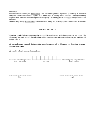 Informacja Niniejsze oświadczenie jest dobrowolne i ma na celu uzyskanie zgody na publikację w internecie fotografii członka samorządu. Zgoda taka może być w każdej chwili cofnięta. Więcej informacji znajduje się w serwisie internetowym Naczelnej Izby Lekarskiej (www.nil.org.pl) w części dotyczącej rejestrów. Podpis należy złożyć w obecności pracownika OIL, który ma prawo poprosić o dokument tożsamości. Oświadczenie Wyrażam zgodę / nie wyrażam zgody na opublikowanie w serwisie internetowym Naczelnej Izby Lekarskiej (www.nil.org.pl), łącznie z innymi już zamieszczonymi danymi dotyczącymi mojej osoby, mojego zdjęcia ☐ pochodzącego z moich dokumentów przechowywanych w Okręgowym Rejestrze Lekarzy i Lekarzy Dentystów ☐ prześlę zdjęcie pocztą elektroniczną ……..…………………………. imię i nazwisko ……………………………… data nr pwz ……..…………………………. data i podpis ………………………………. podpis