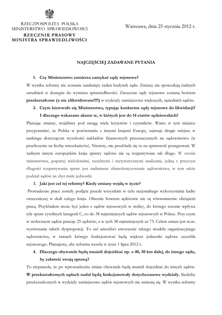 RZECZPOSPOLITA POLSKA MINISTERSTWO SPRAWIEDLIWOŚCI RZECZNIK PRASOWY MINISTRA SPRAWIEDLIWOŚCI Warszawa, dnia 25 stycznia 2012 r. NAJCZĘŚCIEJ ZADAWANE PYTANIA 1. Czy Ministerstwo zamierza zamykać sądy rejonowe? W wyniku reformy nie zostanie zamknięty żaden budynek sądu. Zmiany nie spowodują żadnych utrudnień w dostępie do wymiaru sprawiedliwości. Znoszone sądy rejonowe zostaną bowiem przekształcone (a nie zlikwidowane!!!!) w wydziały zamiejscowe większych, sąsiednich sądów. 2. Czym kierowało się Ministerstwo, typując konkretne sądy rejonowe do likwidacji? I dlaczego wskazano akurat te, w których jest do 14 etatów sędziowskich? Planując zmiany, wzięliśmy pod uwagę wiele kryteriów i czynników. Warto w tym miejscu przypomnieć, że Polska w porównaniu z innymi krajami Europy, zajmuje drugie miejsce w rankingu dotyczącym wysokości nakładów finansowych przeznaczanych na sądownictwo (w przeliczeniu na liczbę mieszkańców). Niestety, nie przekłada się to na sprawność postępowań. W żadnym innym europejskim kraju sprawy sądowe nie są rozpatrywane tak długo. W ocenie ministerstwa, popartej wieloletnimi, rzetelnymi i merytorycznymi analizami, jedną z przyczyn długości rozpatrywania spraw jest nadmierne zbiurokratyzowanie sądownictwa, w tym także podział sądów na zbyt małe jednostki. 3. Jaki jest cel tej reformy? Kiedy zmiany wejdą w życie? Prowadzone prace zostały podjęte przede wszystkim w celu racjonalnego wykorzystania kadry orzeczniczej w skali całego kraju. Obecnie bowiem sędziowie nie są równomiernie obciążeni pracą. Przykładem może być jeden z sądów rejonowych w stolicy, do którego rocznie wpływa tyle spraw cywilnych kategorii C, co do 38 najmniejszych sądów rejonowych w Polsce. Przy czym w stołecznym sądzie pracuje 25 sędziów, a w tych 38 najmniejszych aż 73. Celem zmian jest m.in. wyrównanie takich dysproporcji. To zaś umożliwi stworzenie takiego modelu organizacyjnego sądownictwa, w ramach którego funkcjonować będą większe jednostki sądowe szczebla rejonowego. Planujemy, aby reforma weszła w życie 1 lipca 2012 r. 4. Dlaczego obywatele będą musieli dojeżdżać np. o 40, 50 km dalej, do innego sądu, by załatwić swoją sprawę? To nieprawda, że po wprowadzeniu zmian obywatele będą musieli dojeżdżać do innych sądów. W przekształconych sądach nadal będą funkcjonowały dotychczasowe wydziały. Siedziby przekształconych w wydziały zamiejscowe sądów rejonowych nie zmienią się. W wyniku reformy 2 nie zostanie zamknięty żaden sąd. Obywatele będą mogli jak dotąd załatwić sprawy od ręki, w tym samym miejscu, co dotychczas. 5. Czy oszczędności były nadrzędnym celem przyświecającym tej reformie? Poszukiwanie oszczędności w budżecie resortu sprawiedliwości nie stanowiło decydującej przesłanki dla podjęcia omawianych działań. Nie chodzi bowiem o szukanie oszczędności, ale o usprawnienie funkcjonowania sądów. 6. Czy będzie likwidowana administracja sądowa, biura podawcze, kasy? Pracownicy administracyjni staną się pracownikami macierzystych sądów rejonowych, w strukturze których funkcjonować będą wydziały zamiejscowe. Po wejściu w życie zaplanowanych zmian nie będzie przeszkód, aby w przekształconych w wydziały zamiejscowe sądach rejonowych działały biura podawcze, czy np. kasy. 7. Czy pozostaną wydziały ksiąg wieczystych? Reforma nie obejmuje wydziałów ksiąg wieczystych! Pozostaną one bez zmian, w tych miejscowościach, w których działają dotychczas. 8. Czy w tych miastach gdzie będą znoszone sądy pozostaną prokuratury? Przygotowana w Ministerstwie Sprawiedliwości reorganizacja sądownictwa powszechnego nie jest tożsama, ani nawet połączona z reorganizacją jednostek organizacyjnych prokuratury. Ewentualne zmiany dotyczące znoszenia niektórych prokuratur zależeć będą od decyzji niezależnego od Ministra Sprawiedliwości Prokuratora Generalnego. 9. Czy w nowopowstałych wydziałach zamiejscowych pozostaną ich przewodniczący? Tak, przewodniczący wydziałów pozostaną i będą wykonywać nałożone na nich obowiązki. 10. Czy zaplanowane przez resort zmiany są wstępem do zmian na mapie administracyjnej kraju, czyli np. do likwidacji powiatów? W Ministerstwie Sprawiedliwości, ani w żadnym innym resorcie nie trwają prace nad likwidacją powiatów. Łączenie reformy sądownictwa z podejrzeniami przeprowadzenia reformy administracyjnej jest bezzasadne. 11. Czy zaplanowana reorganizacja jest celowym ominięciem przepisów Konstytucji RP, a dokładnie jej zapisów dotyczących zakazu przenoszenia sędziów bez ich zgody w inne miejsce pracy? Wszystkie powstające w Ministerstwie Sprawiedliwości projekty przygotowywane są w poszanowaniu konstytucyjnych zasad. W przypadku reorganizacji tym o czym nie mogliśmy zapomnieć to wartości niezależności i niezawisłości sędziów. 3 12. Prezesi mniejszych sądów twierdzą, że czas rozpatrywania postępowań jest krótszy właśnie w mniej licznych jednostkach organizacyjnych. Istnieją obawy, że reorganizacja ten czas wydłuży. I gdzie ta efektywność? Czas orzekania jest krótszy, bo małe sądy rozpatrują mniejszą liczbę spraw o mniej skomplikowanym charakterze. Obłożenie pracą poszczególnych sądów jest nierównomierne. Zmiany mają służyć pełnemu wykorzystaniu potencjału sędziów w skali całego kraju. 13. Jak reorganizacja wpłynie na liczbę innych etatów sędziowskich? Liczba etatów sędziowskich pozostanie bez zmian. Zmniejszy się natomiast liczba sędziów pełniących funkcje prezesów sądów. 14. Czy MS weźmie pod rozwagę opinie samorządowców? Minister Sprawiedliwości sam wyszedł z inicjatywą rozmów z przedstawicielami samorządów terytorialnych. W trakcie spotkań przedstawiciele resortu szczegółowo informowali o planowanych zmianach. Nadal trwają konsultacje z prezesami sądów. Przeprowadzenie reformy jest przesądzo